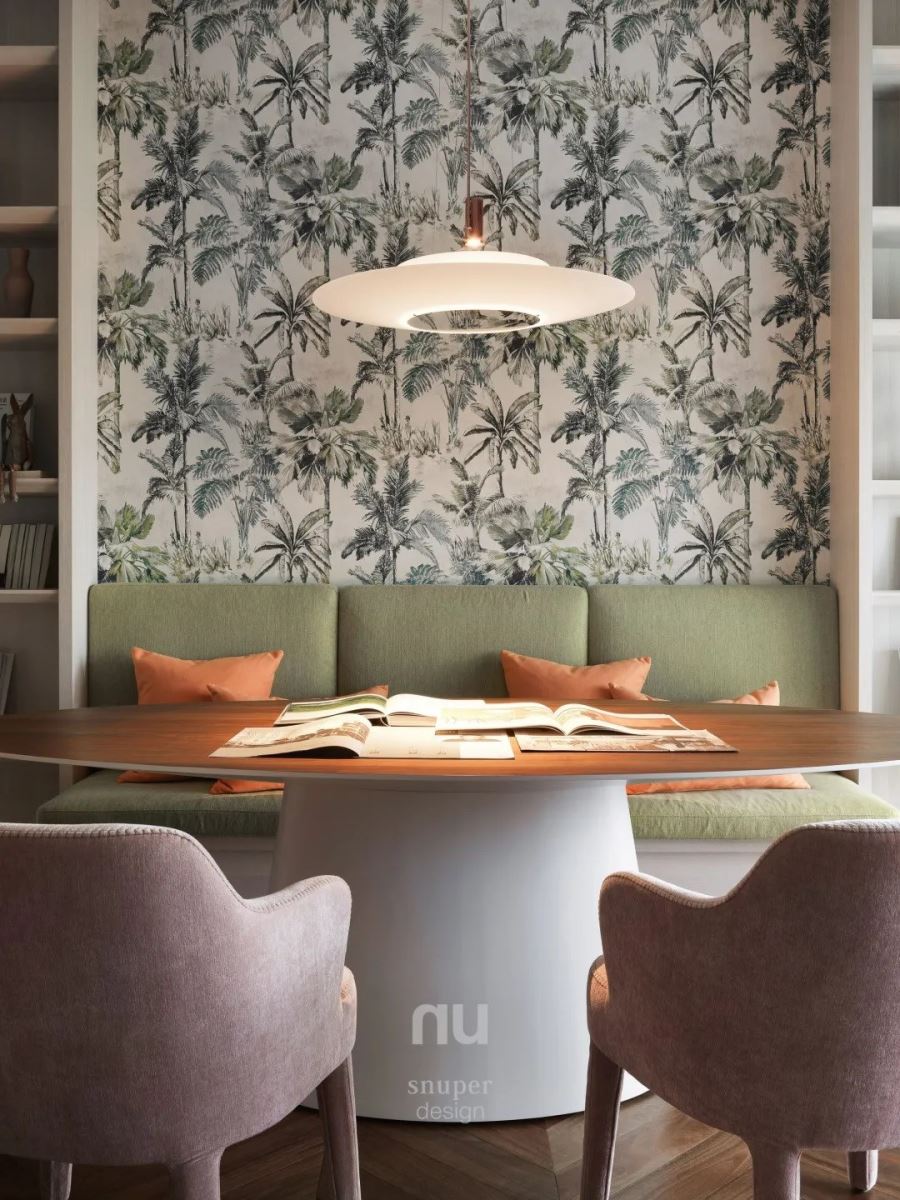 窗外绿意正盛、光影撩人,在窗边的卡座后方,选择了绿意盎然的自然草植壁纸为主视觉,一旁正是宽敞的露台,弥合了自然与人居的界限,让这个区域是耐读的、充满诗意的。