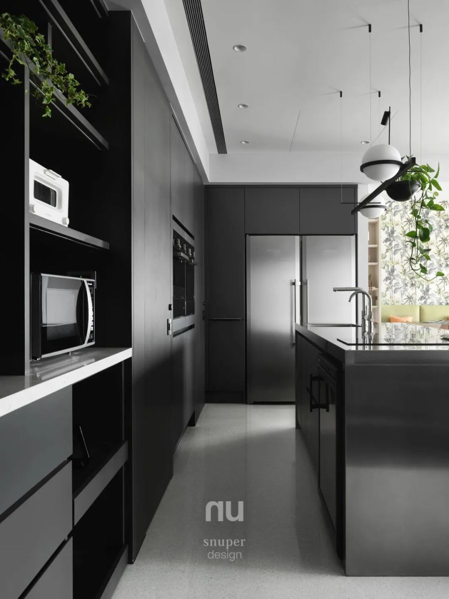 沉浸于自己下厨动刀的快乐,品味认真面对每一样得来不易的食材,对喜欢做菜的人来说,越是麻烦的菜越疗愈。 与客厅相邻的厨房,跳脱沉静而柔韧的木质色系及灰阶,厨房选用深墨色的雾面材质为主视觉,电器柜后方则运用光滑面的铁道砖,不同材质一前一后、撩动立面层次。