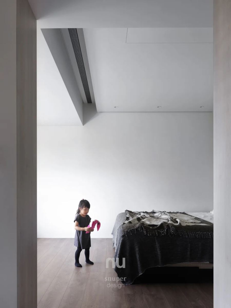 白与深色的木质地板,床区简单的两种材料、两种颜色,不动声色地调节着情感,也铺构出生活的可能性。