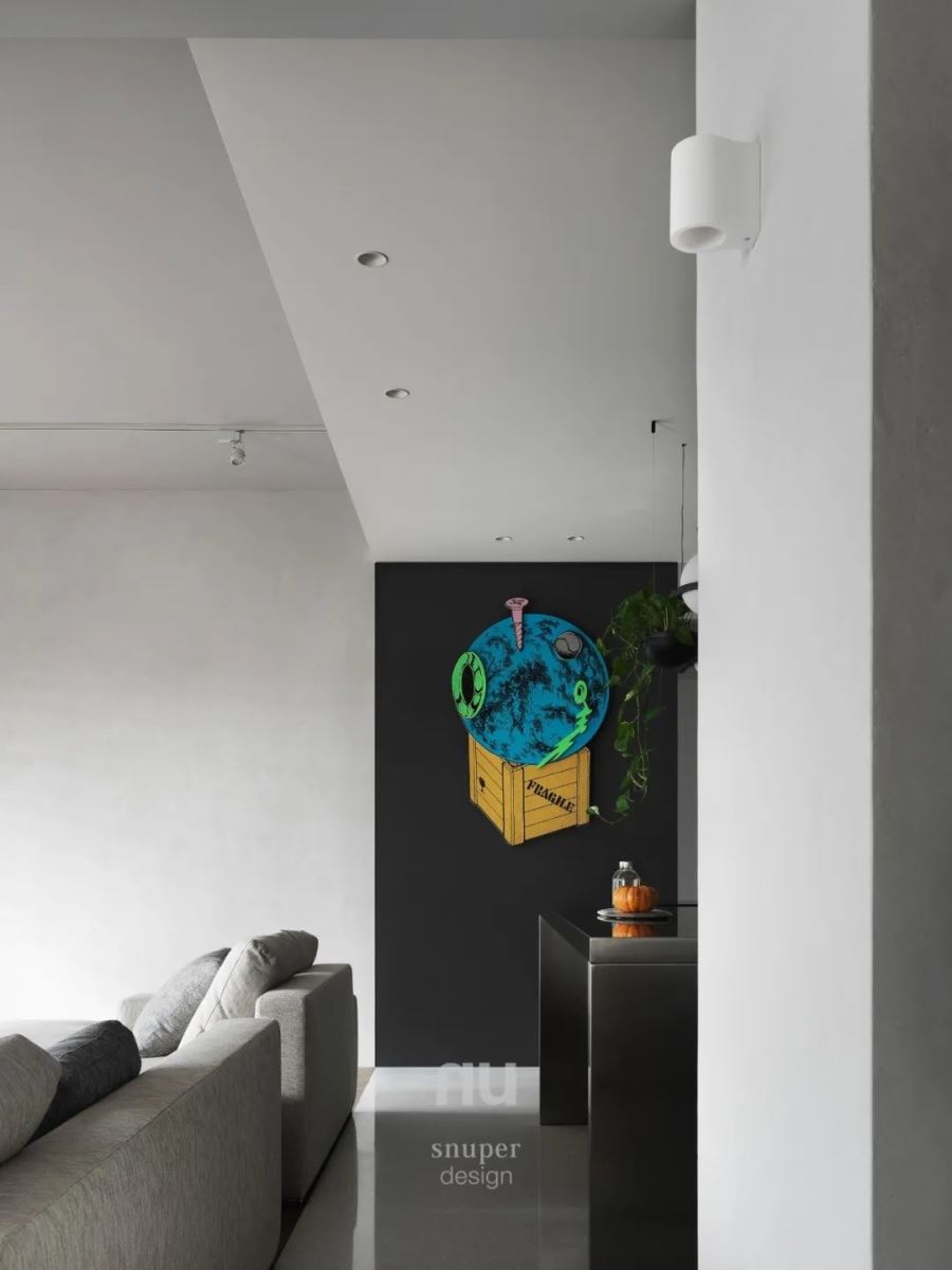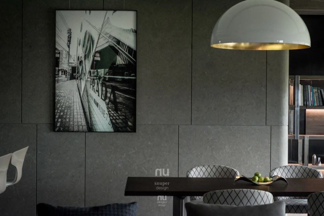 1. 尺度 简单是复杂的极致。餐厅区域用朴实灰色的大块石材与线条的切割勾勒出硬朗与秩序,而在这秩序中光线起到了很好的柔化作用,与艺术作品碰撞出平衡,传递出独特性格。