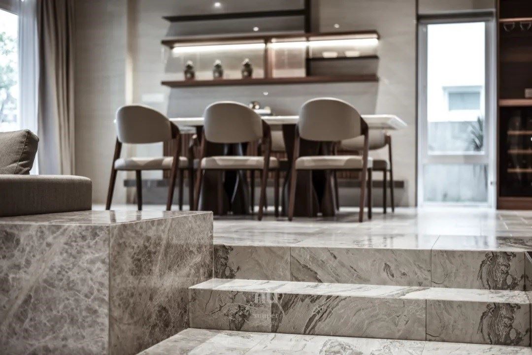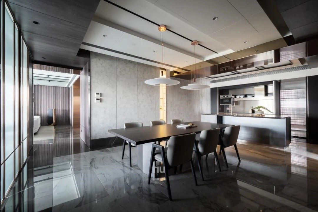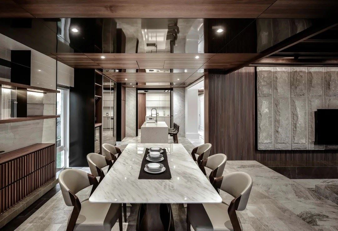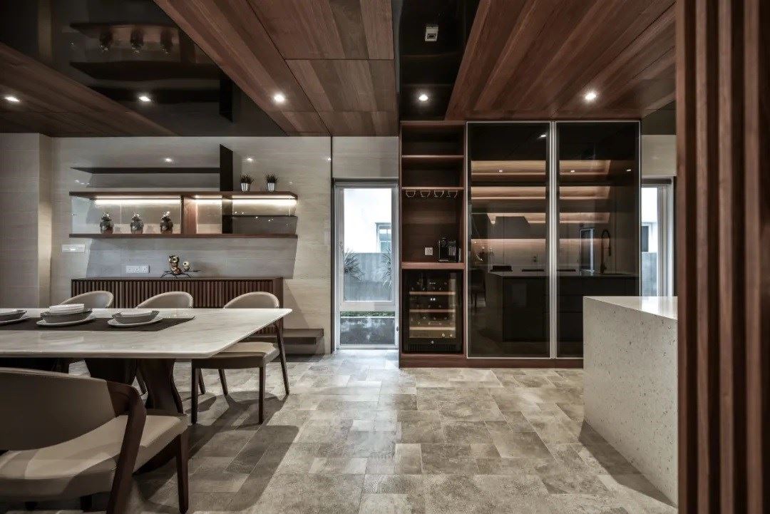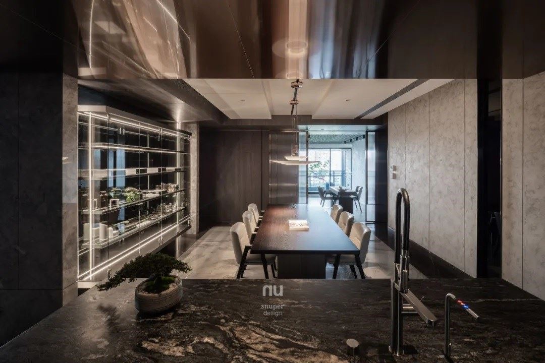 随着家主的生活需求,餐厅区域位于此项目的中心,需穿过玄关、客厅后才能抵达,像是过去四合院般的层层递进,不再是大平层的规划,但却不因此压缩尺度,反而造就尊荣与隐密感,仅有真正与家主要好的亲友,才能踏入这私隐之地。