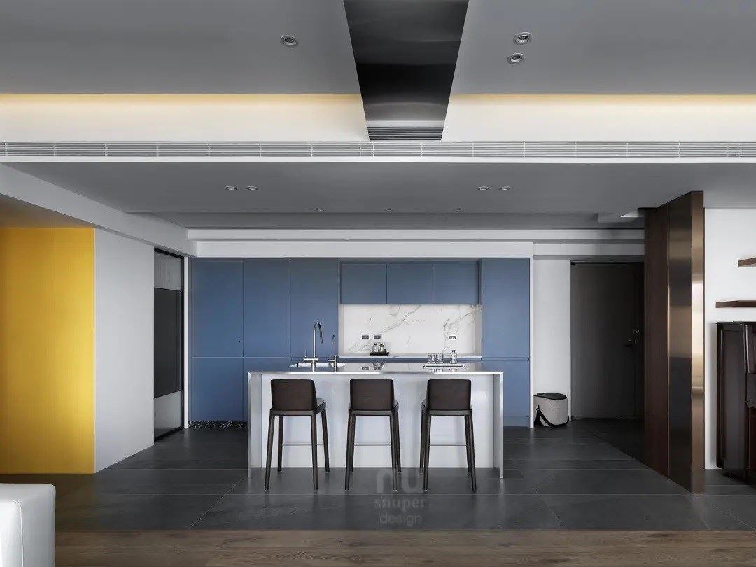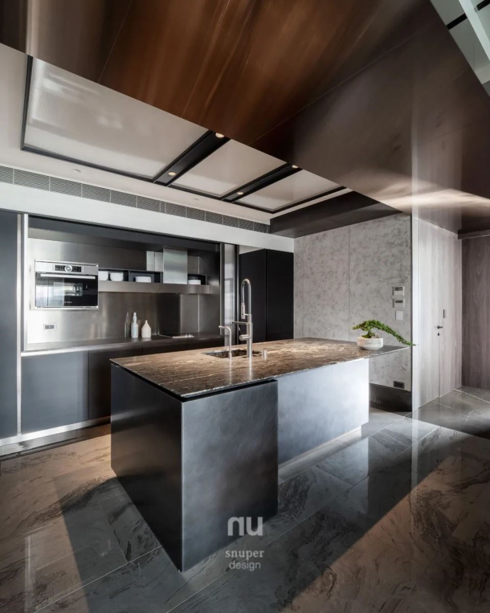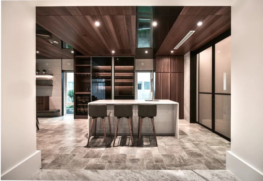 转折入内则是主人的开放餐厨空间,这里是家的中心、与孩子宾客交流的地方,在这里有完善的烤箱、烹调设备、内外厨房和酒窖设计,可以邀请私厨来家里进行顶级料理的烹调,让厨房与餐厅成为道地道地的社交场所。