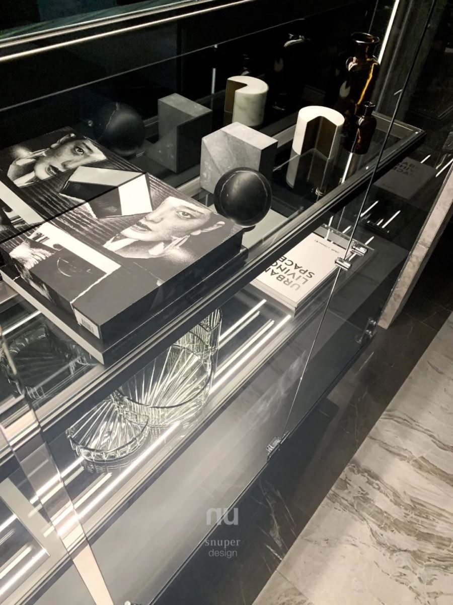 3. 收藏 将旅行的体验,浓缩为最纯粹的形式美学。选用意大利精品厨具 Boffi,花岗岩纹理搭配金属漆面,粗犷中带有细腻味道。悬浮的透明展示盒子,量体排列出舒适的视觉比例,搭配轻盈的 Vibia 吊灯,从高低天花的线条至对象的收藏,赋予餐宴区全新面貌。