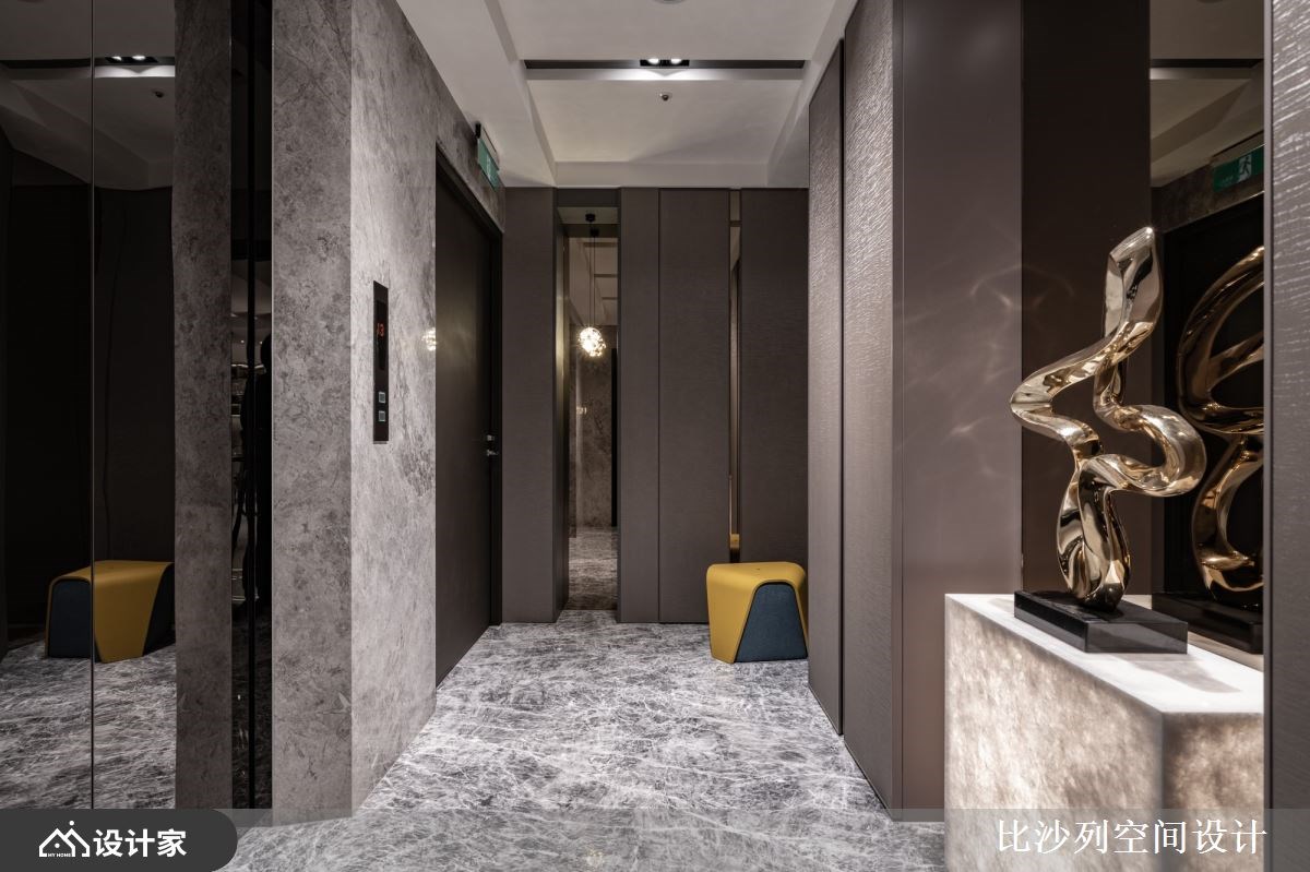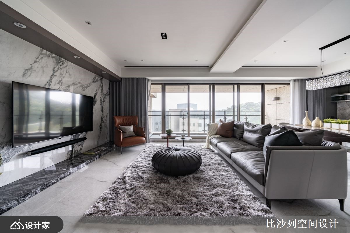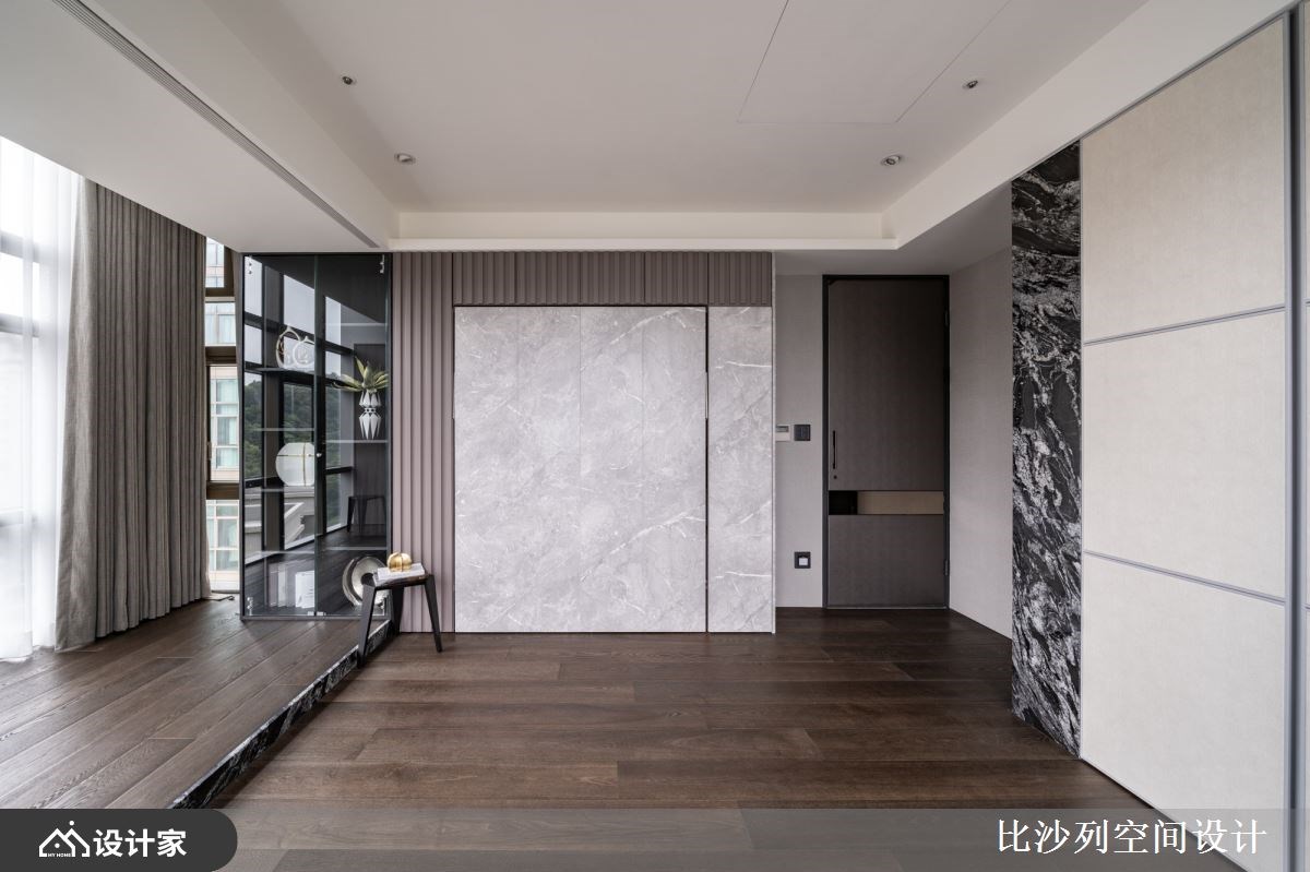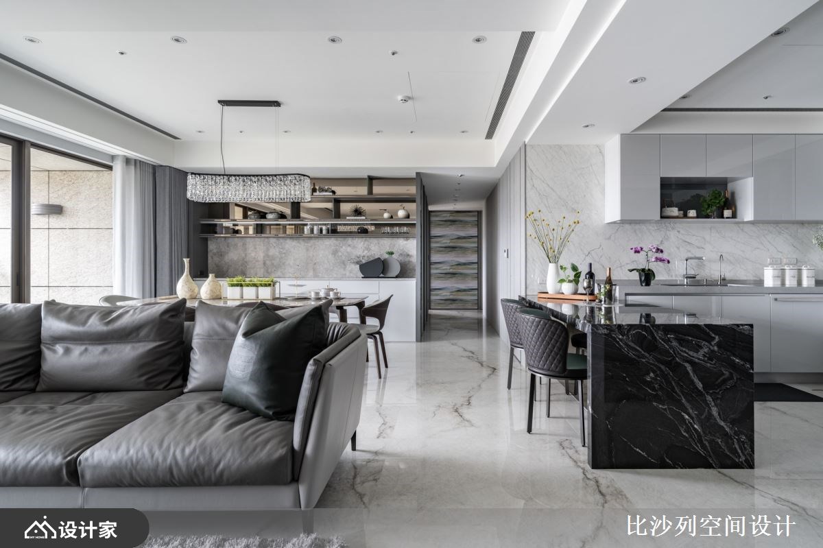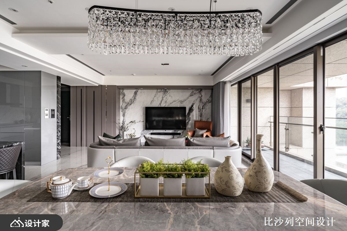以精品豪宅的规格包裹日常所需机能,182 平米的新成屋拥有良好的长方格局以及绝佳的长型日光阳台,比沙列空间设计以进口大砖铺贴玄关长廊、牆面挑选珍稀的石材铺陈;玄关顶天柜牆具备充足收纳空间,与端景柜结合后展现如艺术馆般的端景。二进式玄关设计让廊道成为沉淀心灵的过场,从回家的那一刻慢慢卸下疲惫拥抱舒适的生活场域。 整面落地窗带来的优越採光下,客厅採取开放式设计,在自然光线的照耀下白色大理石纹地砖与电视主牆闪闪發光;灰色义大利精品沙發与地材相互呼应呈现和谐舒适的放鬆氛围。以走道为中心细分餐厨空间,右侧ㄇ字型厨房设定位轻食料理区,延伸出的中岛刻意与餐桌同一水平,让空间更为整齐简约创造更宽敞视觉感受,营造屋主想吃点轻食小酌一番的最佳场域。左侧大理石长桌设定为较为正式的用餐区,上方配置水晶餐灯凸显奢华品味,餐桌后方以壁龛设计打造收纳展示柜,中岛厨房与餐桌配置下让居家生活就像在星级饭店一般,与亲朋好友共享奢华的午茶时光。 主卧特地在入门处使用磁砖与室内的木地板做区隔,创造居室内的落尘区;挑选大地色系为主题,透过特殊材质、金属镀钛打造床头背板,搭配设计单椅与茶几创造私领域的休憩空间。主卧内隐藏式门片后方是独立更衣间有系统的收纳衣物精品,统一收纳设计也让主卧能保留更宽敞的空间,提升寝居空间的舒适度。床尾的右侧灰玻拉门的后方规划四件式卫浴设备,完备的寝居机能让生活品质完美升级。 小编的最爱 宽敞的书房利用镀钛金属铺贴樑柱,修饰了空间的锐利感也增添了视觉丰富度;拥有双面採光的空间採光与景色绝佳,将书桌面向窗外的办公室也让人心旷神怡。书房还特别在牆面规划衣柜收纳、并设计摺叠收纳床,不仅提供工作疲惫时小憩的舒适空间,作为临时客房也十分舒适体面。