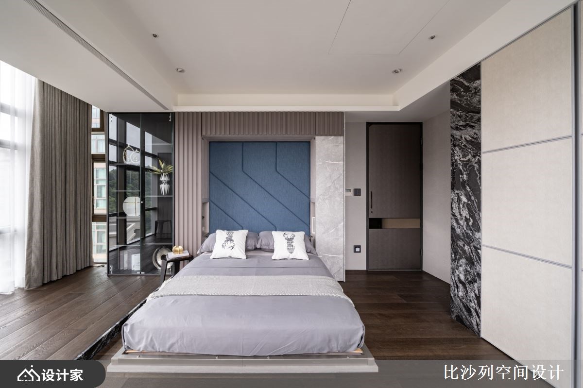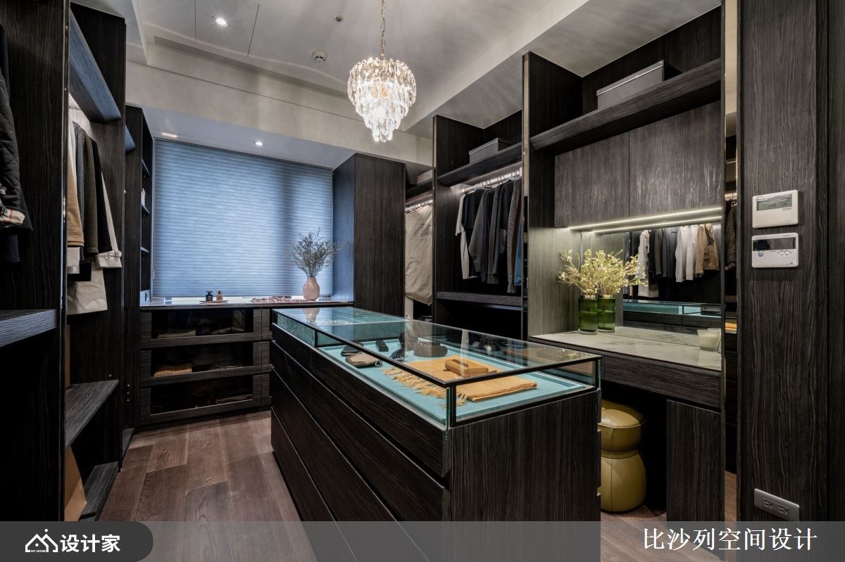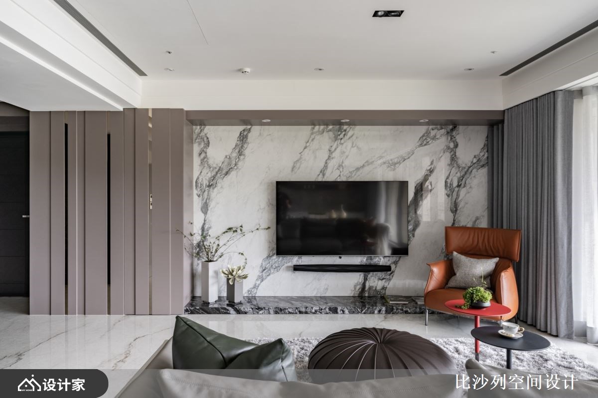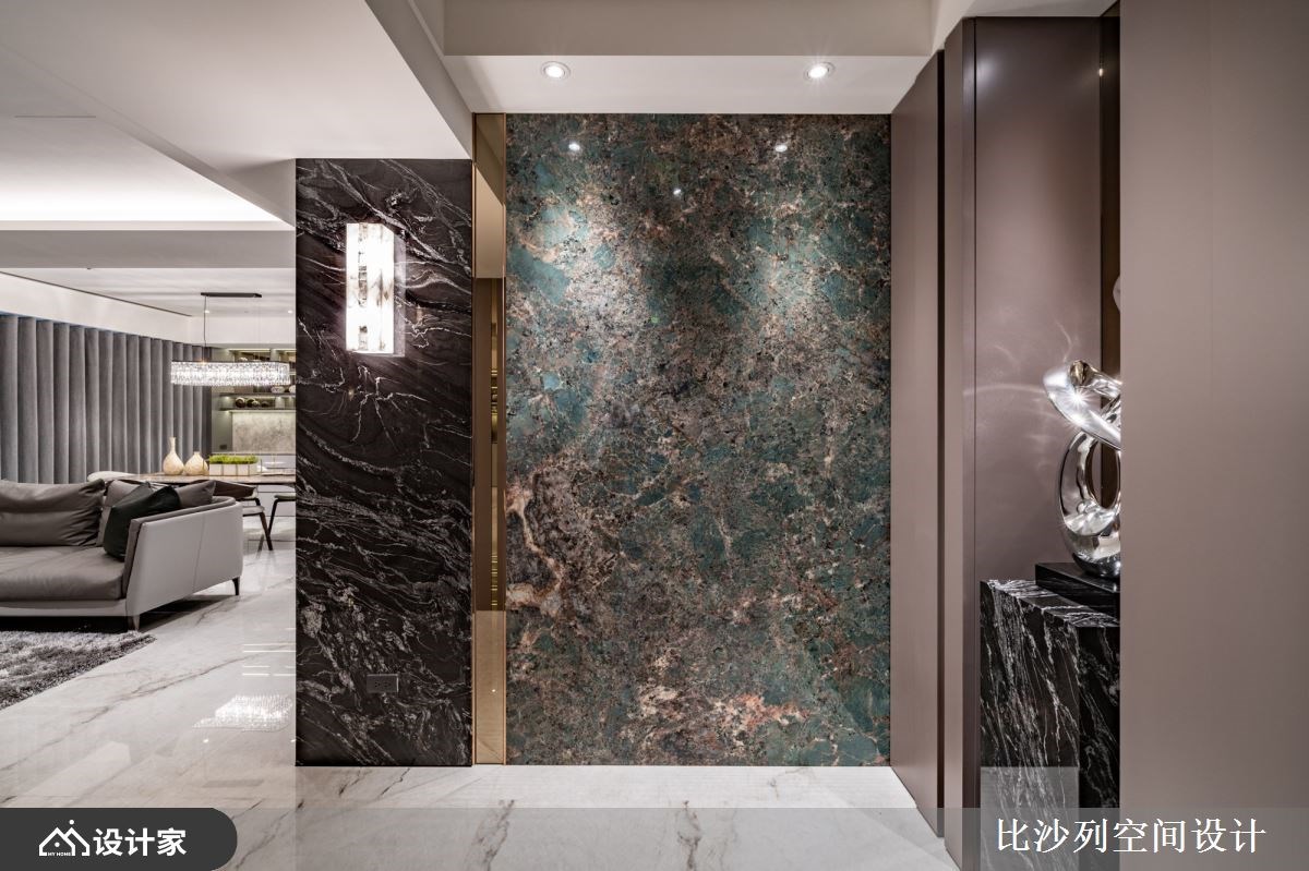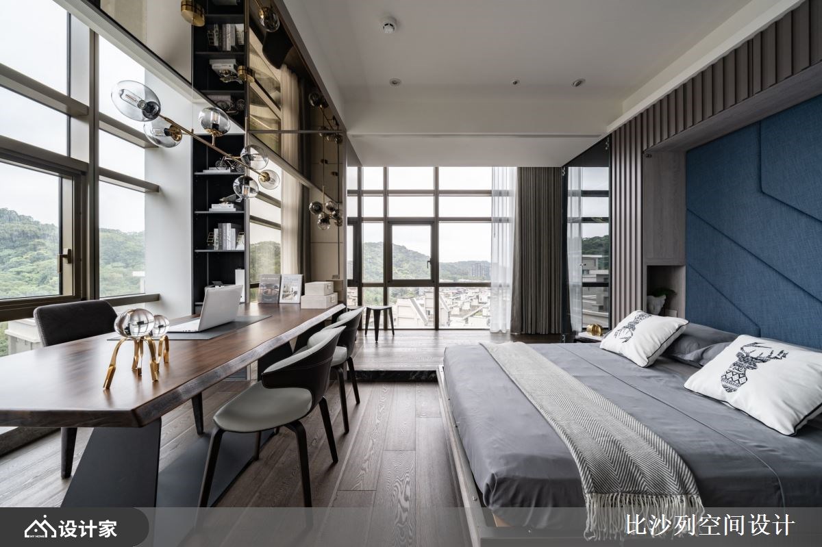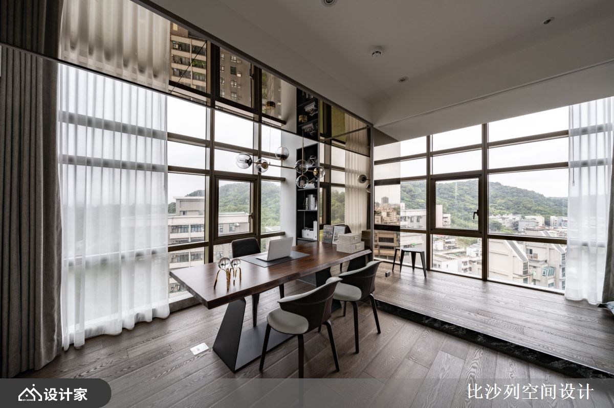 以精品豪宅的规格包裹日常所需机能,182 平米的新成屋拥有良好的长方格局以及绝佳的长型日光阳台,比沙列空间设计以进口大砖铺贴玄关长廊、牆面挑选珍稀的石材铺陈;玄关顶天柜牆具备充足收纳空间,与端景柜结合后展现如艺术馆般的端景。二进式玄关设计让廊道成为沉淀心灵的过场,从回家的那一刻慢慢卸下疲惫拥抱舒适的生活场域。 整面落地窗带来的优越採光下,客厅採取开放式设计,在自然光线的照耀下白色大理石纹地砖与电视主牆闪闪發光;灰色义大利精品沙發与地材相互呼应呈现和谐舒适的放鬆氛围。以走道为中心细分餐厨空间,右侧ㄇ字型厨房设定位轻食料理区,延伸出的中岛刻意与餐桌同一水平,让空间更为整齐简约创造更宽敞视觉感受,营造屋主想吃点轻食小酌一番的最佳场域。左侧大理石长桌设定为较为正式的用餐区,上方配置水晶餐灯凸显奢华品味,餐桌后方以壁龛设计打造收纳展示柜,中岛厨房与餐桌配置下让居家生活就像在星级饭店一般,与亲朋好友共享奢华的午茶时光。 主卧特地在入门处使用磁砖与室内的木地板做区隔,创造居室内的落尘区;挑选大地色系为主题,透过特殊材质、金属镀钛打造床头背板,搭配设计单椅与茶几创造私领域的休憩空间。主卧内隐藏式门片后方是独立更衣间有系统的收纳衣物精品,统一收纳设计也让主卧能保留更宽敞的空间,提升寝居空间的舒适度。床尾的右侧灰玻拉门的后方规划四件式卫浴设备,完备的寝居机能让生活品质完美升级。 小编的最爱 宽敞的书房利用镀钛金属铺贴樑柱,修饰了空间的锐利感也增添了视觉丰富度;拥有双面採光的空间採光与景色绝佳,将书桌面向窗外的办公室也让人心旷神怡。书房还特别在牆面规划衣柜收纳、并设计摺叠收纳床,不仅提供工作疲惫时小憩的舒适空间,作为临时客房也十分舒适体面。