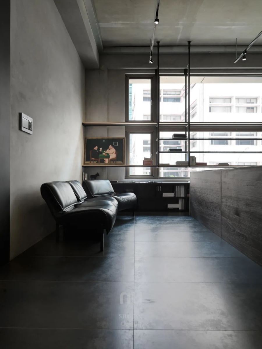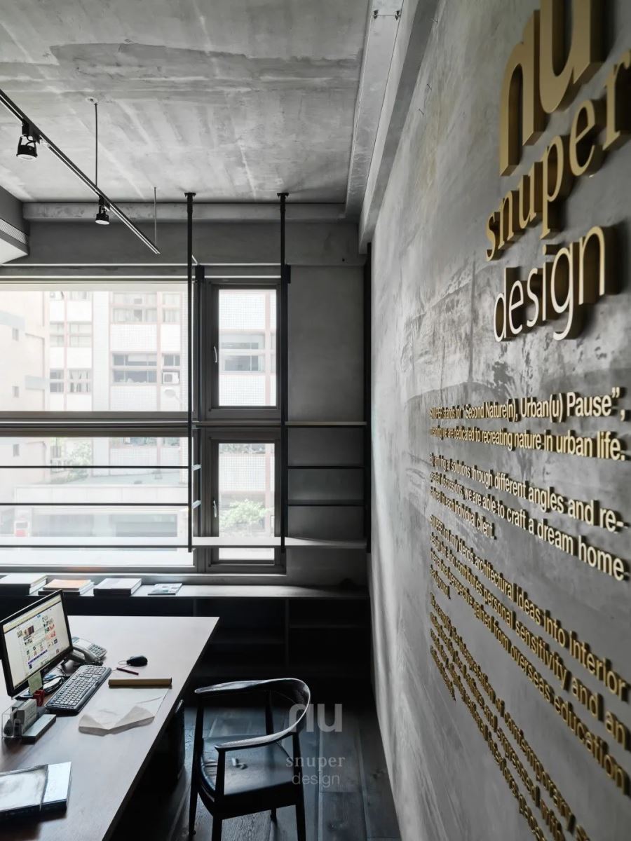 推开漆有金色边框的玻璃门,高挑的空间、灰色墙面和铁件书柜排列延伸入内,位于二楼的办公空间,透过铁件书柜的摆设,适当滤掉了栋距过近的建筑物,将目光转为聚焦室内,呼应自然 (Nature)、都市 (Urban) 的定义,期望能拥有最原始和纯粹的样貌,同时回归设计思考,找回最纯粹质朴的设计之心。