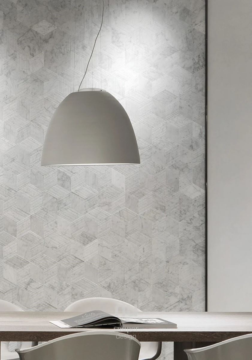 会议桌的摆放位置及立面的分割方式与台北如出一辙,不同的是台中在全白的世界里更显层次。来自意大利的品牌 Salvatori,通过独特的加工方式展现了大理石极度繁复的工艺,细致的线条切割,使得六角形从平面转为立体三维的型态,温润的木,清冷的石,对比与融合,形成最贴近人心的力量。