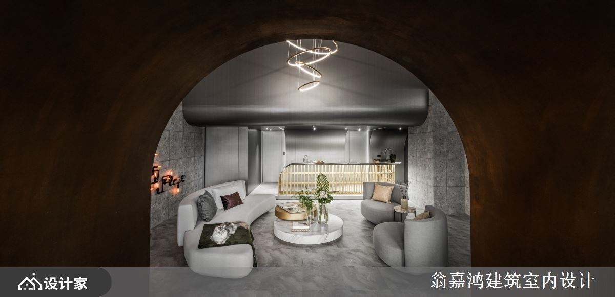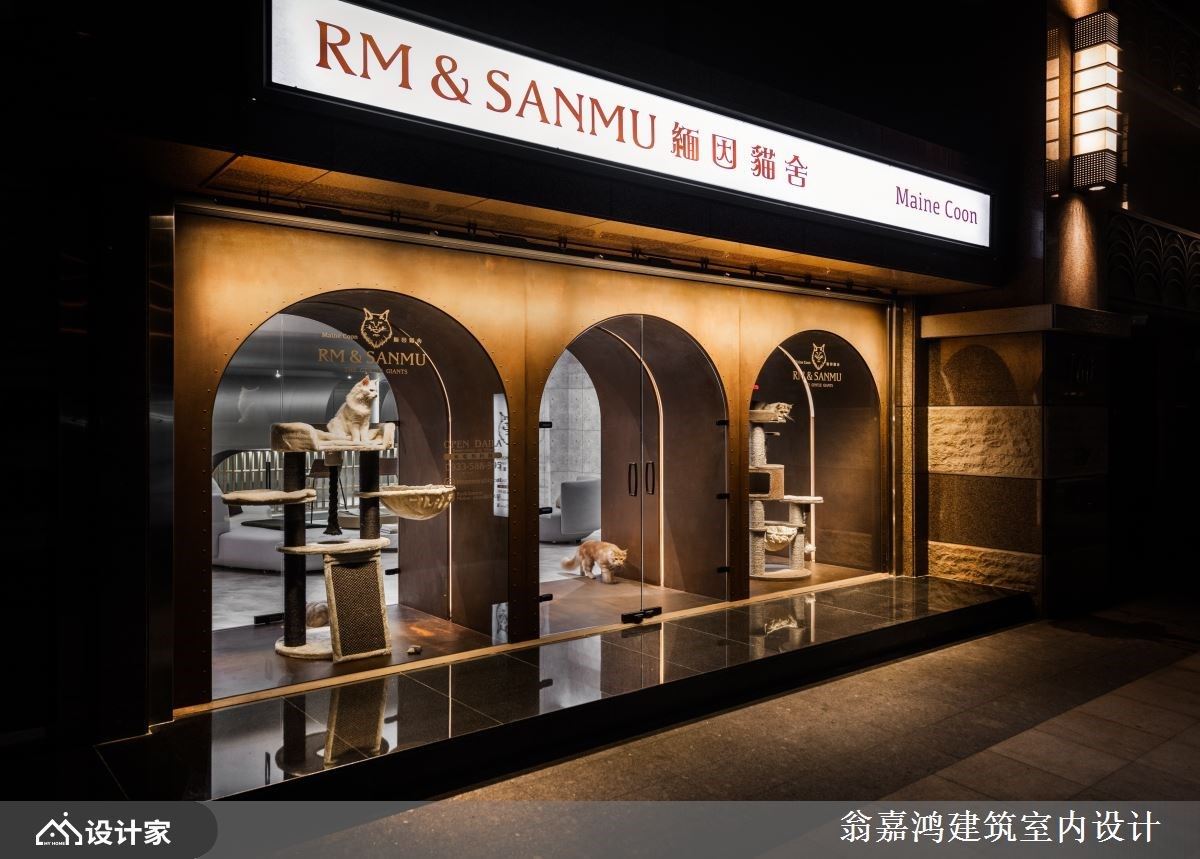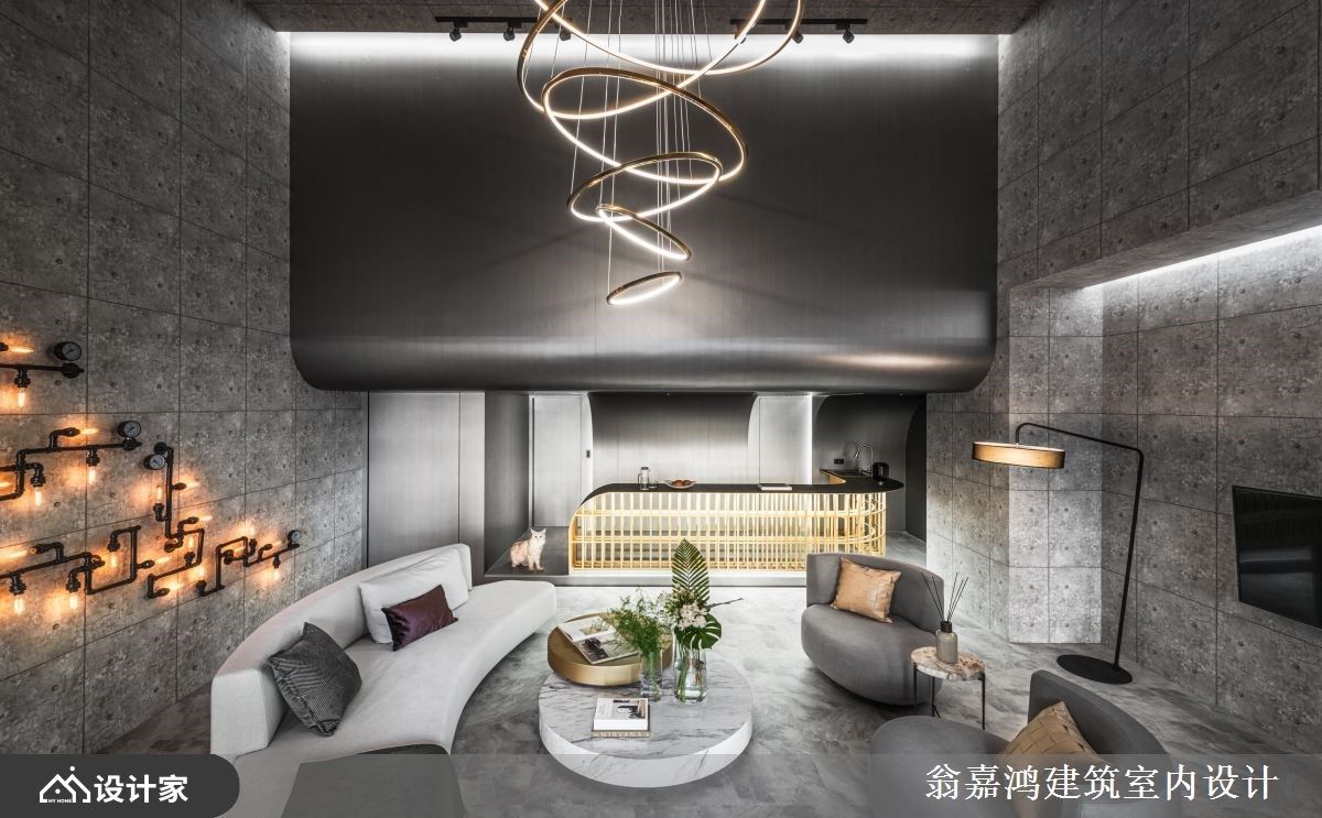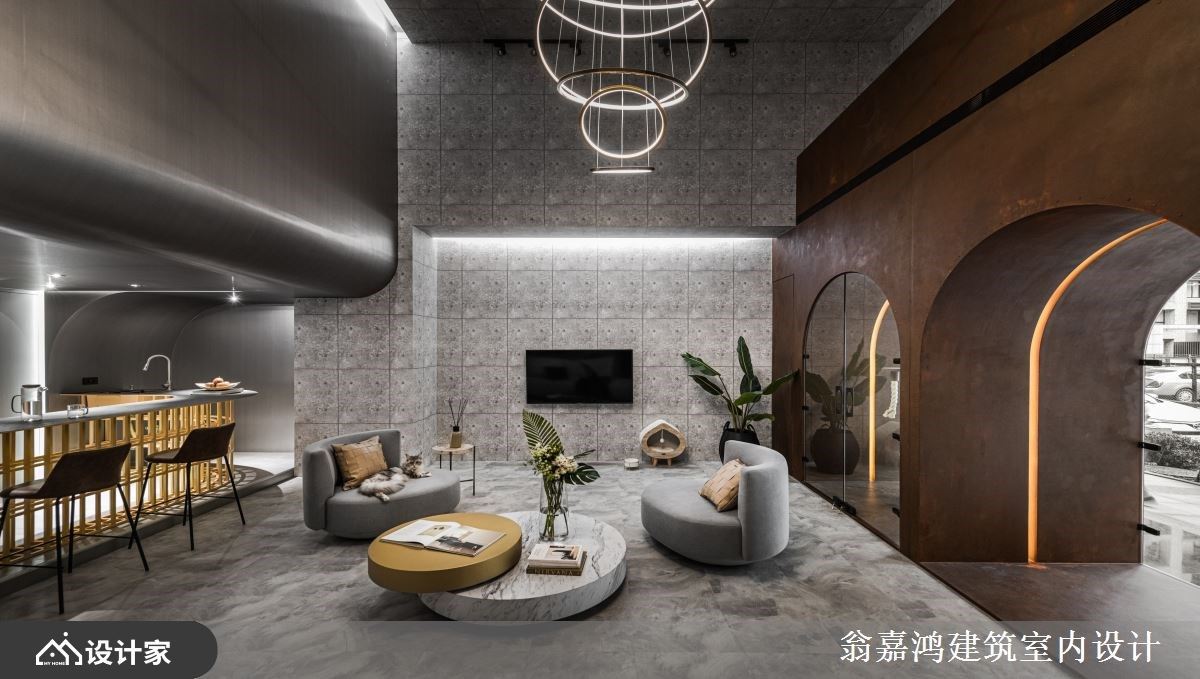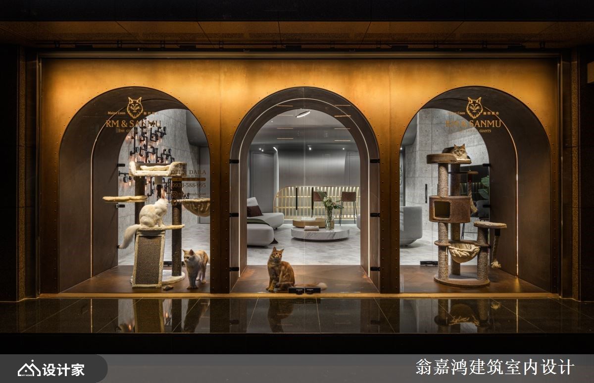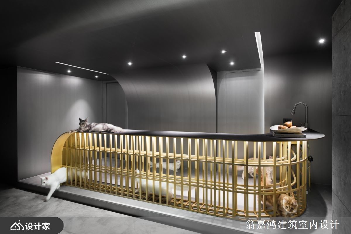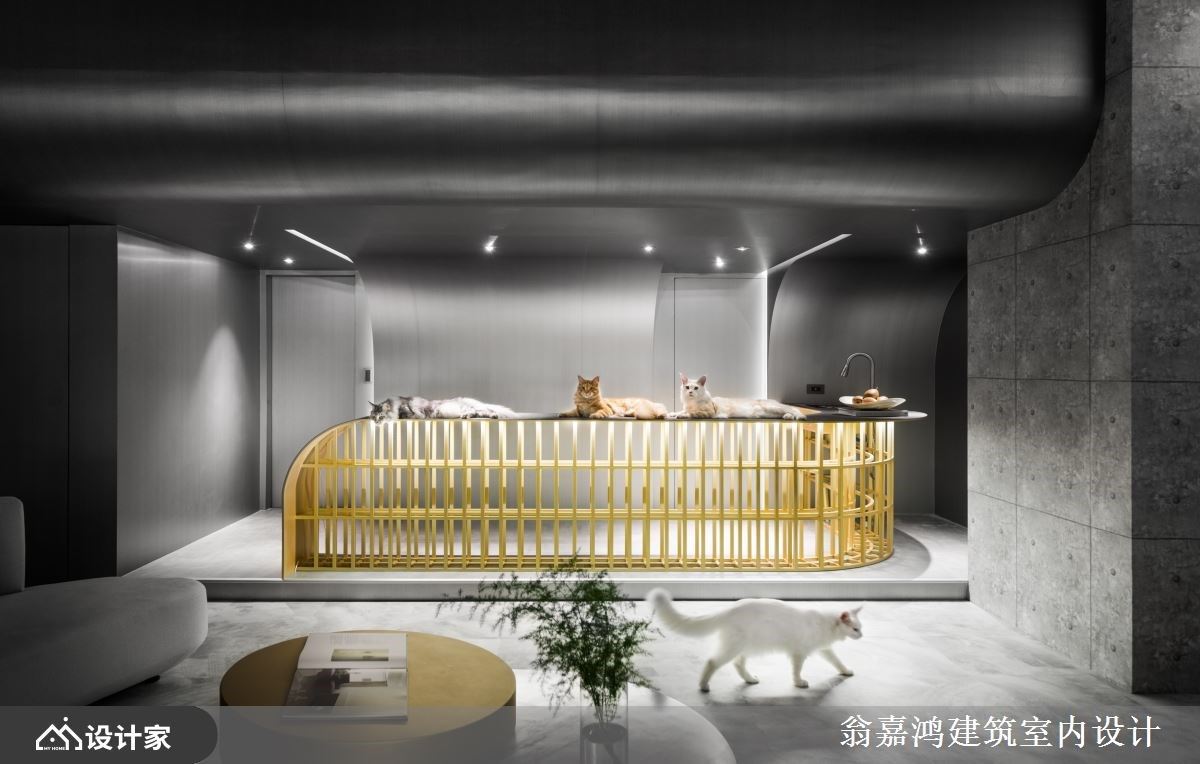 缅因猫看起来雍容华贵、如狮如虎,成年后体型可达1米,个性温柔聪明、非常亲人,因此有着「温柔的巨人」之称号。位于66平方米的新成屋具有挑高优势,是一间缅因猫舍概念馆。在设计上以现代风为主轴,在门面的设计上以烘托缅因猫高贵的气质为设计理念,同时给予宽阔的活动空间,让人与宠物的共处更加温暖。 弧形的拱门设计让人联想到欧式古堡,以铁件为主要素材,以此做为门面设计,将英式绅士风融入其中,突显了高贵的气质。进入空间后,保有空间的开阔及流畅性,最大可能性的保有原始建筑的挑高优势,善用特殊漆表达天地壁的表情,带来视觉惊喜;选择弧形的家具,展现随心所欲、自由无拘的生活态度,鲜明勾勒出沙龙般的姿态,让人与猫有着更好的交流。 不用扎实的量体区隔空间,以一座镂空造型的吧台,区隔出茶水区和起居空间,在鲜明的黄色与黑色的对比下,成为空间中的视觉焦点,给生活更多可能性,同时也是猫咪们游乐嬉戏的场所,真正做到同时尊重人与宠物生活型态的目的。