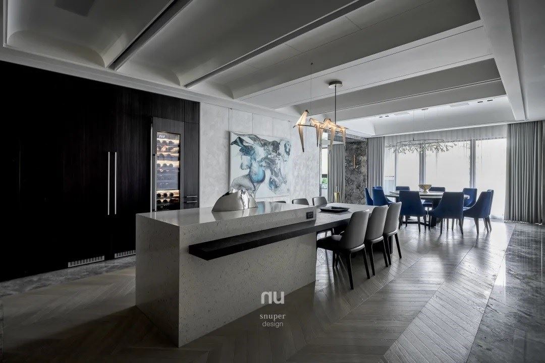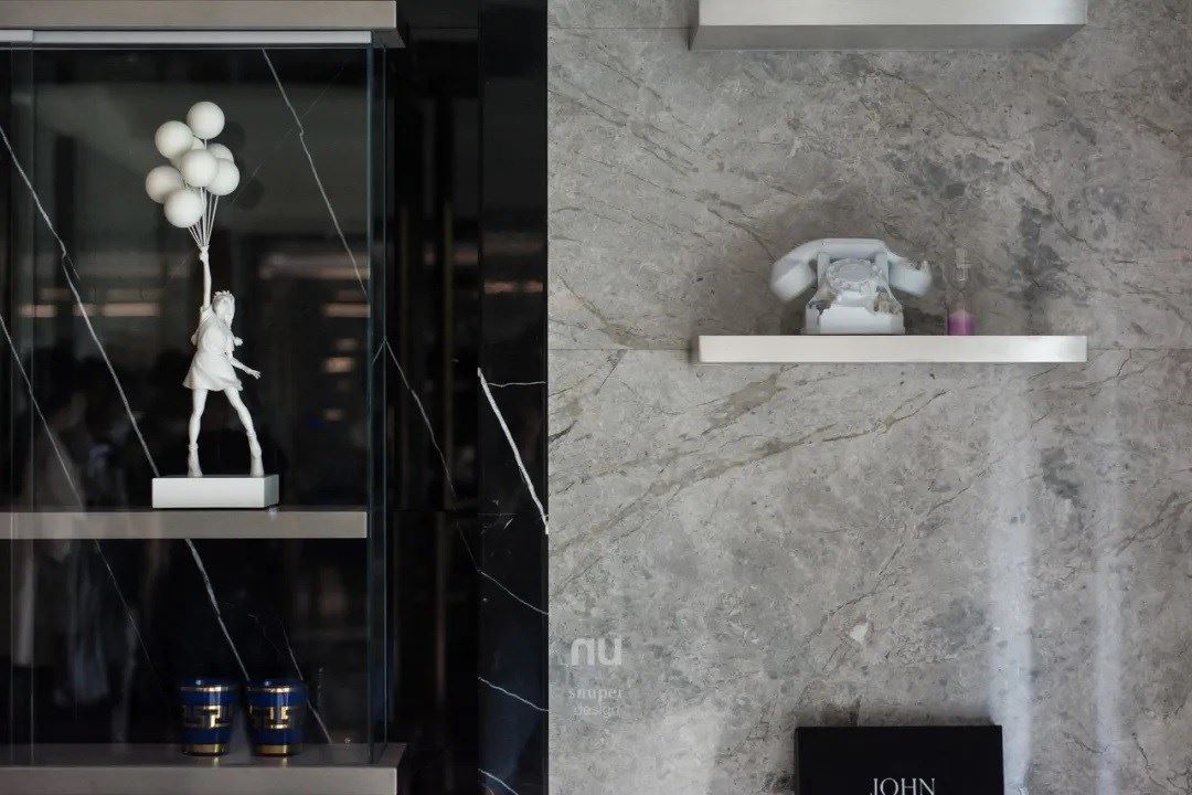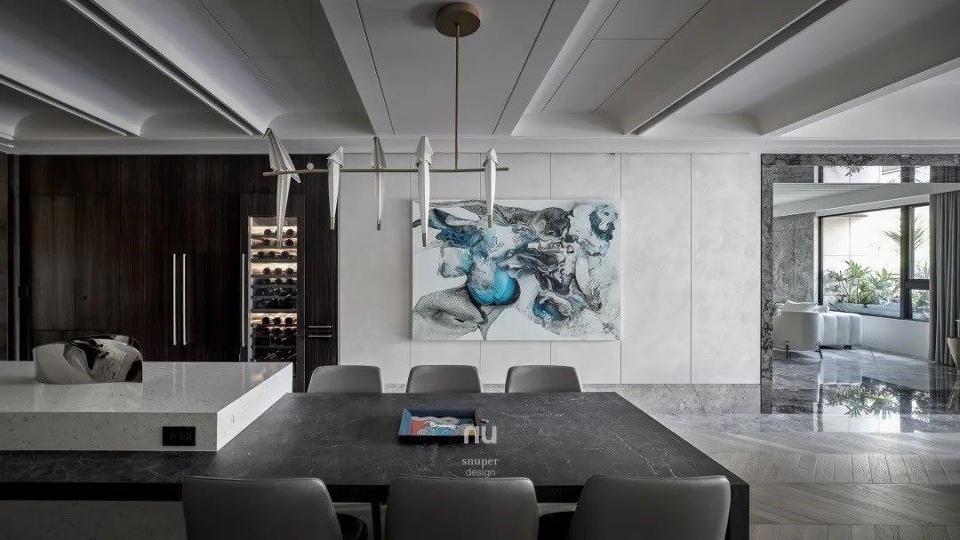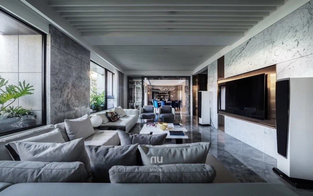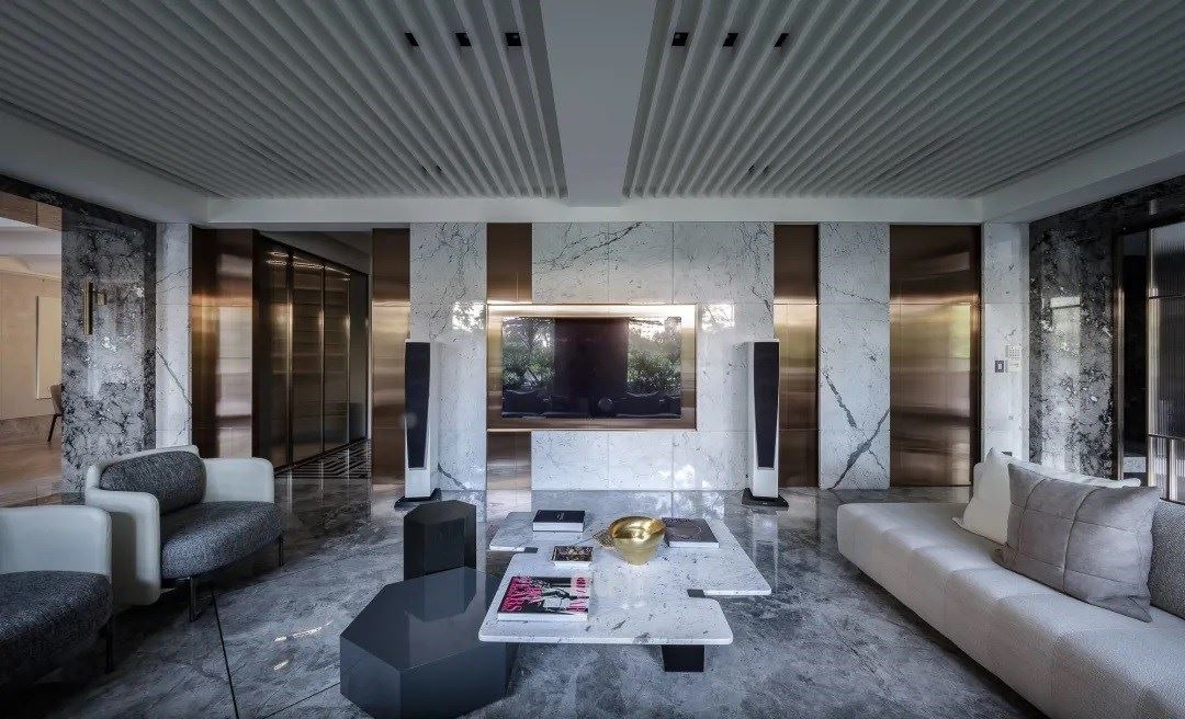 整个客厅区域选用了不同大理石贴附立面,白色雕刻白、蒙马特灰、特殊黑色系石材等,点缀镀钛等异材质相接,利落的线条切分表达着现代主义的气韵,天花板则利用隔栅设计,彰显不凡细节。