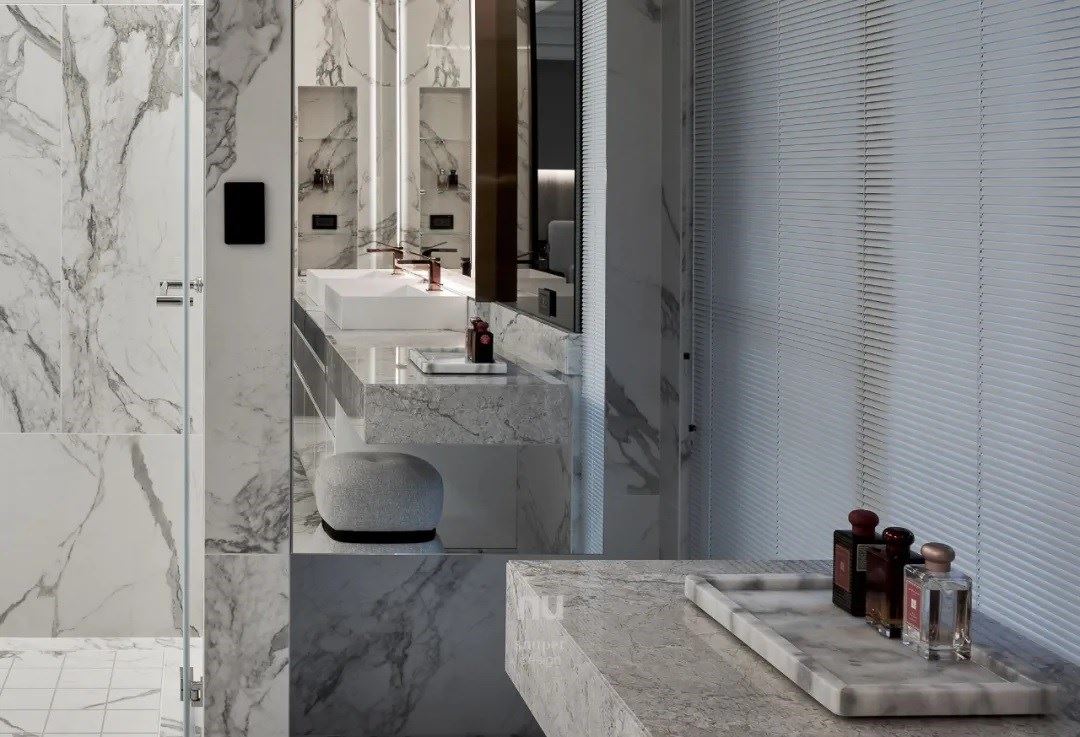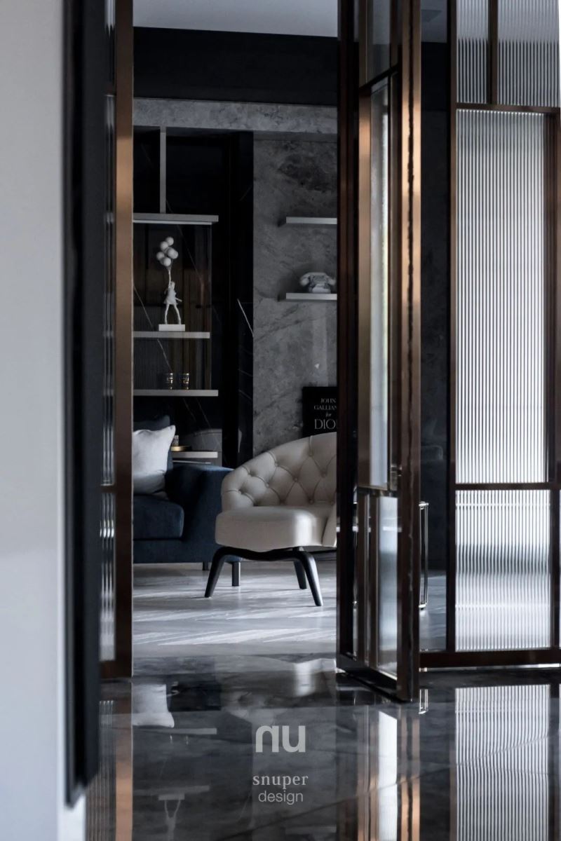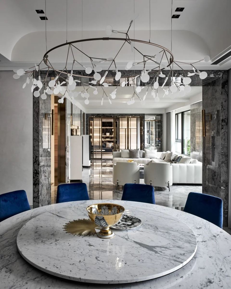 整个客厅区域选用了不同大理石贴附立面,白色雕刻白、蒙马特灰、特殊黑色系石材等,点缀镀钛等异材质相接,利落的线条切分表达着现代主义的气韵,天花板则利用隔栅设计,彰显不凡细节。