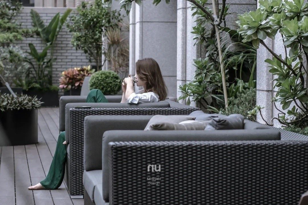 这个空间刚好位于树梢高度的位置,窗外因此有着绿意盎然的先天优势,以此为灵感,通过我们的形塑从客厅区域向外看出,我们在环绕式的露台上创造了私人专属小花园。