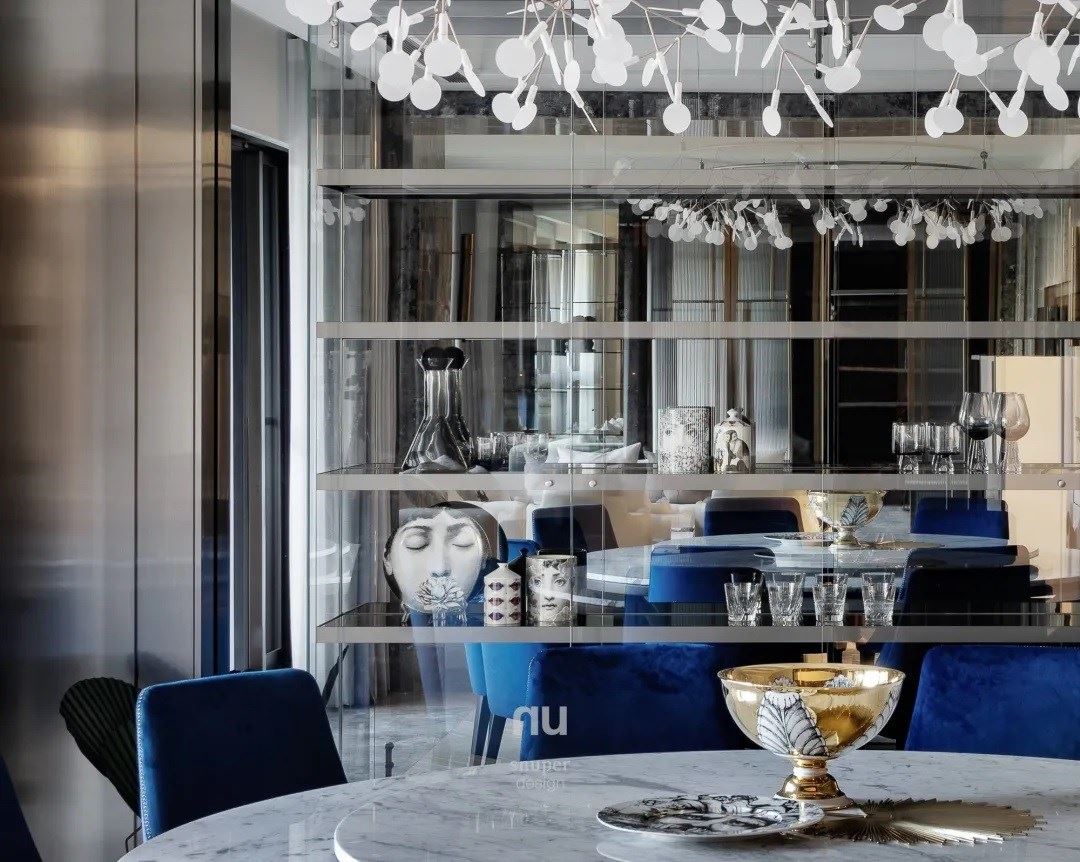 餐厅处,融入米兰家具的展场魅力,以大胆的色彩搭配上 moooi 灯具展现戏剧性的时尚美丽。而此区域使用玻璃与金属层架,制作出大胆而通透的玻璃块体,并加上间接光源,以一种更自由、更艺术、更能表达自我的形态,展示居住者的收藏品。