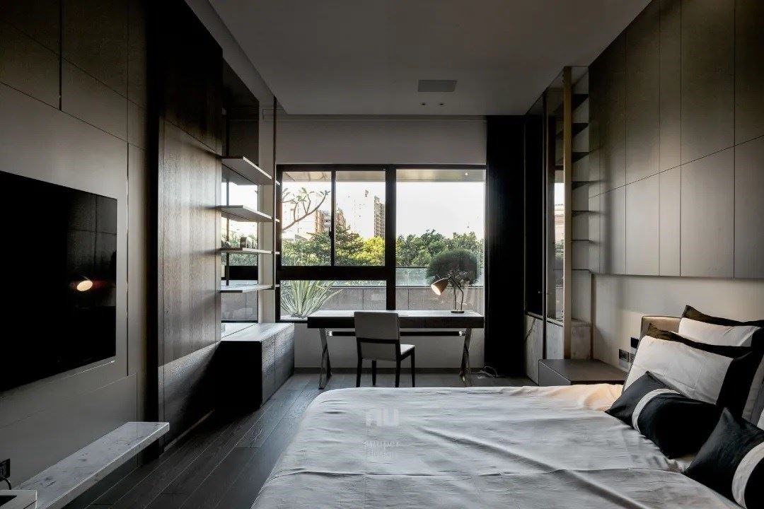 家具高度刻意放低,从窗外透露的绿景温润的亲和感与自然气息在空间中糅合,精巧的高低差巧妙的绿意景致与空间设计相互呼应,居室内,观四季变化,万物可期。