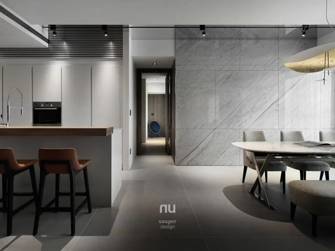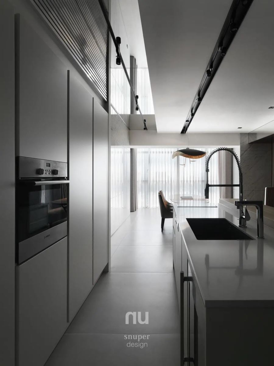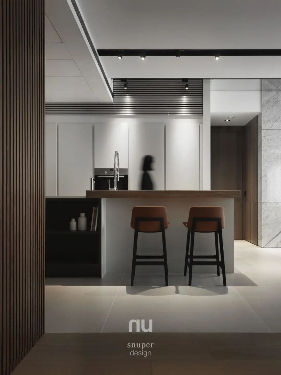 将设计拉回简约表述,越彰显细致不凡之处,私宅里,除了满足机能与使用性,归属建筑、哲学、自然与感性的关系连结,赋予崭新的居所层次。 一字形轴线下以电视墙为中心轴,墙体适切高度与升降灵活特性,宛如艺术品般陈列其中,搭佐B&O落地音响的极简美学展演,体现通透、开放空间感。