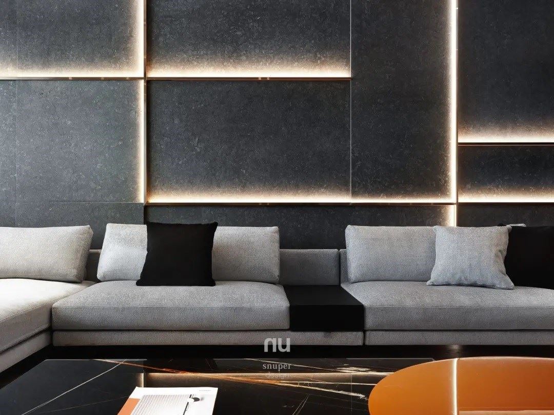 使用意大利经典家具 Poliform 沙发,现代之中感染一份慵懒、极简的风尚,伴随茶几、石材与烤漆质材的单纯塑造,使空间多了一股简洁、利落之美。