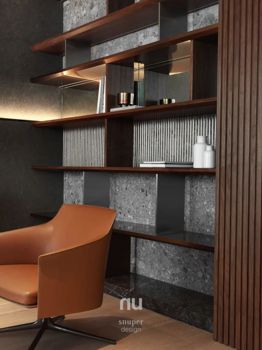 切换到侧边的花砖纹理、古铜金属与渐层线条的错落安排,柜体融入开放与封闭的设计语汇,层次堆栈之间体现工艺的极致展现,且传递静谧、不喧哗的生活品味。