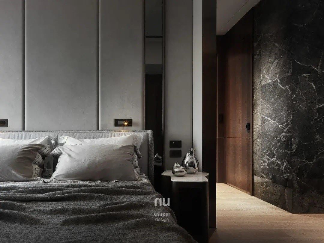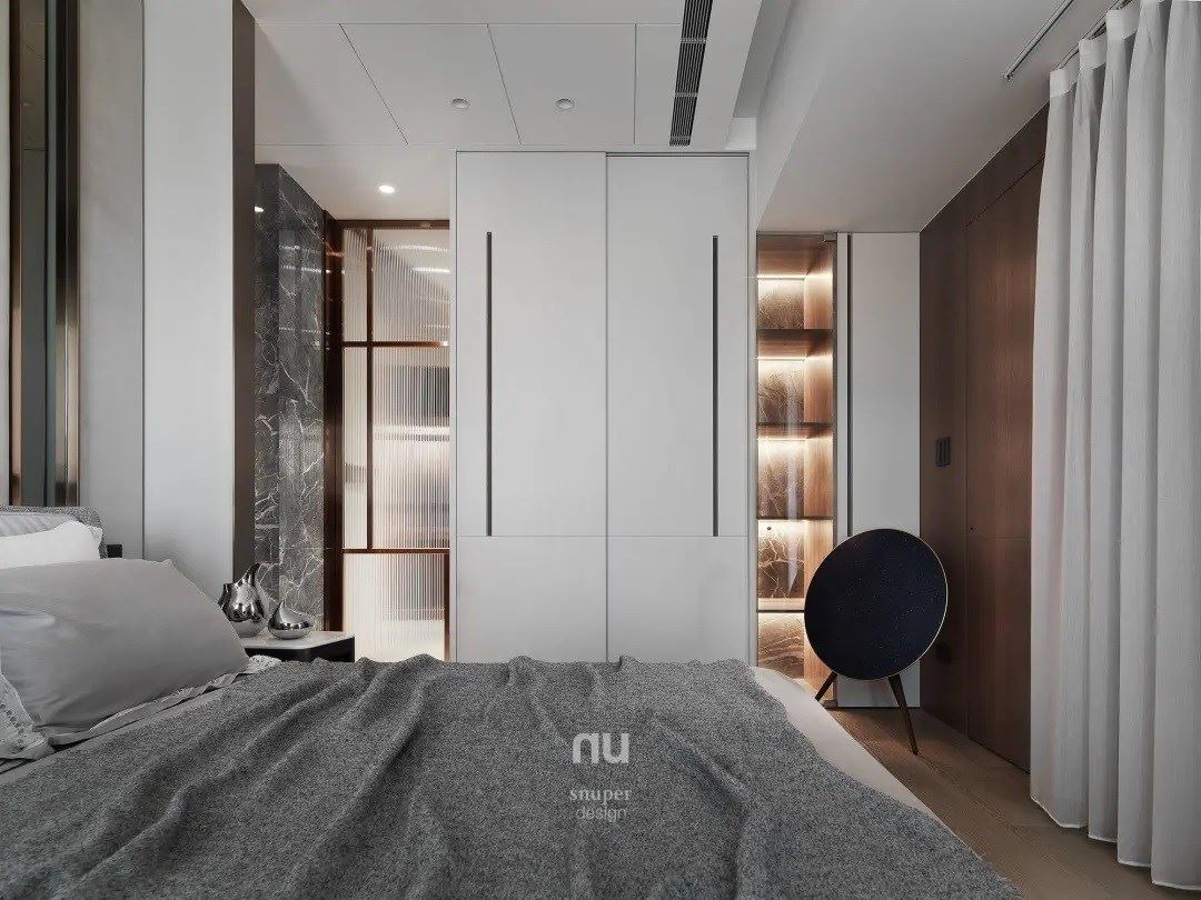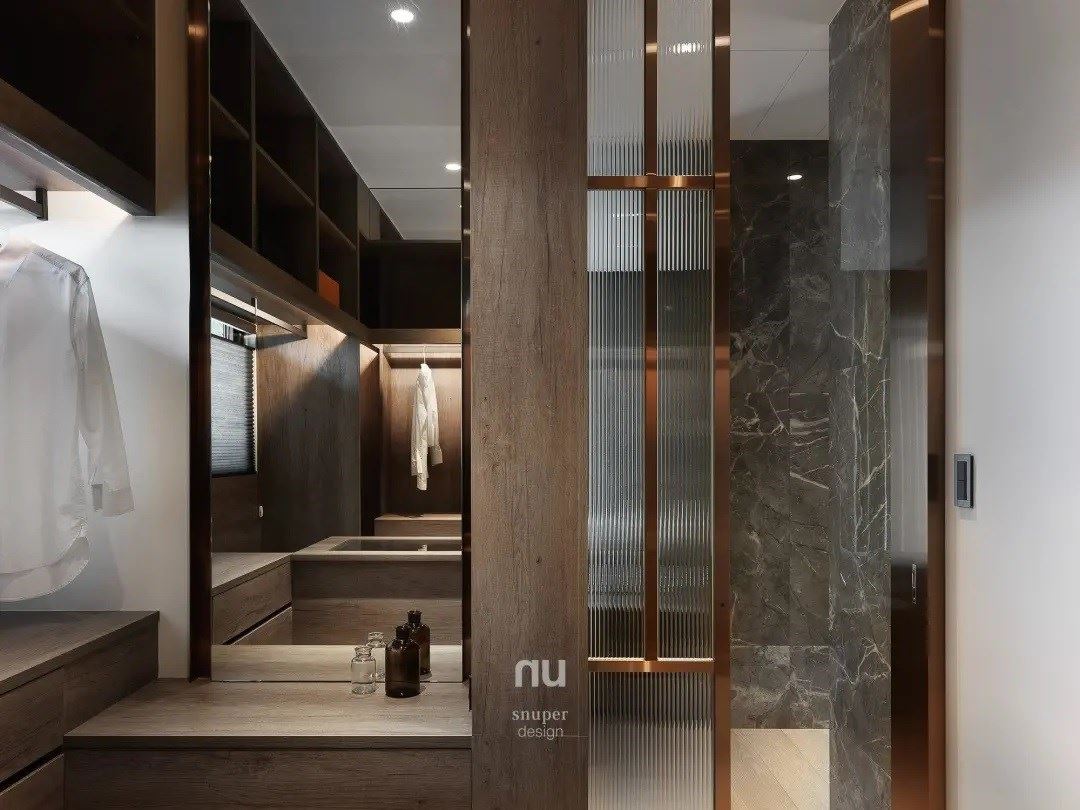 依循风格旅店的精致美感,界定睡眠区与更衣室的拉门透过镀钛妆点,赋予精品私宅质感,且洋溢着温暖气息。