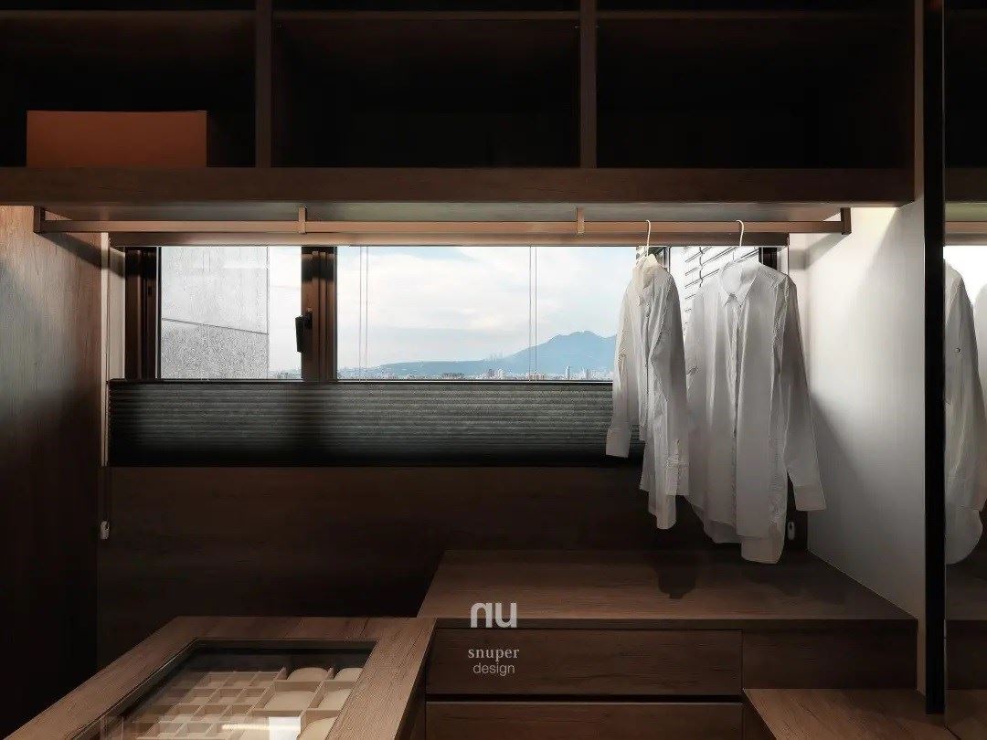 持续延伸自然景致与室内的舒适度,更衣室里以升降窗帘设计巧思,伴随自然光筛洒入室,让人在找寻自己的美丽时光里,同时欣赏山棱之美,五感升华。