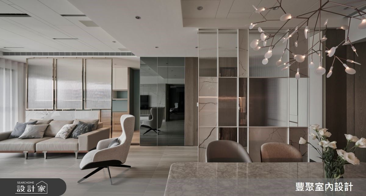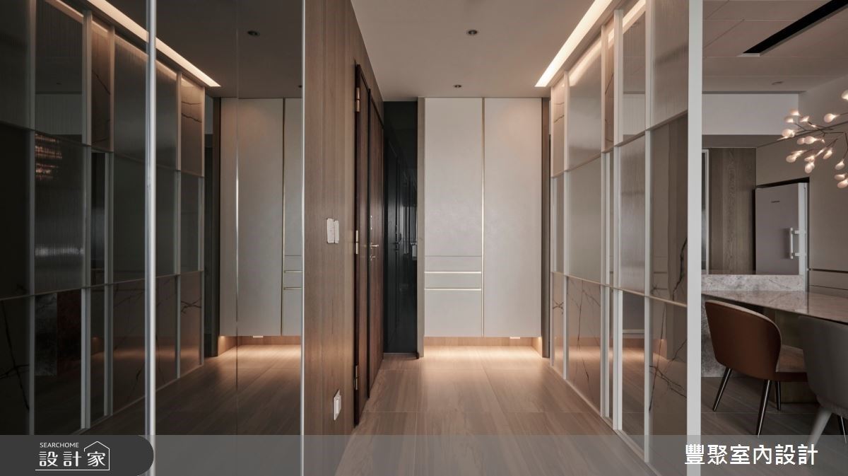 入门玄关处设置穿透式屏风,不仅兼具场域通透性,更化解了风水疑虑,鞋柜门片搭佐金属饰条,提升精致细腻感,侧边黑玻夹纱则藏匿储藏室门片,打造拥有美型收纳的高机能玄关。