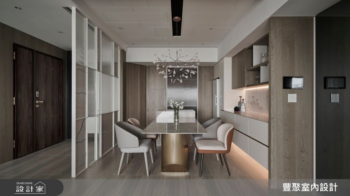 为了创造女屋主期待的梦想餐厨区,透过中岛结合餐桌的一体设计,延伸使用台面的尺度,后方柜体作为珍藏的杯盘瓷器展示空间,最后以玻璃拉门阻隔烹饪时产生的油烟。