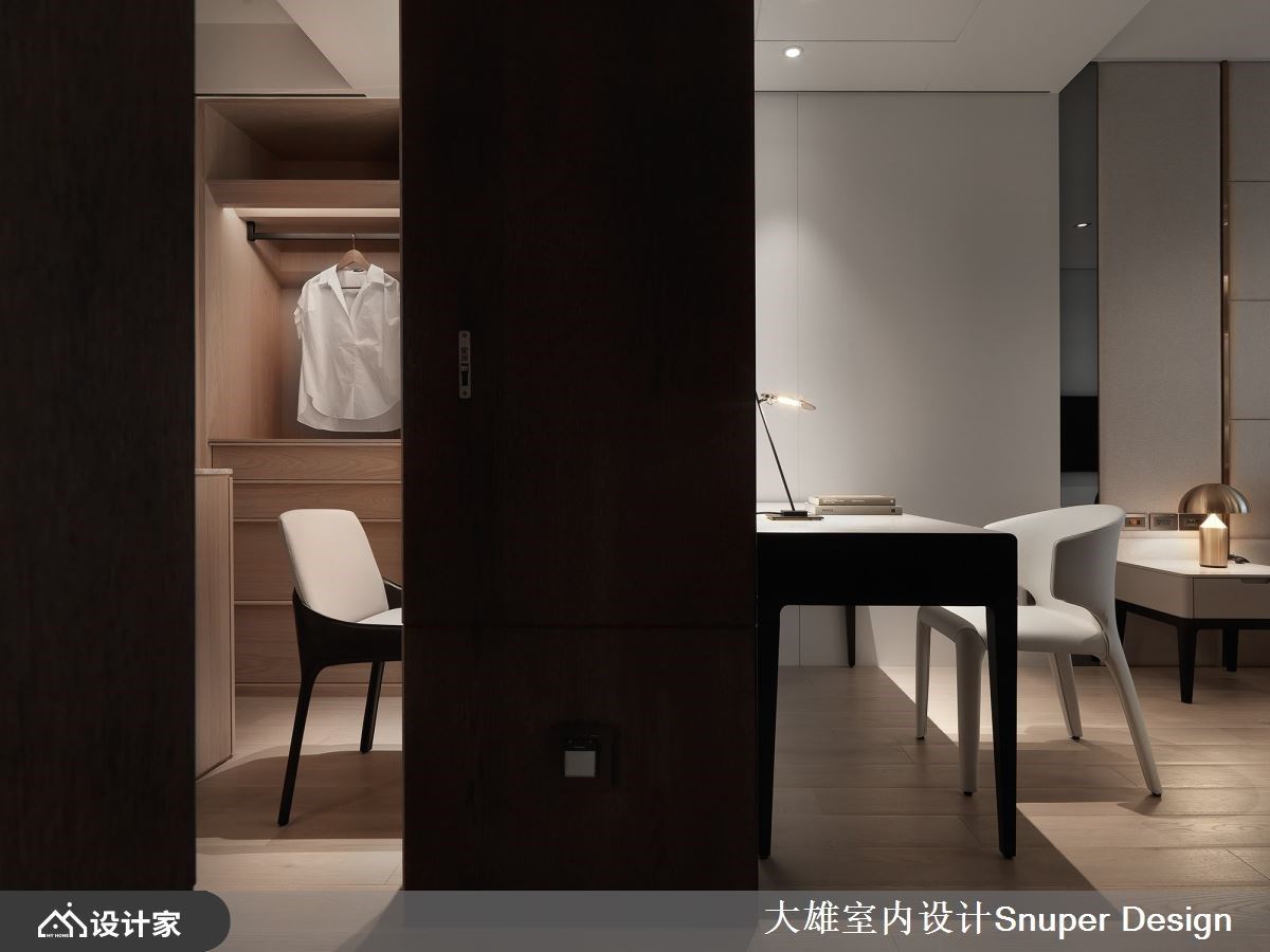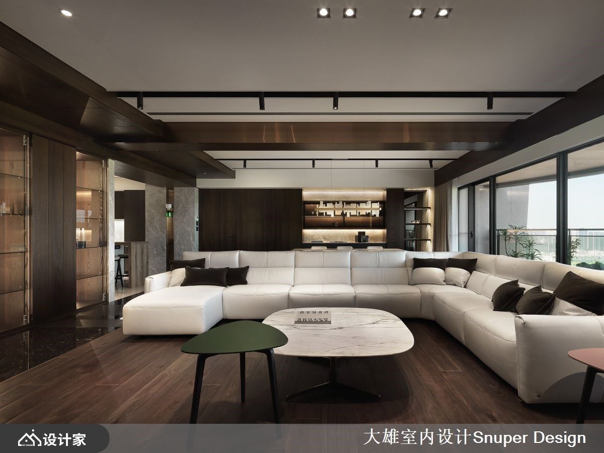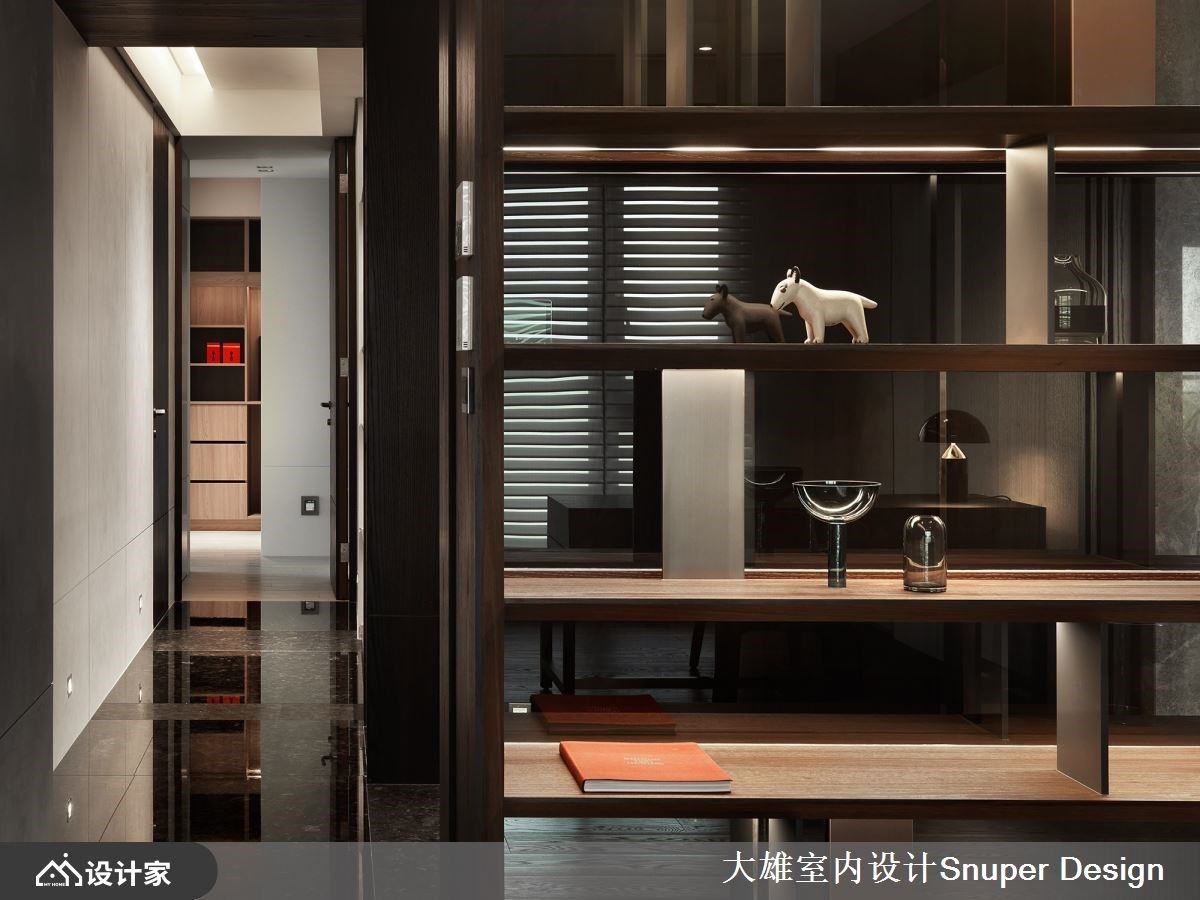 现代风空间里,林政纬设计师透过建筑核心思维操刀室内设计,搭建起人、空间与自然对话的脉络,平衡生活快慢节奏,实现企业家的梦想宅邸。 玄关区以深色且亮、雾面特性石材铺陈地坪,与深木纹肌理的天花板、壁面,交织安定沉稳人心的气息,且铺设出贯串公领域的廊带,成为串连室内的轴线,并放大宅邸尺度。撷取框景建筑手法,以大面落地窗揽入山棱绿意,加上阳台种植低矮灌花丛,酝酿无限的自然生命力,创造内外皆景。 整体空间延伸户外的都市风光与自然景致,交织沉稳木质与大器石材肌理,蕴藏深厚底蕴。客厅电视墙严选浅灰纹理石材,搭佐两侧灯带与包覆镀钛的天花造型布局下,流露轩昂器度;白色、L型意大利进口沙发,搭配简约身形的丹麦进口音响,传递现代极简的居家风范。 开放餐厅领域里,陈列着简约身形的餐桌椅,搭配意大利几何石纹灯饰,倾注一抹细致的人文设计质感。平行于餐厅、垂直公领域轴线的内厨区,大型中岛吧台串连木质餐桌,内建优质电器设备与烹调工具,满足日常所需的生活机能。 小编的最爱 以深色、内敛质感为基底的家居里,在开放展示柜安排下,通透特性让空间更为延伸;结合灯带的巧思安排下,陈列的对象升华为艺术之美,擦亮视觉新意。