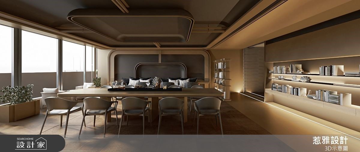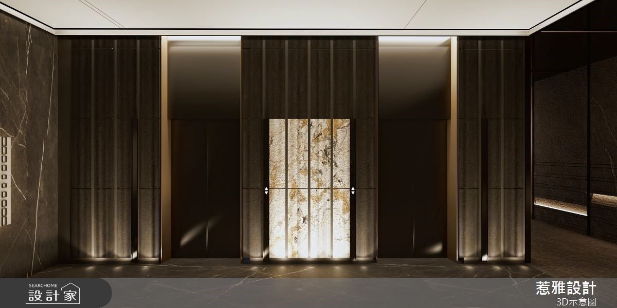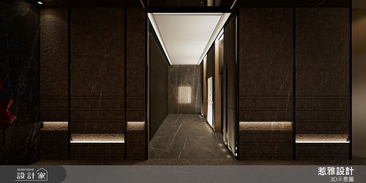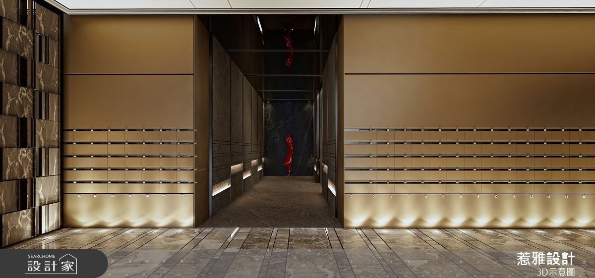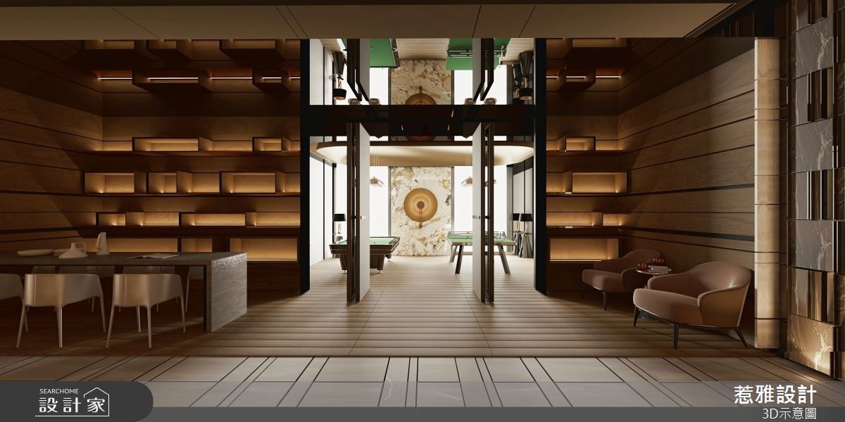 250坪的建案公设内,惹雅国际设计以符合住户需求及喜好为设计的出发点,不仅在场域区隔上有着缜密的安排与规划,更以爱马仕色调作为整体配色主轴,营造出低调奢华的细致感,并运用间接光源缔造空间层次,且适时加入弧形、石材纹理等元素,成就奢华高质感的公设空间。 玄关接待处的圆弧形石材地坪与上方圆盘造型相互呼应,在空间内挹注大量的弧形转角语汇,提升整体的活泼与现代感;多功能餐吧区与阅读区的结合,提供一处放松身心的休憩角落,以木质调营造出人文书香气息,打造复古感的高端氛围,;外侧链接多功能球台区,以石材端景融入圆弧意象,呼应整体公设的现代精致感;健身房以大面落地窗连结户外绿意,让住户在运动期间能享受阳光恣意洒落的美好时刻。