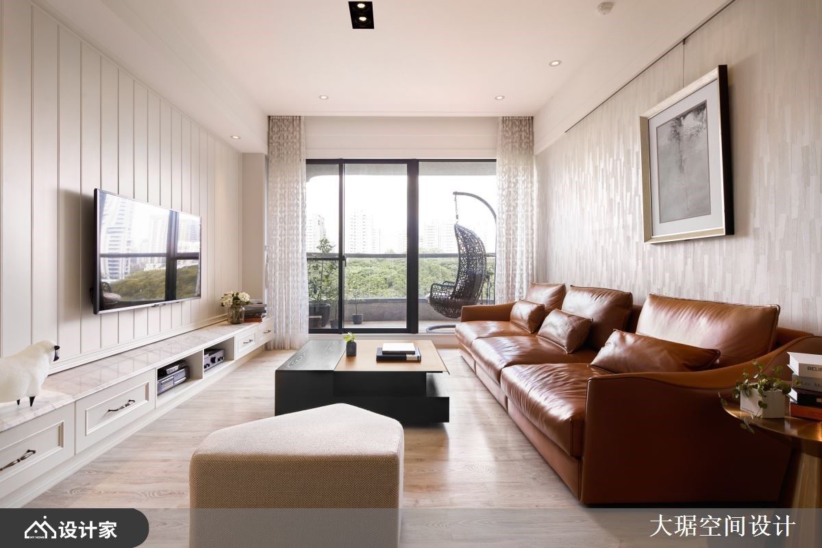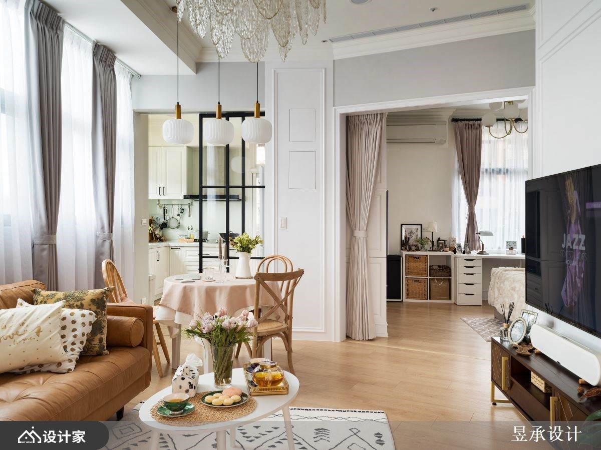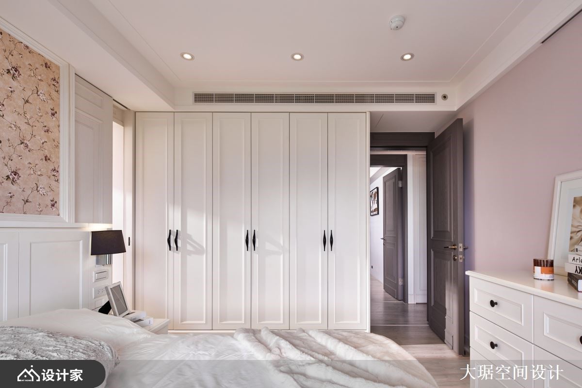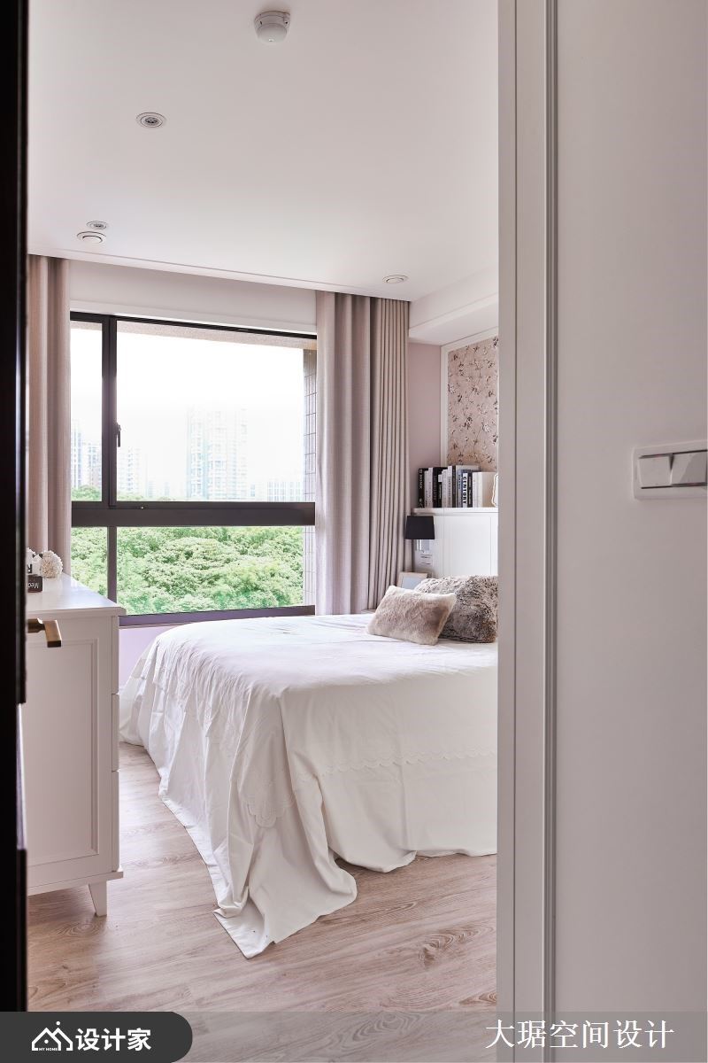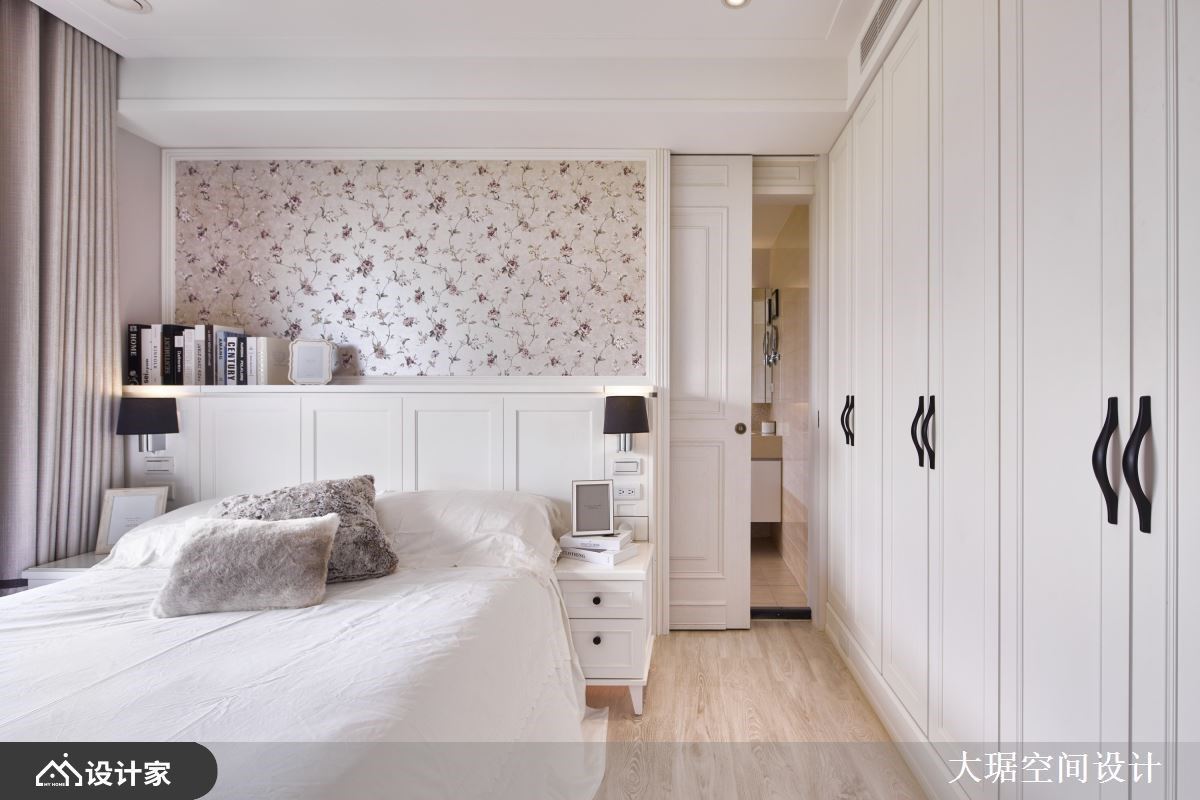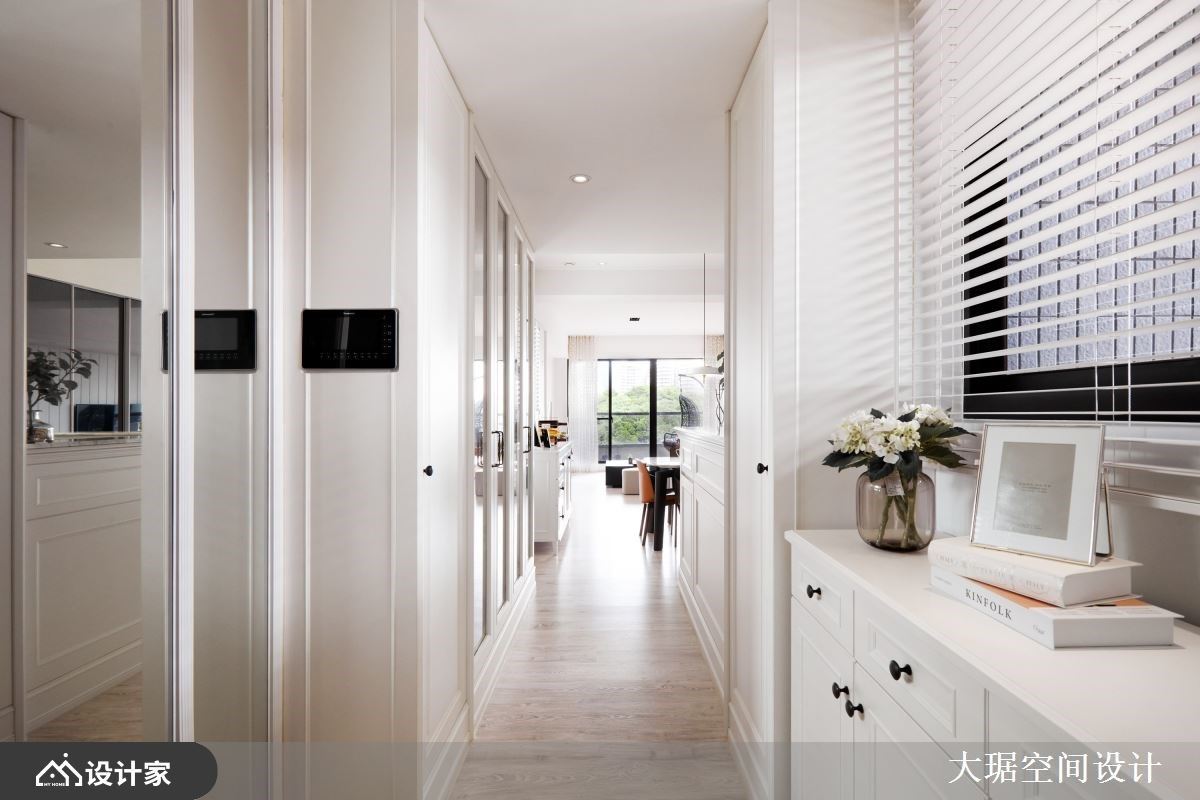 96平米的新成屋,希望在保有窗外优异景致的同时,拥有精致的美式风格,并具备3居室2厅让一家四口都好住。整体空间以白色为主色系,将公共空间置于景致最优美之处,尽力保有最大的开窗面。甫入玄关空间,充足完善的机能收纳与穿衣镜,为使用上带来便利性;客厅、餐厅和厨房等公共空间开放相邻,打破以大理石装饰电视墙的常规,以木作制作出美式风格的温润感受,沙发背墙则贴附柔和的米白壁纸,让人身在其中的感受和体验均处于最舒适的状态。 厨房从封闭的区域移至公共空间与餐厅相邻,并规划有小吧台,达到遮掩炉灶及多功能使用的目的,同时在窗外景致完整保留的情况下,让下厨的家人可以在忙碌之余享受良好视野,餐厅区域的立面上使用了黑镜,后方则为收纳空间,既有实用用途,同时致力于在虚实交融的美感间凝结诗意。而景致较为不突出之处,则利用白色木百叶窗,加上柜体,可做为收纳和展示用途,同时更加实现美式风格的特色。 小编的最爱 主卧室同样延续纯白的美式风格,床头墙的部分则加上柔美的玫瑰花壁纸点缀,加上床头柜的设计,有效化解大梁压顶的问题,增加收纳机能,另外更选用线板修饰推拉门,达到遮掩卫浴位置、完善使用机能等需求。