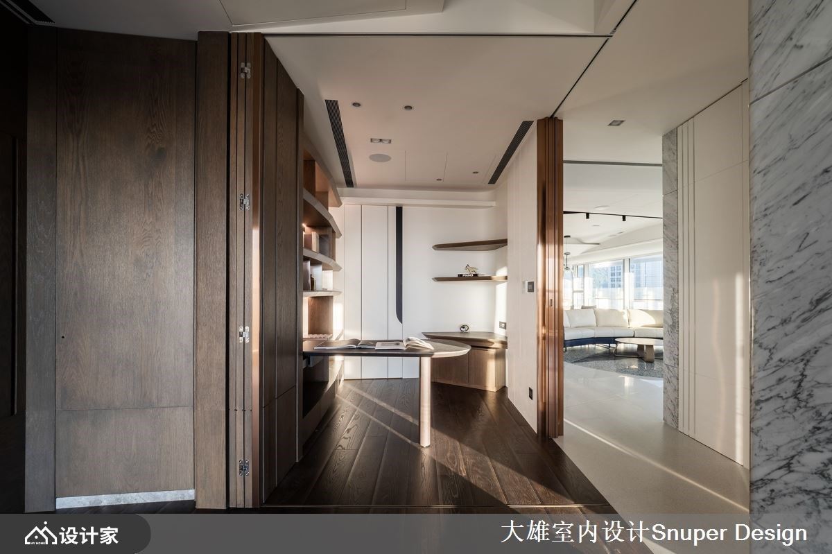 对层峰人士而言,在路上奔驰早已无法满足速度给予的激情,驾着游艇航行于汪洋、腾架于海浪之上,对于喜欢运动的社会菁英来说更能彰显身分与品味。本案位于精华地段,高楼层的优势,让居住者坐享摩登大楼建构而成的都会天际线,宛如冲浪在一座座高层建筑的轮廓之上,更以此为灵感,将征服海洋的雄心壮志延伸至空间设计之中,融入游艇具有弧度的线条之美,柔化建筑刚硬的梁与柱,突破限制、为当代住宅设计写下新的里程页。 三居室两厅两卫198平米的预售屋,客、餐厅量身订制极具个人特色的室内设计方案,满足男主人对于高度个性化的追求。首先,将圆弧的设计融于空间之中,同时保持公共空间的开放与连接性,通过大面落地窗和具有休闲感的户外木地板、特别订制的按摩池,让城市住宅也有度假休闲氛围。沙发挑选圆弧型,并且不靠墙摆放,地坪则利用水磨石,加上黄铜压线的线条切分,宛如镶嵌在空间平面上的艺术品,巧妙的定义空间区块。 而大雄设计发挥独特巧思,天花板如海上波涛,结合上订制的光雕艺术,如星河、如大海。整体公共空间更得益于这项前所未有的创意,以及最大程度的天地壁互相配合,将海上宜居性的理念传达入室,令居宅的设计达到新的高度。 小编的最爱 书房区域是一处转折进私领域的弹性之所,采用推拉门和拉折门结合的两种形式,确保空间的多元使用性。在推拉门的设计上,挑战将材质以实验性的方式,重新诠释经典,将镀钛金属与金属网,夹于两层玻璃之中,将过渡区赋予奢华感,并通过丰富感官强化细节与精致度。