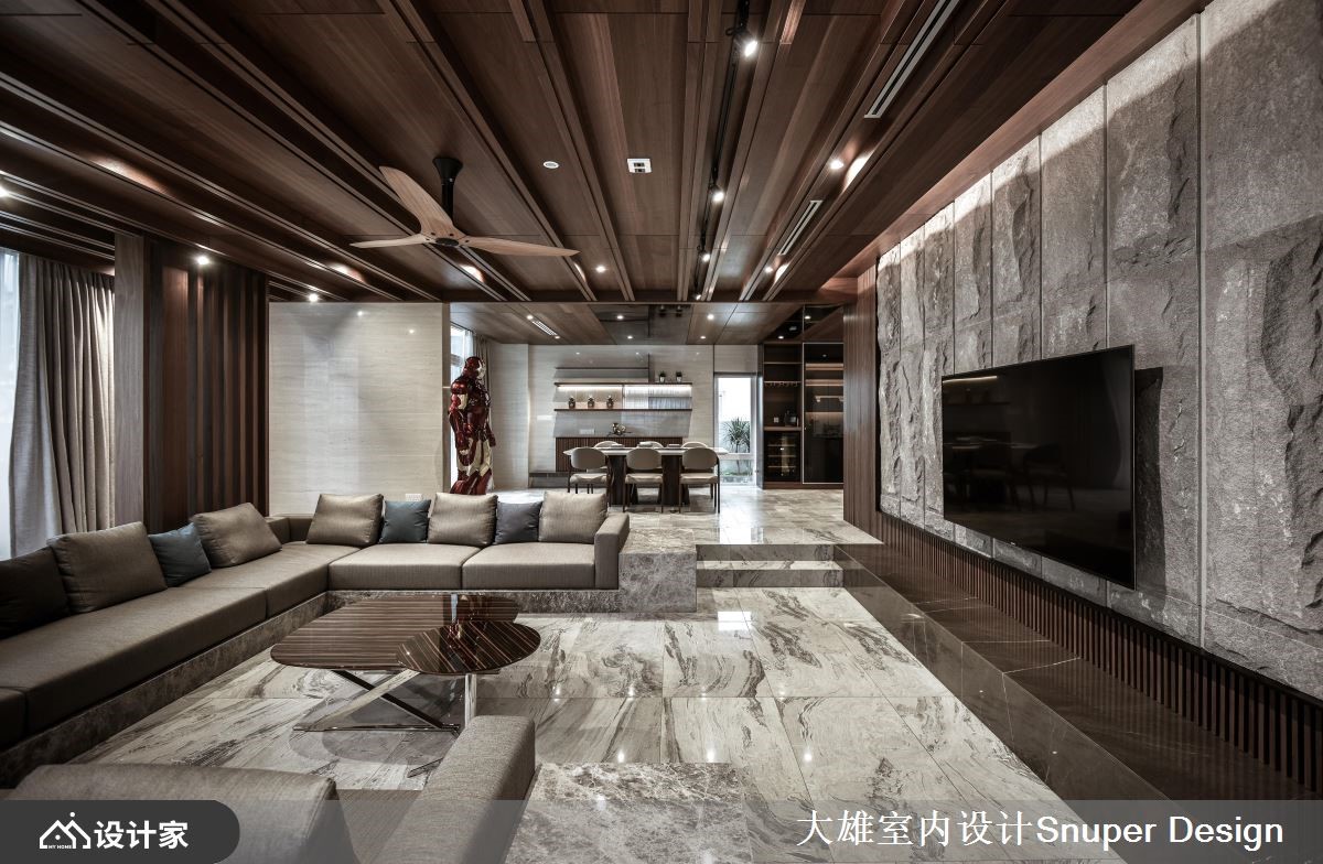 屋主一家六口对于透天别墅里的新生活充满期待也拥有许多梦想机能,如红酒收纳柜、中岛吧台、居室配置更衣间等,营造机能与品味兼具的独栋别墅。 设计师将全家人的需求全盘考量,首先运用天然石材铺叙现代风语汇,再挑选B&B一字型沙发、Fritz Hanse餐桌椅点缀空间,更完整呈现的 380 平米住宅的奢华气氛。格局规划则透过半墙隔断、延伸的收纳设计巧思,替空间扩容且发挥各领域空间坪效,让每一位使用者皆能享受高规格定制服务的奢华。 电视墙与沙发配制跳脱制式格局动线,化解客厅存在的风水疑虑,但转向后无法彰显豪宅公领域的大器空间感,于是设计师规划一座红酒收纳作为电视墙的延伸,并透过深色系材料无缝接轨至中岛吧台,达到视觉得延展,领域之间多了串连感,客厅视野同样具有放大效果,且视线与动线也一并带入开放式餐厨地带,不管是待在客厅或餐厨地带没有了界限,凝聚豪邸里的家人情感。 小编的最爱 居室高墙隔断、女儿房半墙收纳柜、孝亲房的半墙书桌机能规划,腾出舒适的更衣及书房空间,也减缓夏天东晒的炎热感。此外,主人房具备了完整的收看电视、梳妆及阅读书房功能外,更利用球鞋收藏打造一幅独特的个性化端景布置妆点空间。