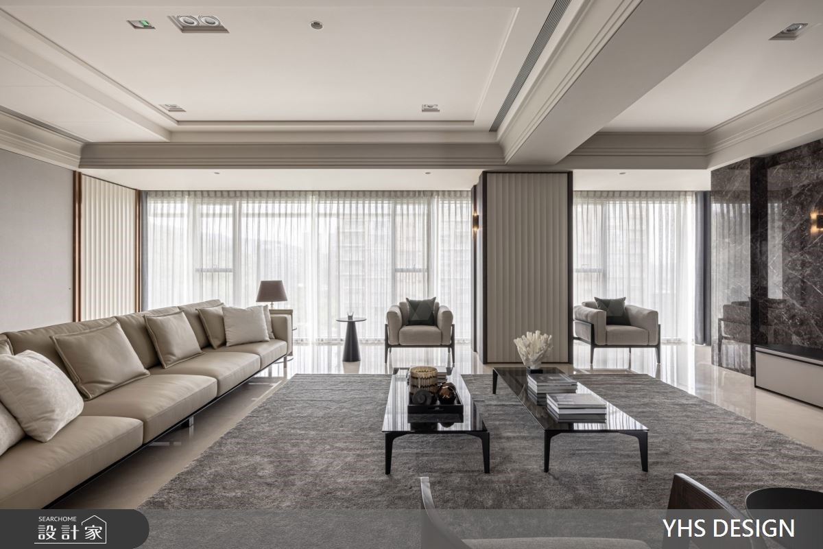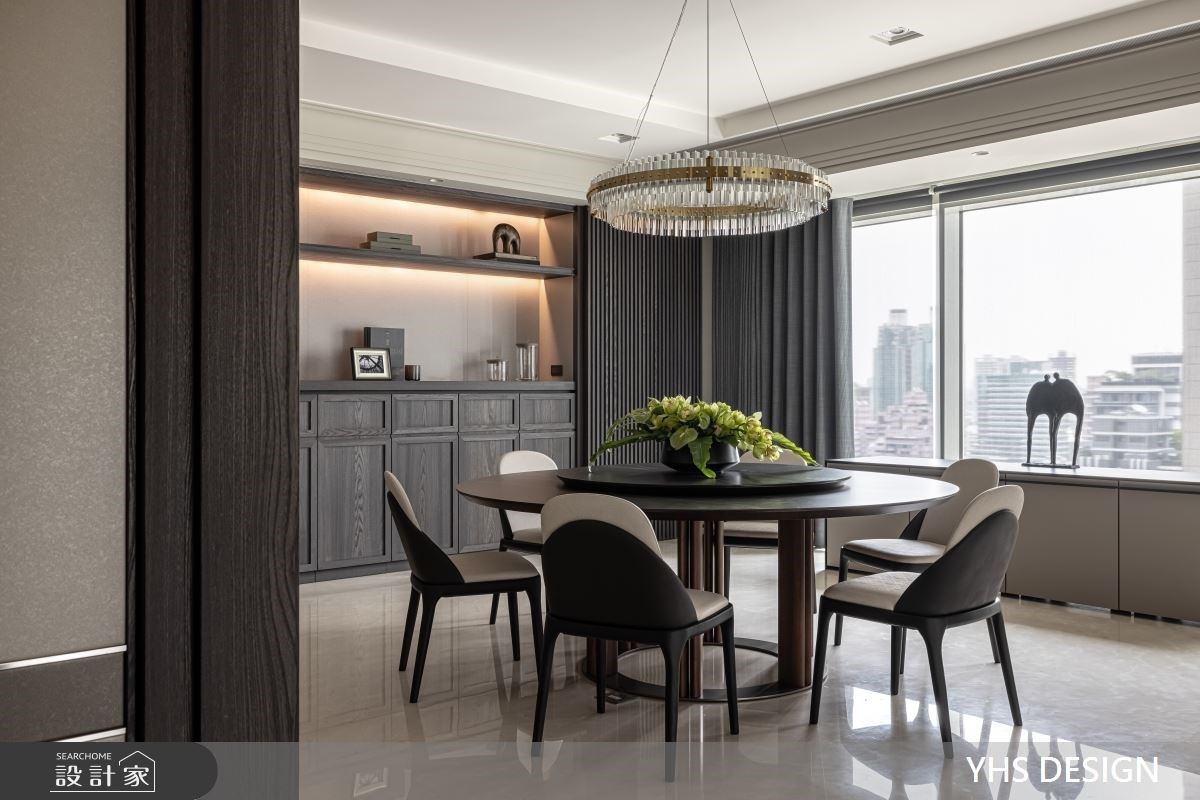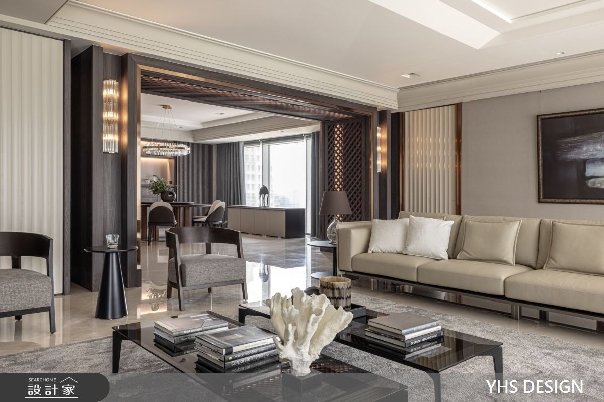 百坪的毛胚屋坐拥辽阔的窗景绿意,且位于极佳的地理位置,杨焕生、郭士豪设计总监发挥居宅的优势条件,将四季更迭引入室中,赋予新古典宅非凡的豪宅气度。 新古典宅内选用大理石、镀钛金属堆栈精致大器的面貌,同时运用家饰软装的和谐选配,巧妙融合英式风格与现代元素,铺叙丰富的空间表情与深厚底蕴。以开放式公领域为设计主轴,将视觉坪效最大化,并透过大型ㄇ框设计区隔客、餐厅空间,沙发背墙则以深浅交错的造型浪板,藏匿私领域门片,于弱化场域分野的情况下,悄然升华了家人间的互动情感与温度;其次,为了使设计美学漫溢于每一隅空间,不仅于电视墙面铺设深色石纹,酝酿沉稳大器的空间质感,更将造型浪板的立面表现延伸至梁柱外侧,形塑生活与美感的融洽结合;最后,用餐空间以大型圆桌传递家庭圆融的美好意象,上方悬吊灯饰则与其相互呼应,挹注一丝柔美细腻的弧形语汇。