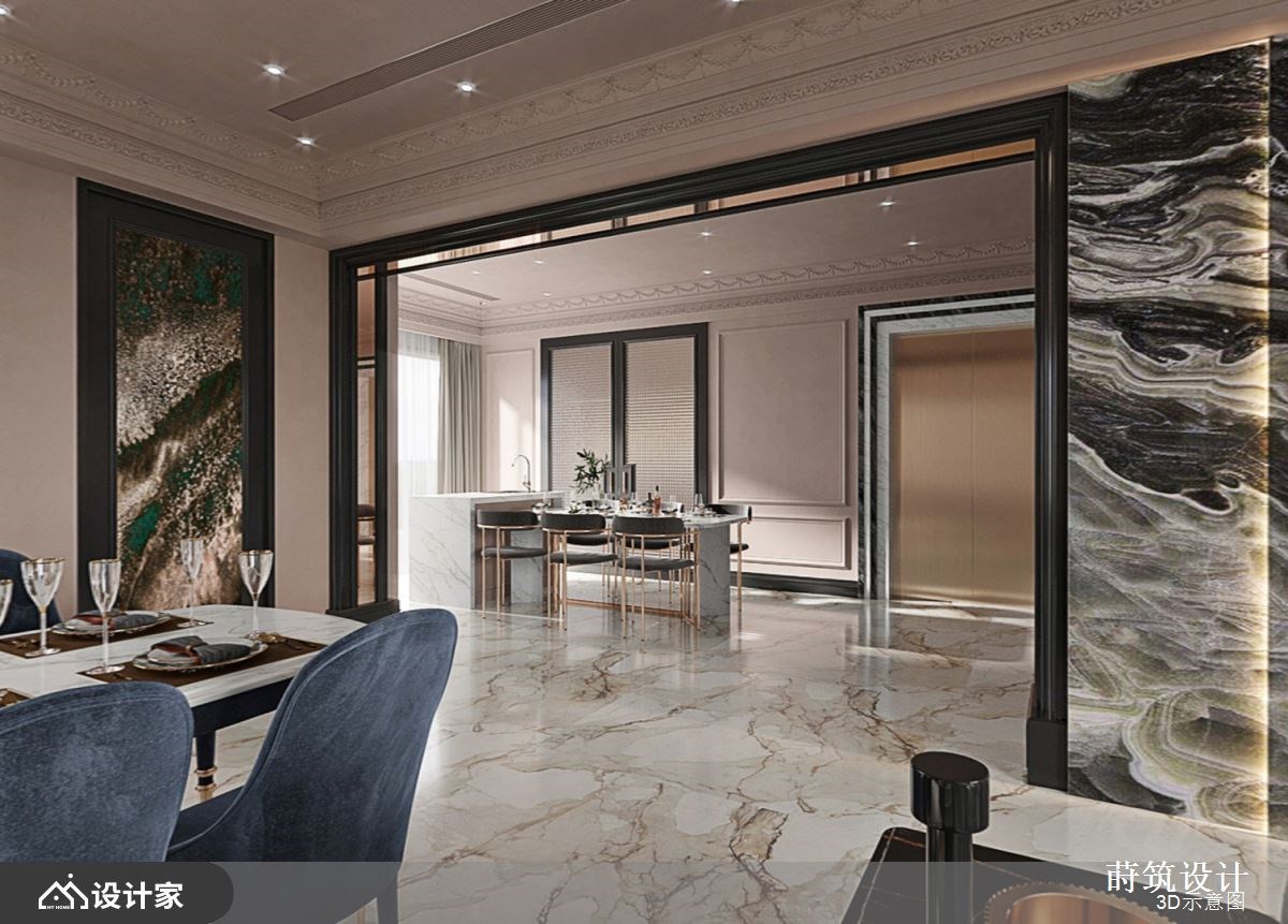 人生来到下半场,家人的团聚时间与个人的自在空间,成为住宅规划的必备重点。455平米混搭风别墅的业主,考虑到退休生活的惬意氛围、小孩成家立业的未来可能,以及年迈父母亲也能同住,因而邀请设计师融合法式古典和现代风的精髓,分层打造美好的独栋楼设计,实现多代同堂的居住想象。 一楼设置开放式的客餐厅,让亲友可以轻松团聚,享受柔和的自然光,而贯穿公领域的干燥玫瑰粉色,搭配天花线板、黑色罗马柱,以及沙发背墙的热带丛林墙纸,营造与众不同的异国情调。客厅电视墙妆点优雅的黑白石材,并结合微微透出的温暖灯光,形成气势磅礡的立体墙面。 餐桌和中岛吧台采取白色石材桌面,与地板纹理相互辉映,提升空间的奢华感。二楼起居室延续客厅的法式古典主题,同样以热带图腾墙纸,为家居带来活泼视觉,而沙发背墙的两扇镜面推拉门,打造了墙面的丰富层次,门片关起时能够阻挡冷气外流,兼具美感与机能性。 小编的最爱 男女主卧利用法式古典风格,给人细腻又大气的空间气质,并藉由灰色与米色的颜色差异,创造完全不同的居室质感,让每个人都能拥有梦想的私密区域。