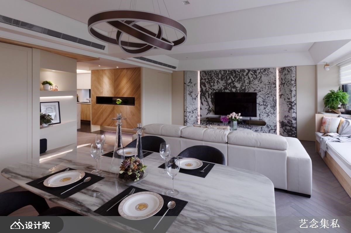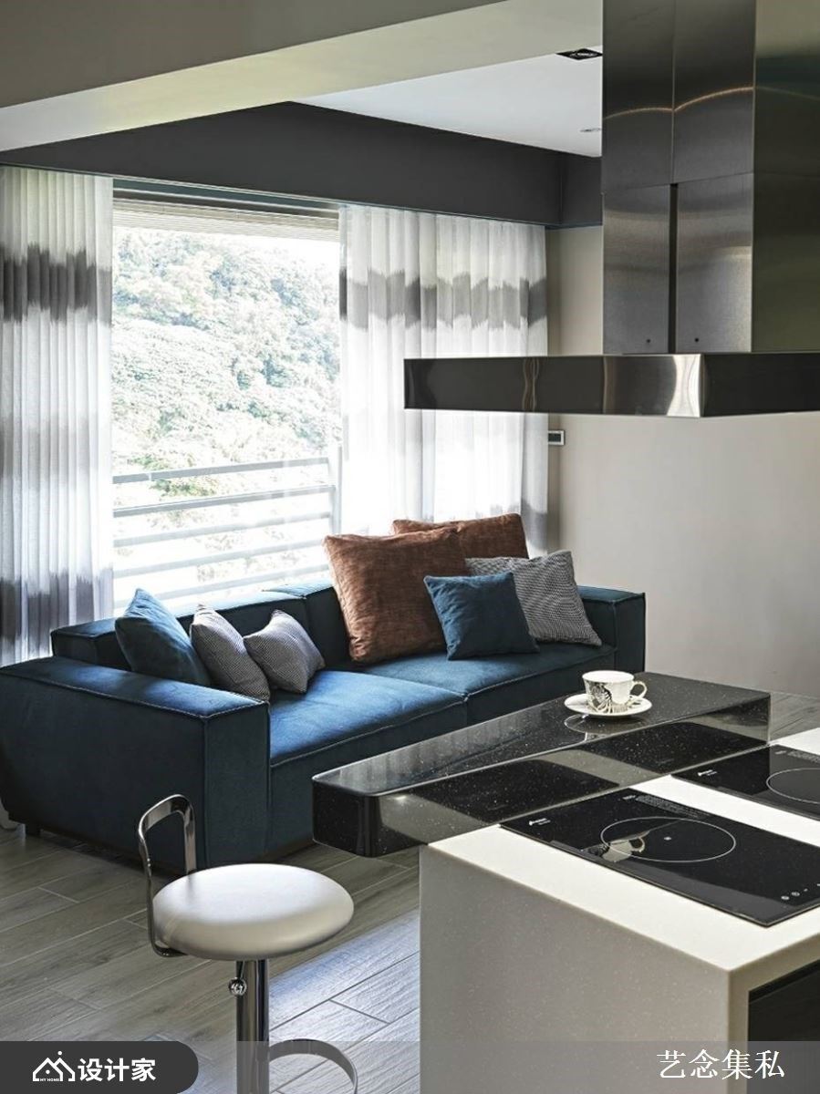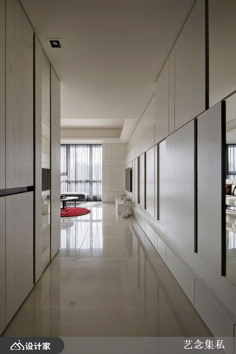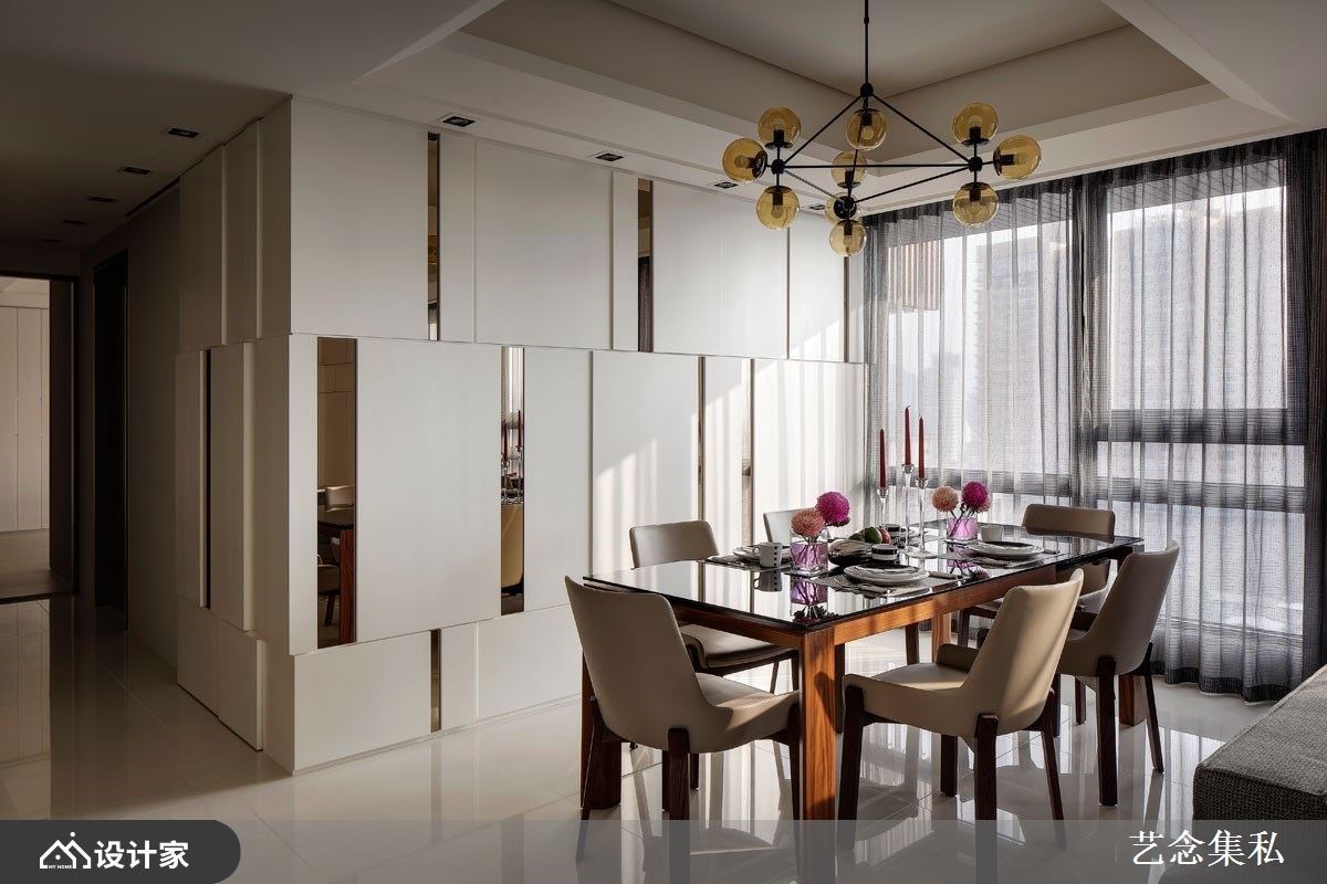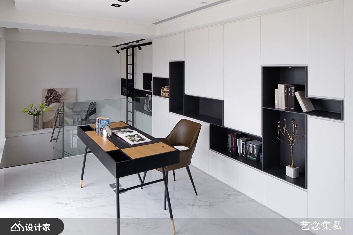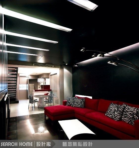 居家配色千变万化,而其中对比色多半会给人强烈的视觉刺激,很少有住宅会大胆地使用对比的搭配,而艺念集私空间设计张绍华、黄千祝总监则将黑与白借由不同建材与比例搭配,做了最完美的对比色范例。保留白色大面积天花板,搭配带点浅色纹路的浅色磁砖形塑轻柔的空间,而在建材包边上则使用黑色铁件更凸显设计轮廓,搭配深色的家具与地毯,创造视觉景深之外设计也有了主从之分。白色柜墙在中段加入黑色开放格柜,错落排列让单调的收纳变得别具设计感,也可搭配红鲜艳的色彩,让黑白设计有了更具识别的时尚角度。