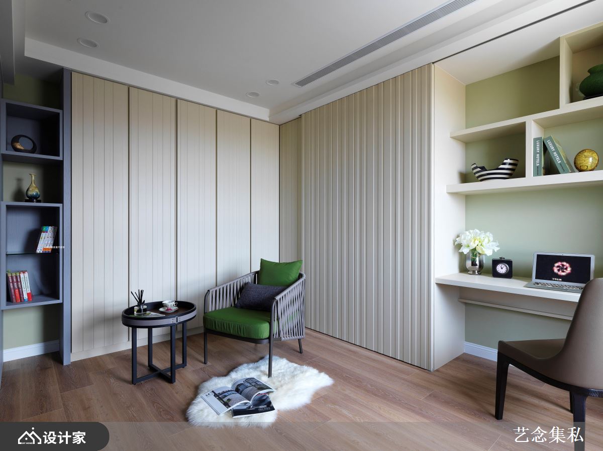 随着时代的演变,越来越多居家装潢时会希望预留一间房、或在公共区域规划书房空间,以适应新的生活型态。艺念集私空间设计张绍华、黄千祝总监跳脱一般办公空间的设计,在基本的工作机能之外更添加不同元素创造带有疗愈感的书房空间。开放式书房用一道双面收纳柜与客厅区隔增添隐私性,办公桌椅外还可以摆放单椅让工作疲惫时可以换个地方休息;独立书房设计整合收纳机能,利用空间的立面规划收纳墙让公领域收纳能够被分散,能有效优化空间感。不同的配色与柜型整合的造型收纳墙,也成为家中饶富机能的端景。