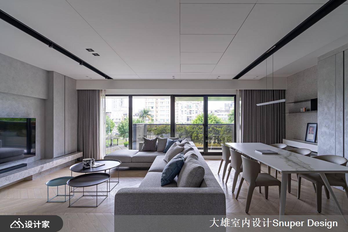 源起 邻近公园、于都会城市中构筑一处逸居,从窗户向外眺望,视线停留于一片宜人的树梢景致,领受这股清新绿意,当生活融入自然情境,心灵随之沉静下来。室内空间轴线与户外美景平行前进,模糊形体上的建筑框架,产生了流动、最自然的对话。 空间里透过灰白色调、低彩度的基底,作为创作画布,形塑明亮、清爽的场域气息,伴随特殊漆、水磨石与木质等温润肌理的妆点下,延续户外的自然景致,同时蕴藏清新、简约的内涵,娓娓道出家的故事。