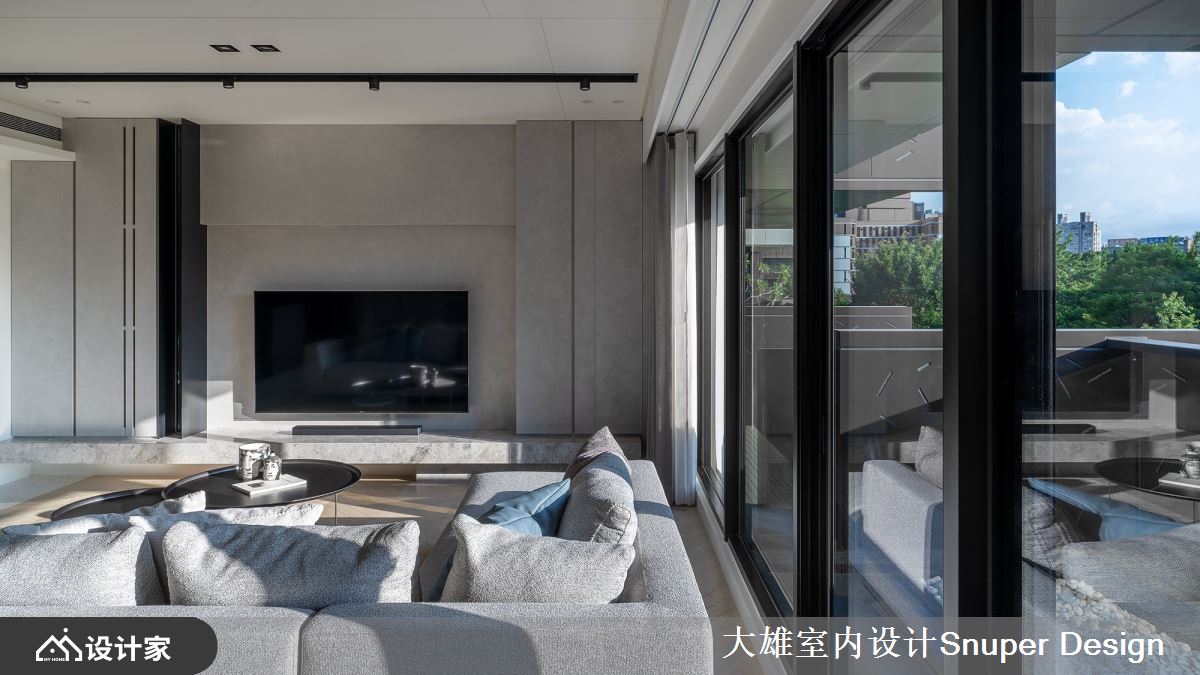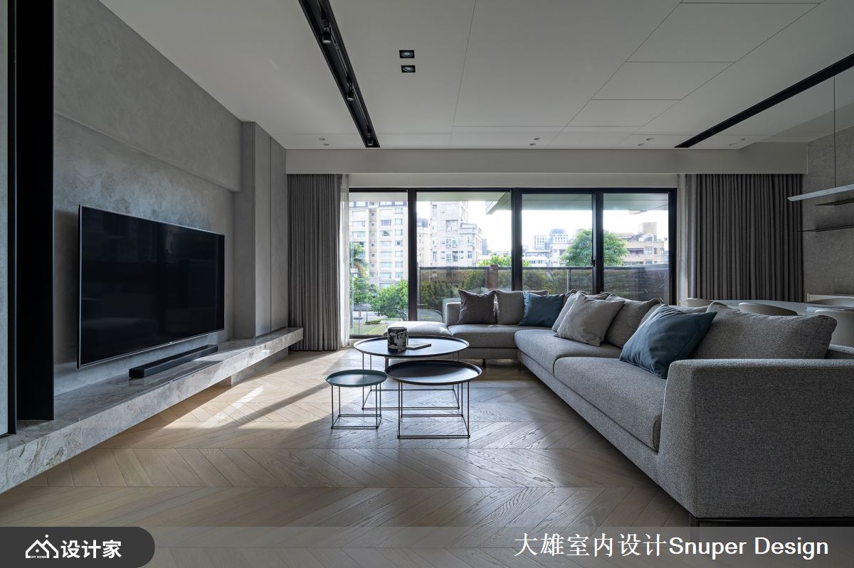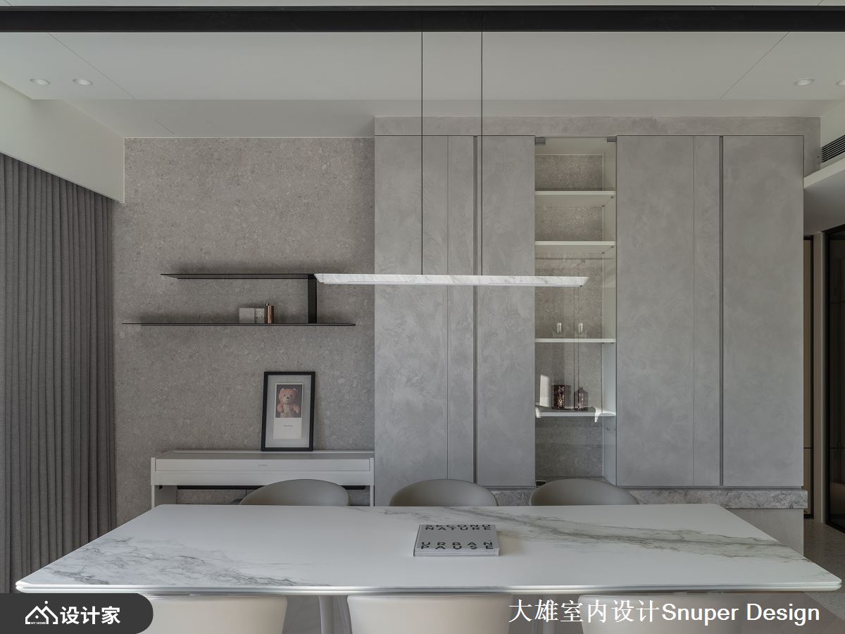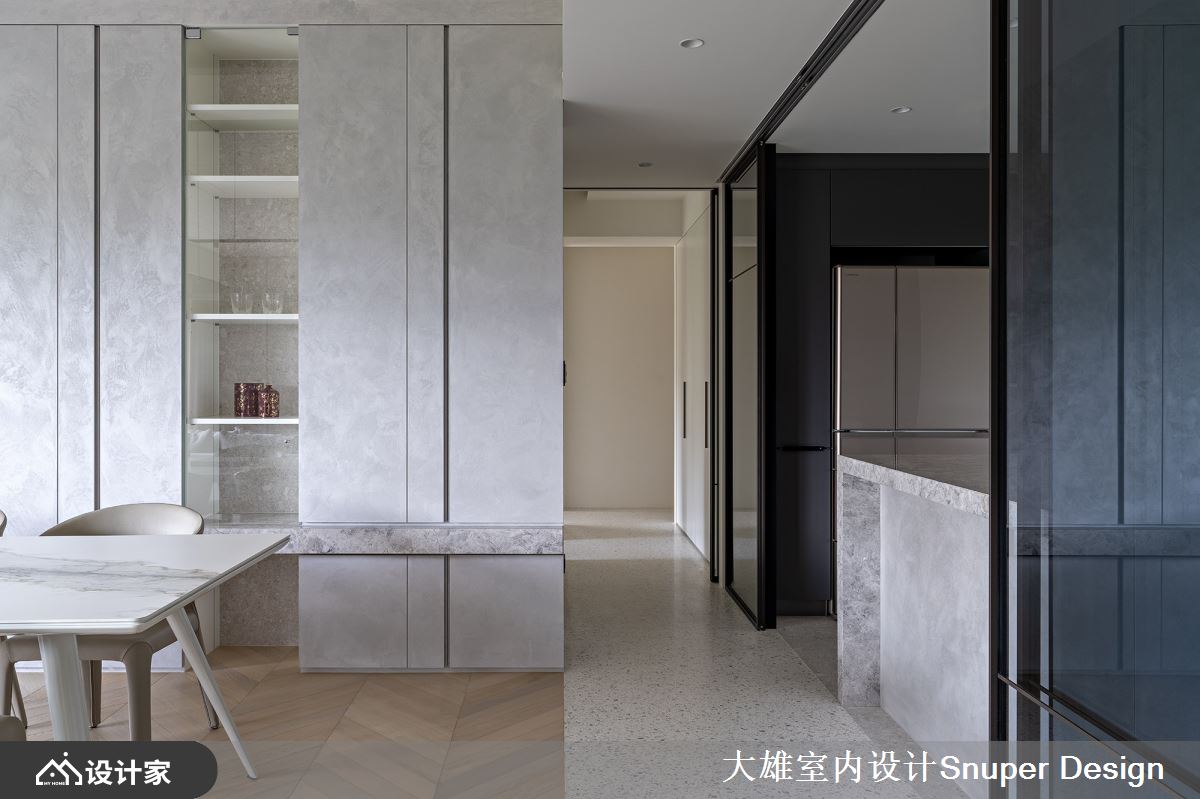不同于以往作品,整体空间降低石材的比例运用,藉由温暖的中性色调安排,自然风光的陪衬,谱写舒适、动人的私宅故事。公领域以人字拼木地板为基底,电视墙衬以特殊漆质地,透过灯光、细致沟缝的描绘下,下方石材台面的延伸,渐层立面下呼应自然朴实的本质。