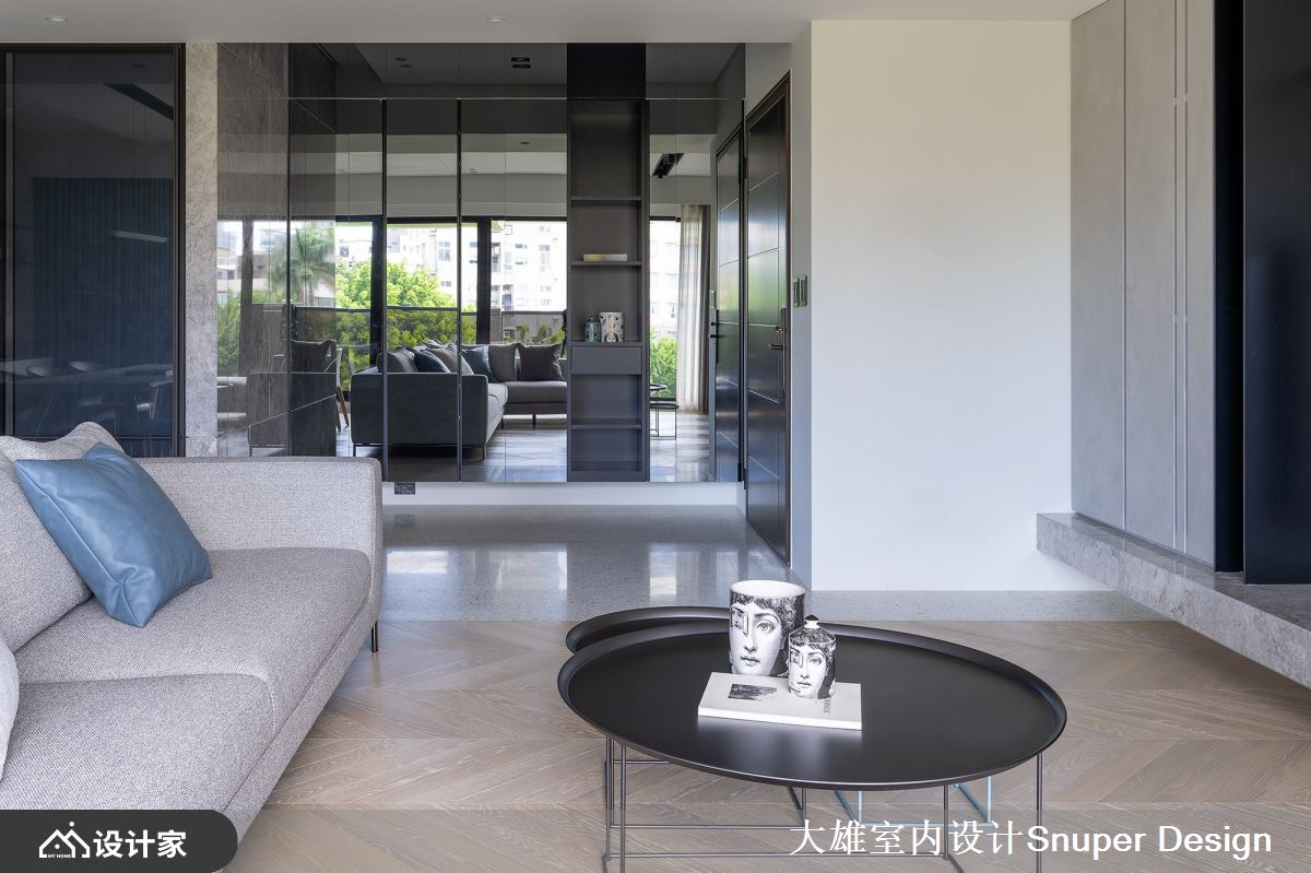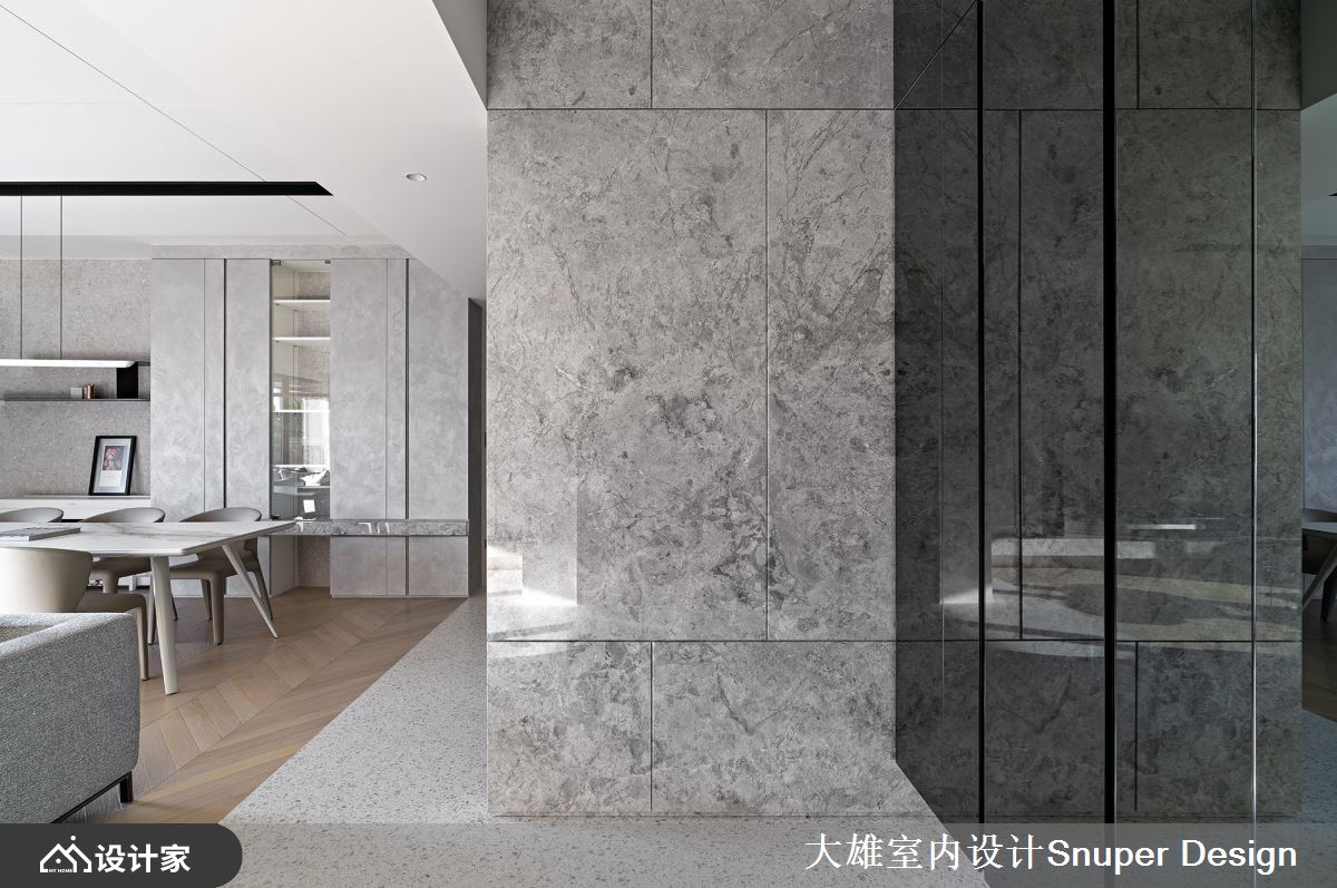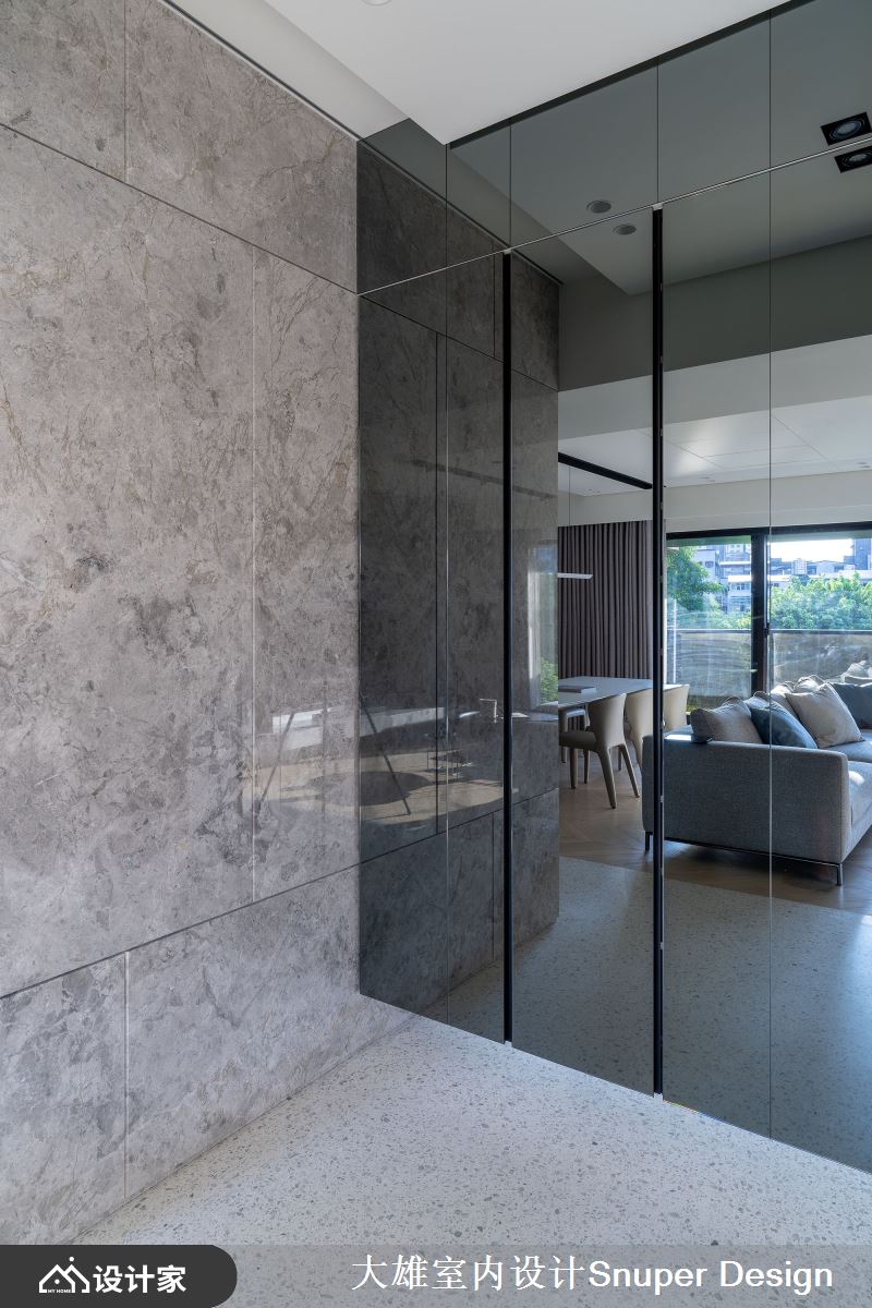 玄关落尘区以水磨石铺陈地坪,衔接公领域的人字拼木地板,交织一片温馨质地;透过灰镜铺设出透亮的鞋柜风貌,镜面将户外的绿质生命力倒映入室,一踏进居家空间立即领受心旷神怡的大自然力量。