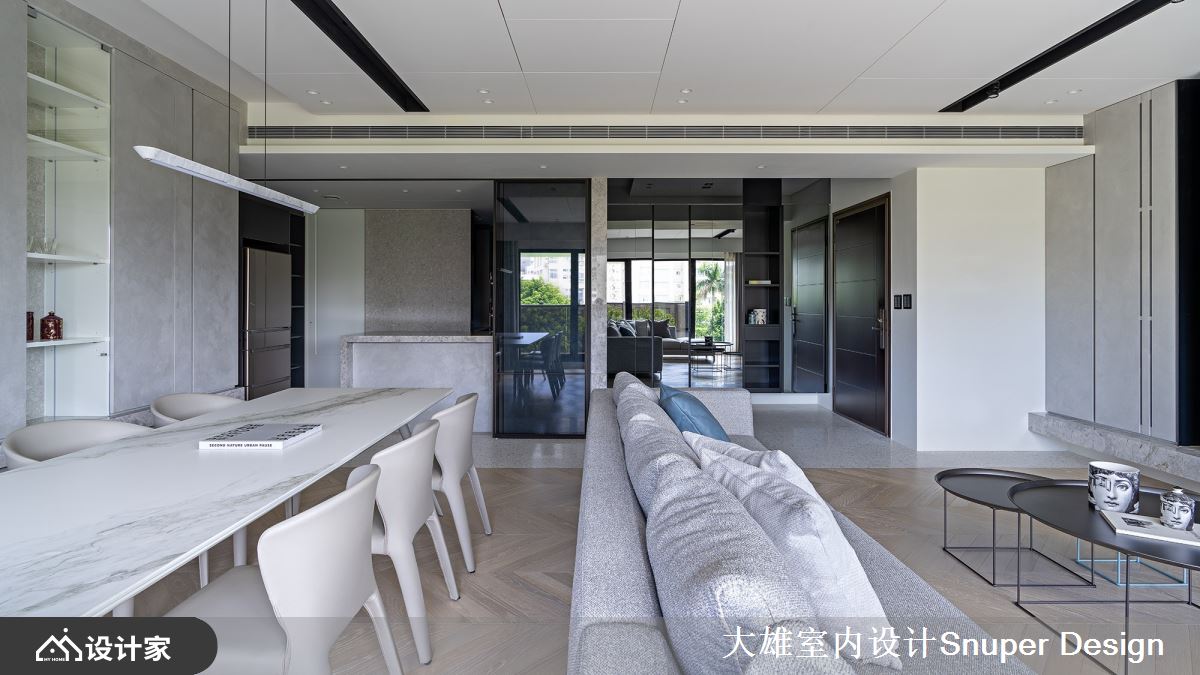 客、餐厅位于同一轴线配置,在落地窗的设定下,透出城市建筑与树梢视线,打破室内外界线,空间尺度随之舒心开阔。而室内在镜面投射与窗景的两侧布局下,彷佛深深被自然绿意拥抱着。
