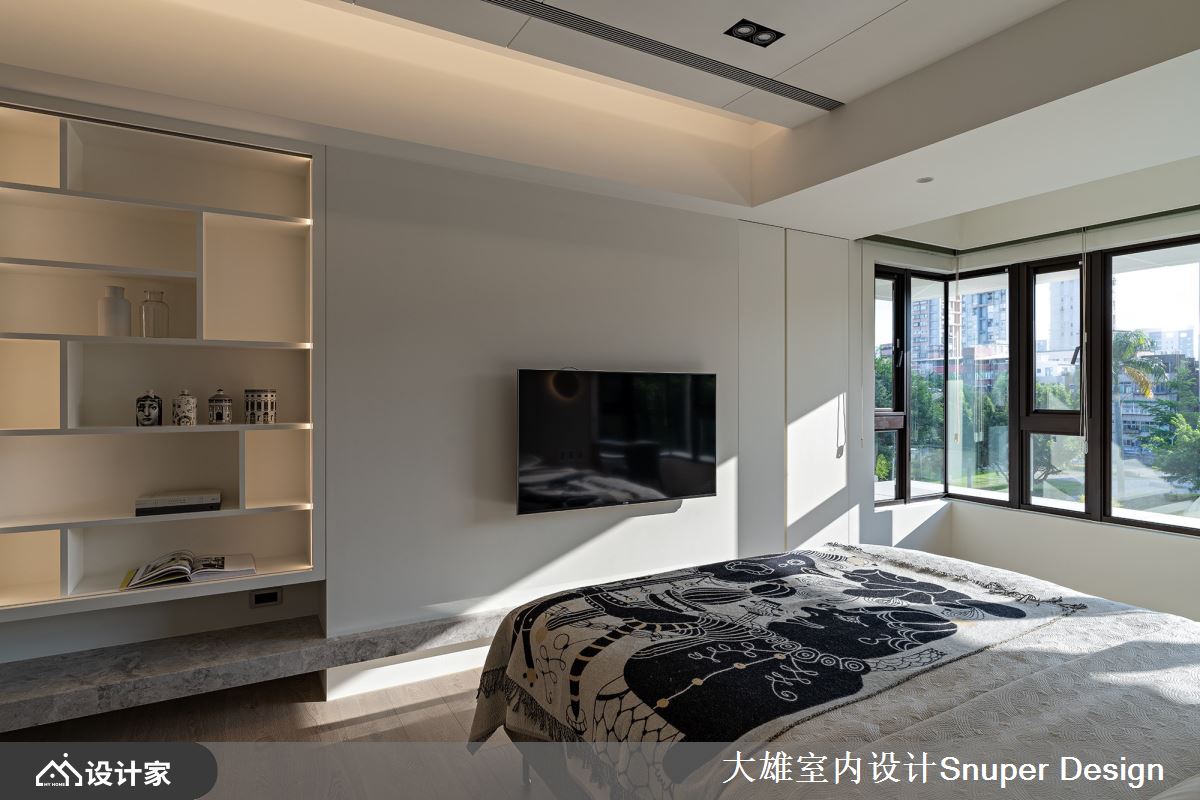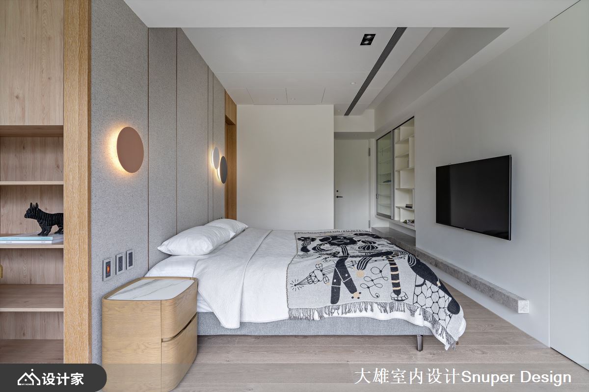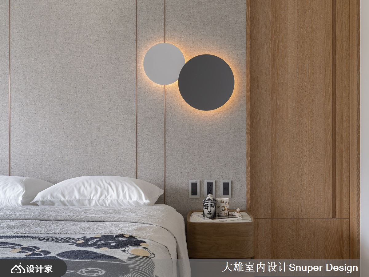 延伸公领域简约、高雅之气度,并透过窗景传递清新绿意。居室床头布织纹理细腻的交错着,搭佐来自西班牙的 VIBIA 壁灯,圆形造型勾勒出当代简约的美好意象,烘托雅致的人文气息;电视墙以大量留白,下方衔接细致的石材平台,对比的质地特性,赋予空间深刻的对话。