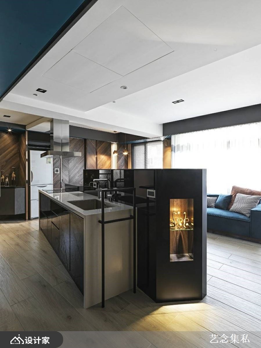 公共空间以电视墙结合中岛吧台双面墙界定领域分野,多元又实用。