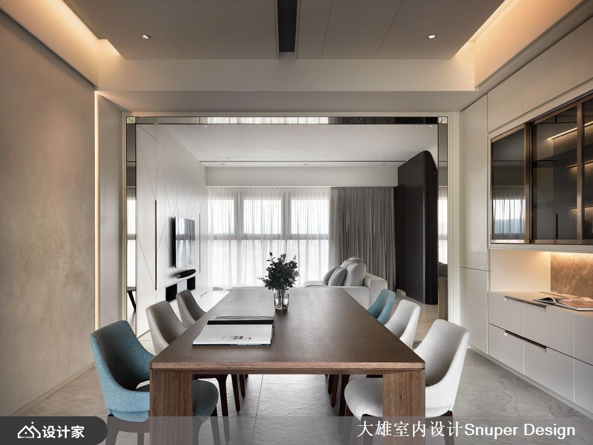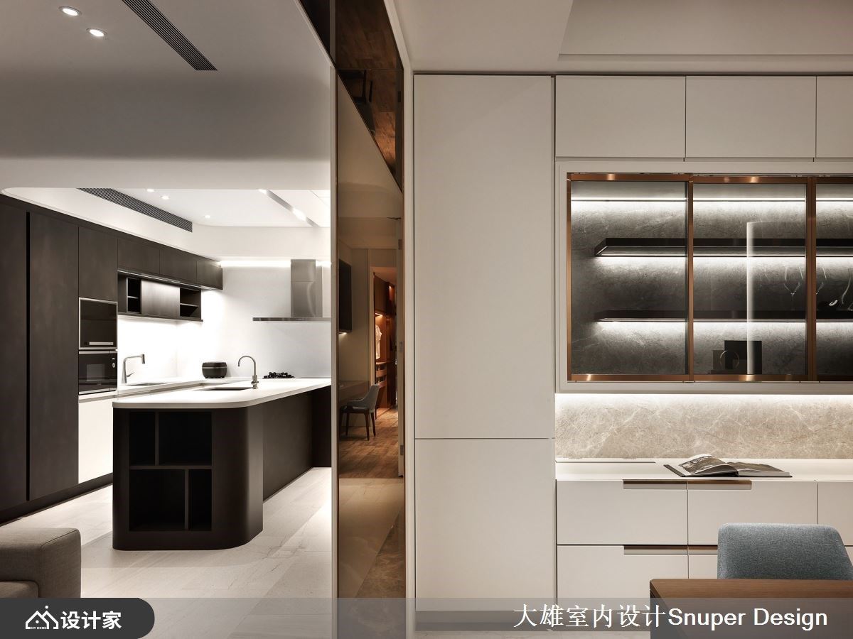 330平米的循着建筑特性与优异的楼层高度,探索空间与环境对话的可能,在全然敞开的空间布局中,引导视野接驳天际线,通过绝对无碍的尺度与材料精心铺排,与天地壁融合弧形收角,设计与生活更精致的辉映,让岁月细微的流淌中,记叙人与环境的相互关系。 进入空间后,景观露台淡化封闭感,经由玻璃窗的引导,辽阔窗景尽入眼帘,公共区域取消制式电视墙的存在,不再定义空间的方向性,达到以景为要角的目的;木质立面依序以木皮导弧角、镀钛框构虚实交错的展示柜体,让立面展现层层递进的意趣。空间布局清晰明快,客厅与餐厨区域对望,廊道尽头延伸私领域。尽力确保每个空间机能完整,拥有其各自独立特质,并藉由环形动线整合所有领域,进而相互沟通与互动,体现一种贴近生活态度的设计脉络。 通过茶镜制作而成的框体,巧妙界定巧妙界定餐厅与起居室,在视觉投射、延伸情境,场域层层蔓延,创造渐层景深。延伸客厅柜体的演绎,餐厅立面打造通透玻璃柜体,光轻洒在石材基底、镀钛描绘出细腻线条,交织当代精致美学之风采。 小编的最爱 主卧室以去繁为简,同样注入柔和的弧形元素,并运用线条层次勾勒天花板的美学细节,木质背墙以对称的方式再打上柔和的间接光源呈现,对面同样挑选弧形线条的柜体作为呼应,让整体空间氛围更加走入人心。