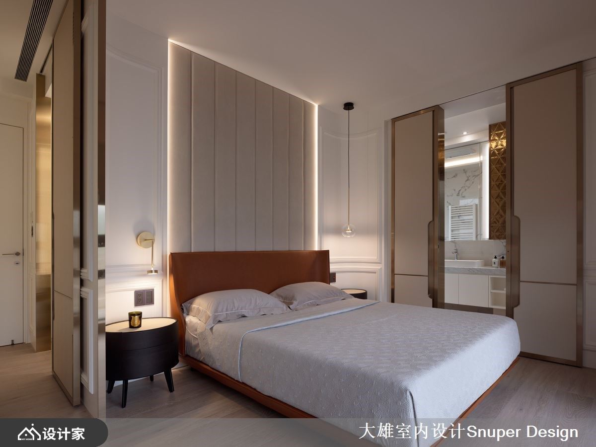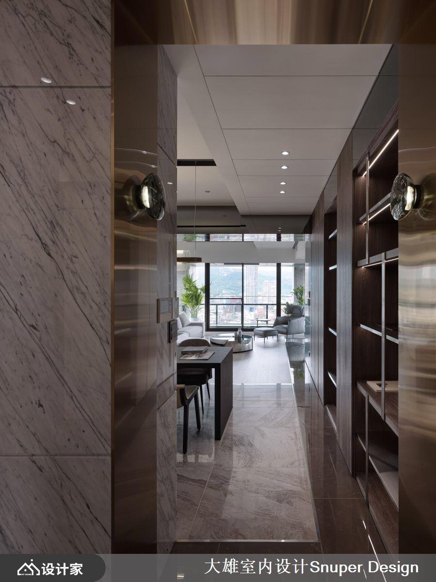 165平米现代风宅邸,享有楼高的绝佳视野,伴随三面采光的设计,接引户外山峦、溪畔与都市建筑张力;室内则以开放串连的动线布局,辅以石材、木纹、镀钛、铁件等复合式材质层层堆栈,虚实相兼的视觉演绎,成就内外氛围相融的美学场域。 入室后的玄关,透过石材铺陈壁面与地坪,镀钛金属描绘大梁与妆点壁面,体现简约大器的迎宾风尚。开放公领域里,透过L型动线串连客、餐厅,舍去多余墙体的技法,让空间尺度随即开阔,加上天花板大梁结构饰以镀钛金属材质,映照与延揽户外风光,内外相融、交织迷人景致;地坪则以石材、木纹界定领域机能,透过镀钛收边,展现细致的工艺手法。 中岛整并餐桌定义出餐厨领域,饰以弧形玻璃、镀钛材质的现代感吊灯,倾注人文设计的语汇;公领域的角落规划开放书房区,运用木质柜体与书桌,创造安定、沉稳的阅读气息,搭佐迎窗的空间设计,可享有绝佳的开阔视野;而书桌与餐桌的错位摆设,构筑丰富、多元生活的起居特性。 小编的最爱 主卧利用白色调衬底,线板描绘出古典优雅气息,佐入镀钛、金属与砖材,搭配局部灯带的演绎,创造古典与当代相融的休憩场域。