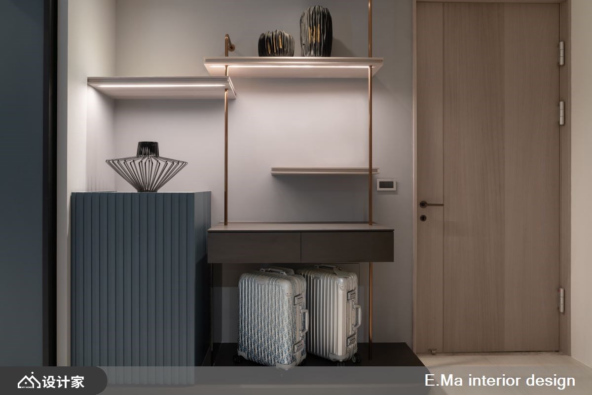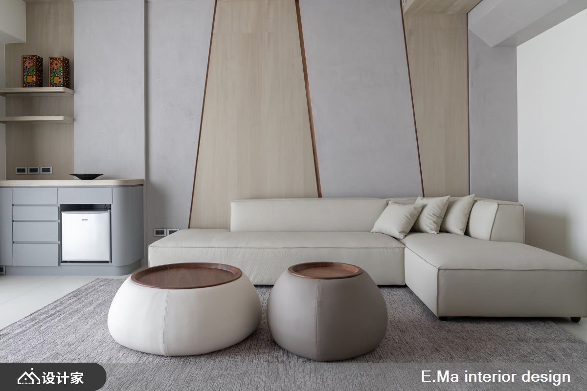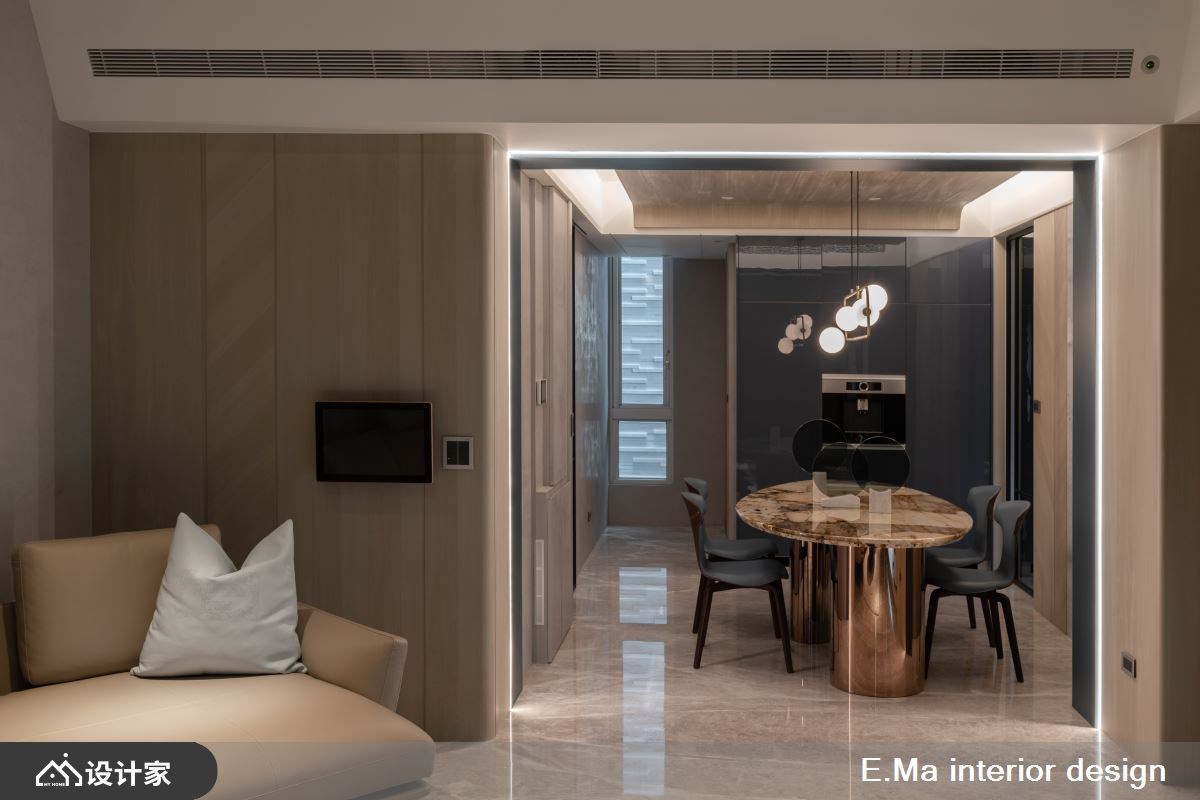 1楼玄关规划两个出入口,设置会客室具有家教教学等功能,内玄关导引入内可保留隐私,大面鞋柜满足全家人海量收纳,穿鞋椅也让穿脱更安全与舒适。2楼串联客厅、餐厅、厨房,客厅以涂料搭配天花木质感,流泄一股温润感又好清洁,悬吊的石材电视墙视觉轻盈,采光无阻碍也型塑居家端景墙。通往餐厅ㄇ字型门框,跳色手法与灯光映照制造仪式感。L型厨房以玻璃区隔轻食区及热炒区,料理动线更顺畅。
