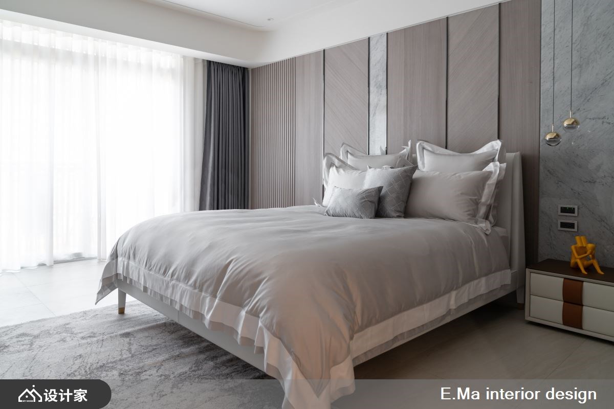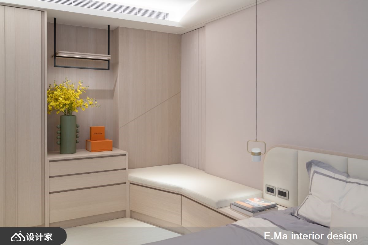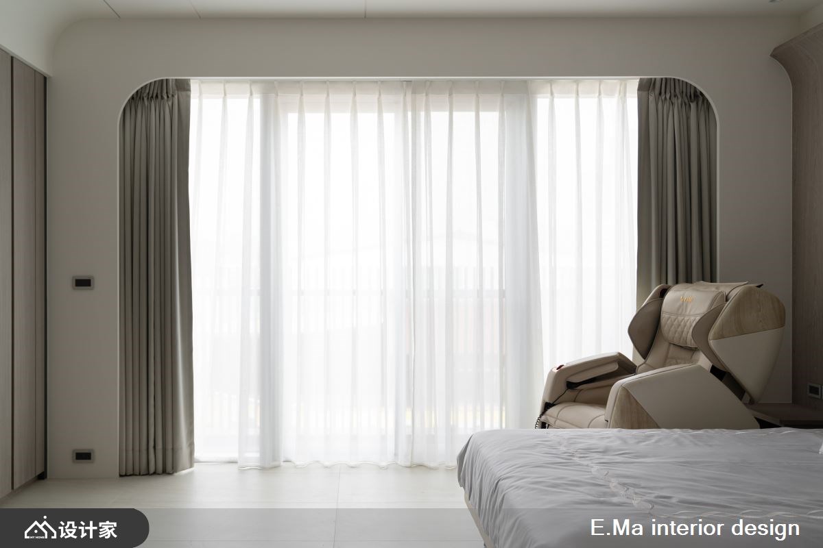 3楼主卧结合睡眠区、更衣室与主浴,楼梯旁时髦mini bar小酌或置物皆可,睡眠区加装玻璃拉门隔绝噪音,天花板、壁面与门框圆弧造型,增添圆润气息,并巧用石材、镀钛金属与莫兰迪配色,烘托时尚的精致质感。4楼移动墙面,为两间女孩房保留宽敞的空间,柔嫩色调予人舒适感,床头边设置飘窗增添休憩氛围,以木质感打造收纳柜与线条利落感墙面,空间营造丰富表情。5楼和6楼长辈房延续柔和色彩与温润木质感,创造舒眠场域,并保留宽敞走道动线更顺畅。