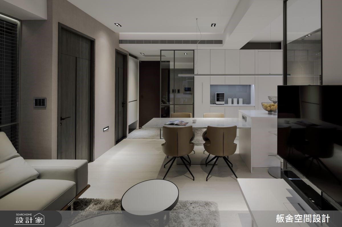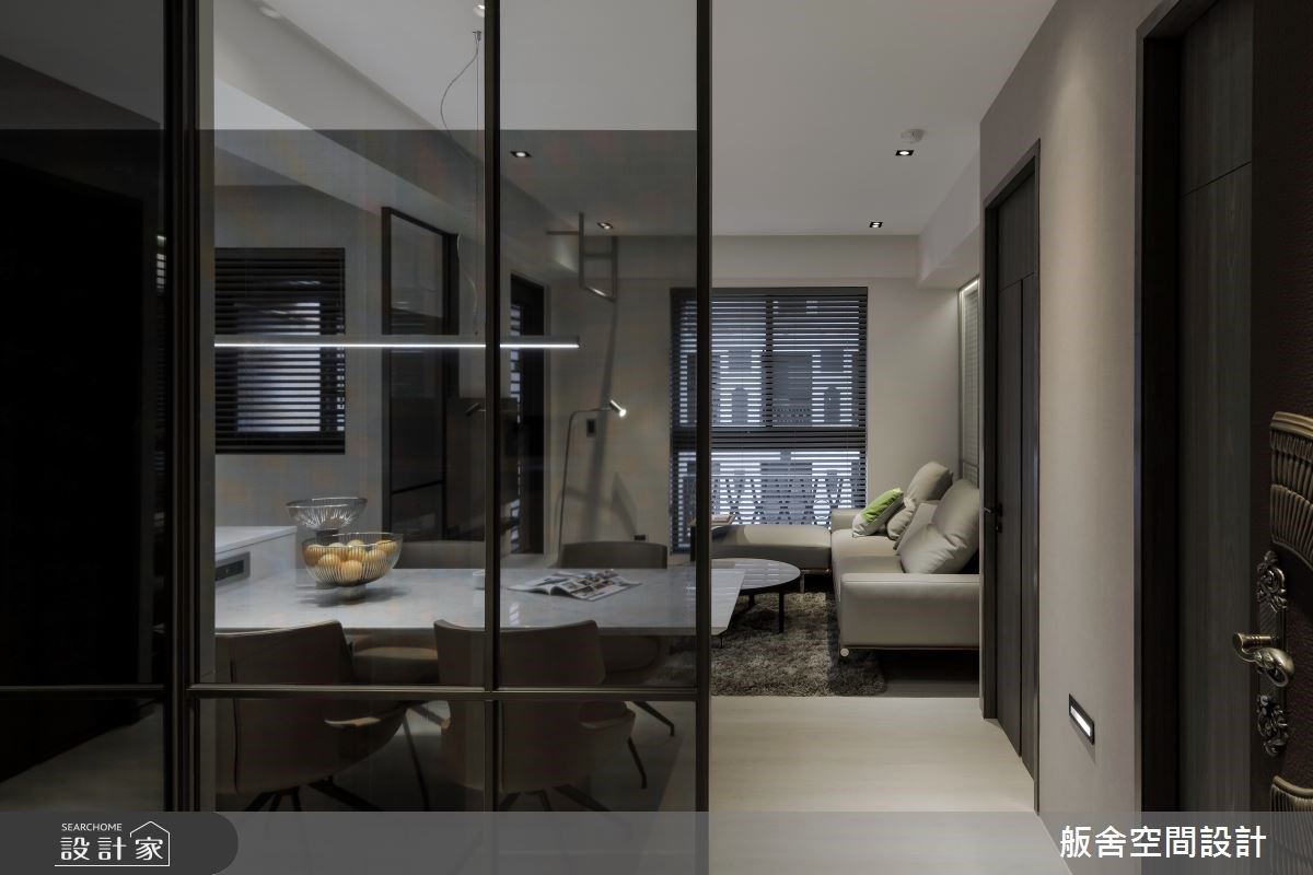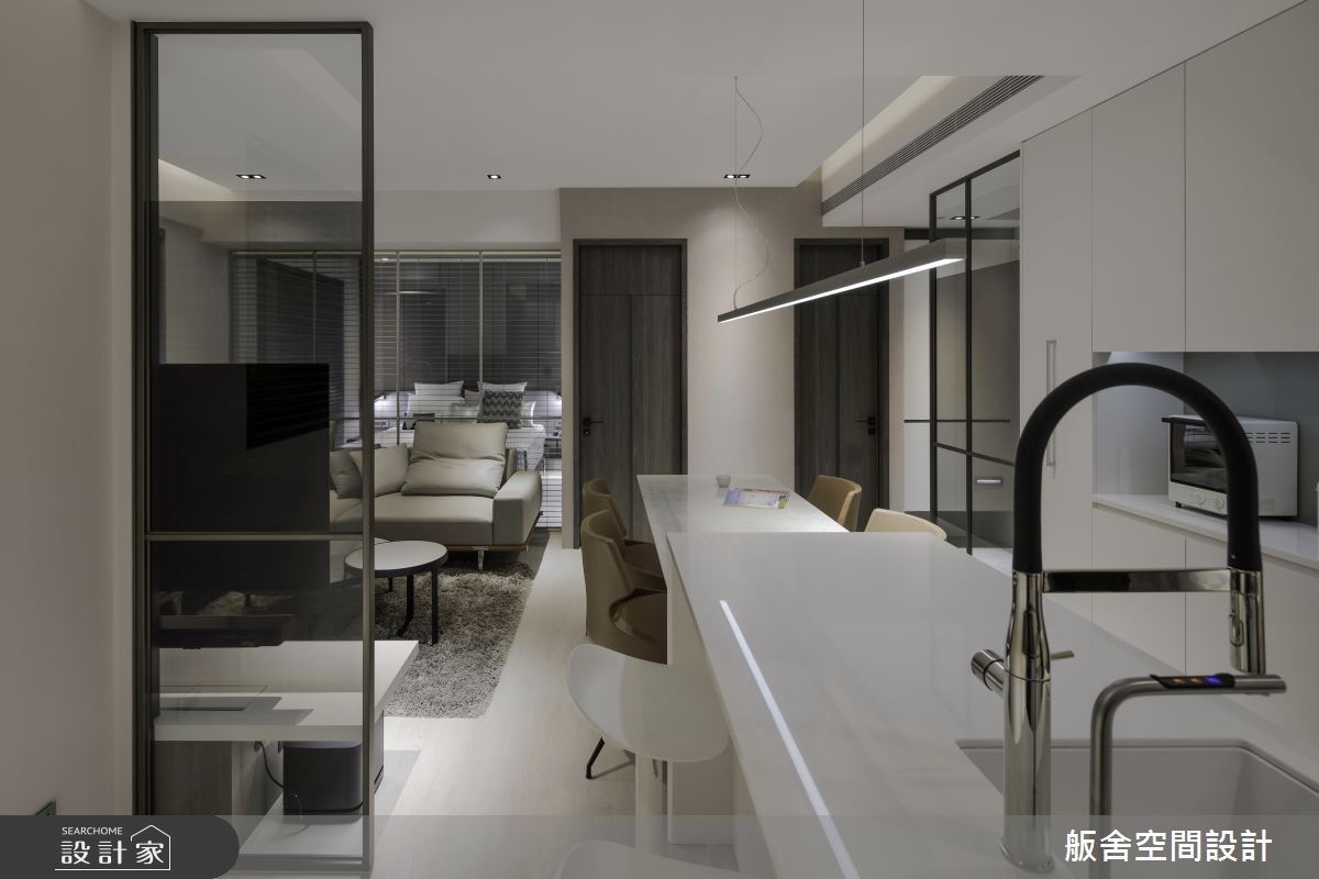 此案为15坪新成屋,舨舍空间设计 颜善松设计师解放原有的既定隔间,以穿透式玻璃作为场域分野,有效串联充沛采光并延伸空间视觉,同时将格局调整为1房2厅的齐备机能,让开放式公领域为居宅设计主轴,打造一所全能的现代小宅。 入门玄关处,设置一铁件结合玻璃的造型屏风,化解穿堂煞的风水疑虑,并兼顾场域的通透性;餐厨空间结合大型中岛与餐桌,将其规划于空间中心,无形中创造了多元弹性的回字形动线,更延伸了屋主烹饪用餐时的使用台面,侧边柜体则整合电器柜机能及藏匿储藏室门片,以精致细腻的立面设计让生活美学无处不在;最后,临窗处规划为休憩客厅区,增设L型沙发满足例假日时的亲友来访迎宾需求,同时以玻璃建材结合电视墙造型,让穿透材质保留场域间的对话性,更提升亲友间的互动交流。