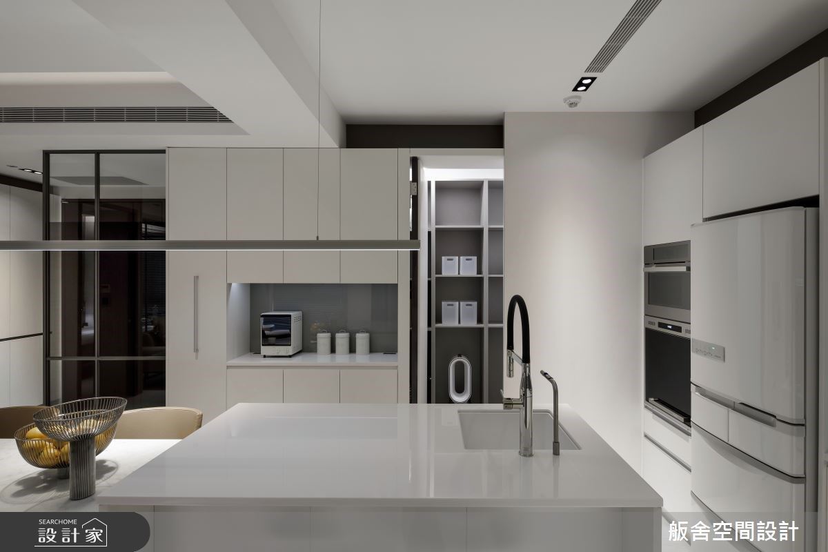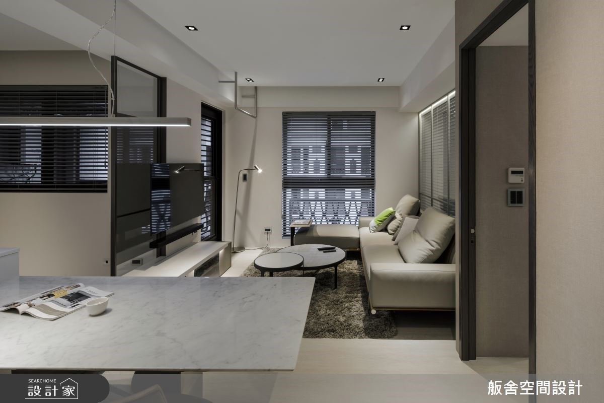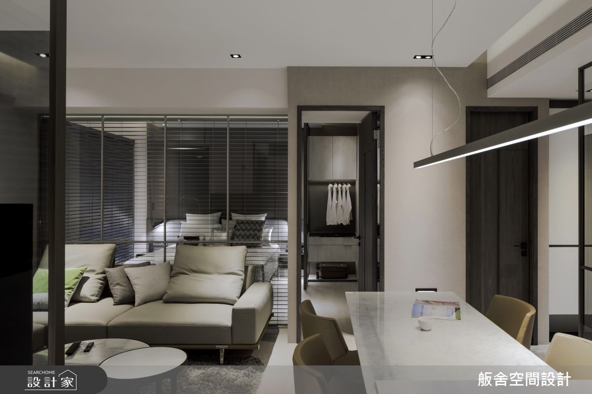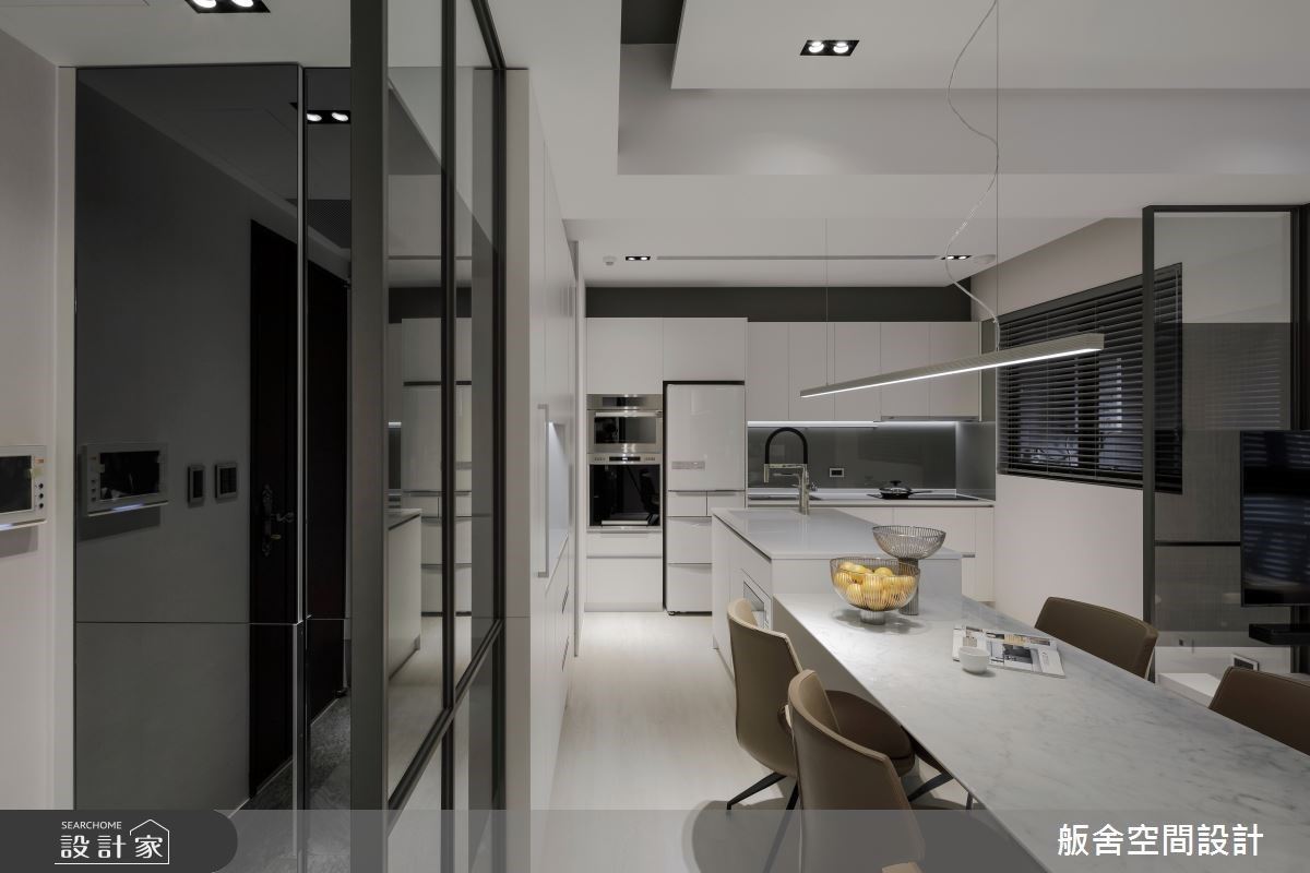 此案为15坪新成屋,舨舍空间设计 颜善松设计师解放原有的既定隔间,以穿透式玻璃作为场域分野,有效串联充沛采光并延伸空间视觉,同时将格局调整为1房2厅的齐备机能,让开放式公领域为居宅设计主轴,打造一所全能的现代小宅。 入门玄关处,设置一铁件结合玻璃的造型屏风,化解穿堂煞的风水疑虑,并兼顾场域的通透性;餐厨空间结合大型中岛与餐桌,将其规划于空间中心,无形中创造了多元弹性的回字形动线,更延伸了屋主烹饪用餐时的使用台面,侧边柜体则整合电器柜机能及藏匿储藏室门片,以精致细腻的立面设计让生活美学无处不在;最后,临窗处规划为休憩客厅区,增设L型沙发满足例假日时的亲友来访迎宾需求,同时以玻璃建材结合电视墙造型,让穿透材质保留场域间的对话性,更提升亲友间的互动交流。