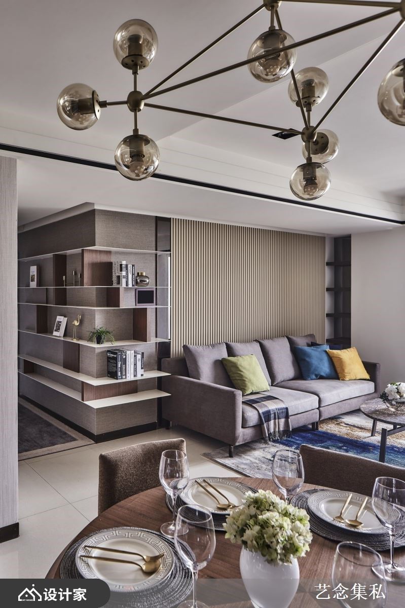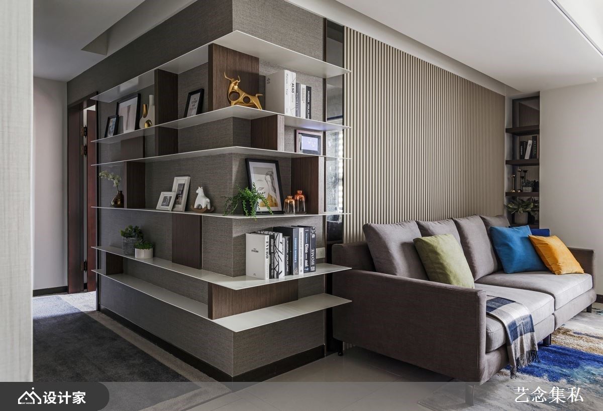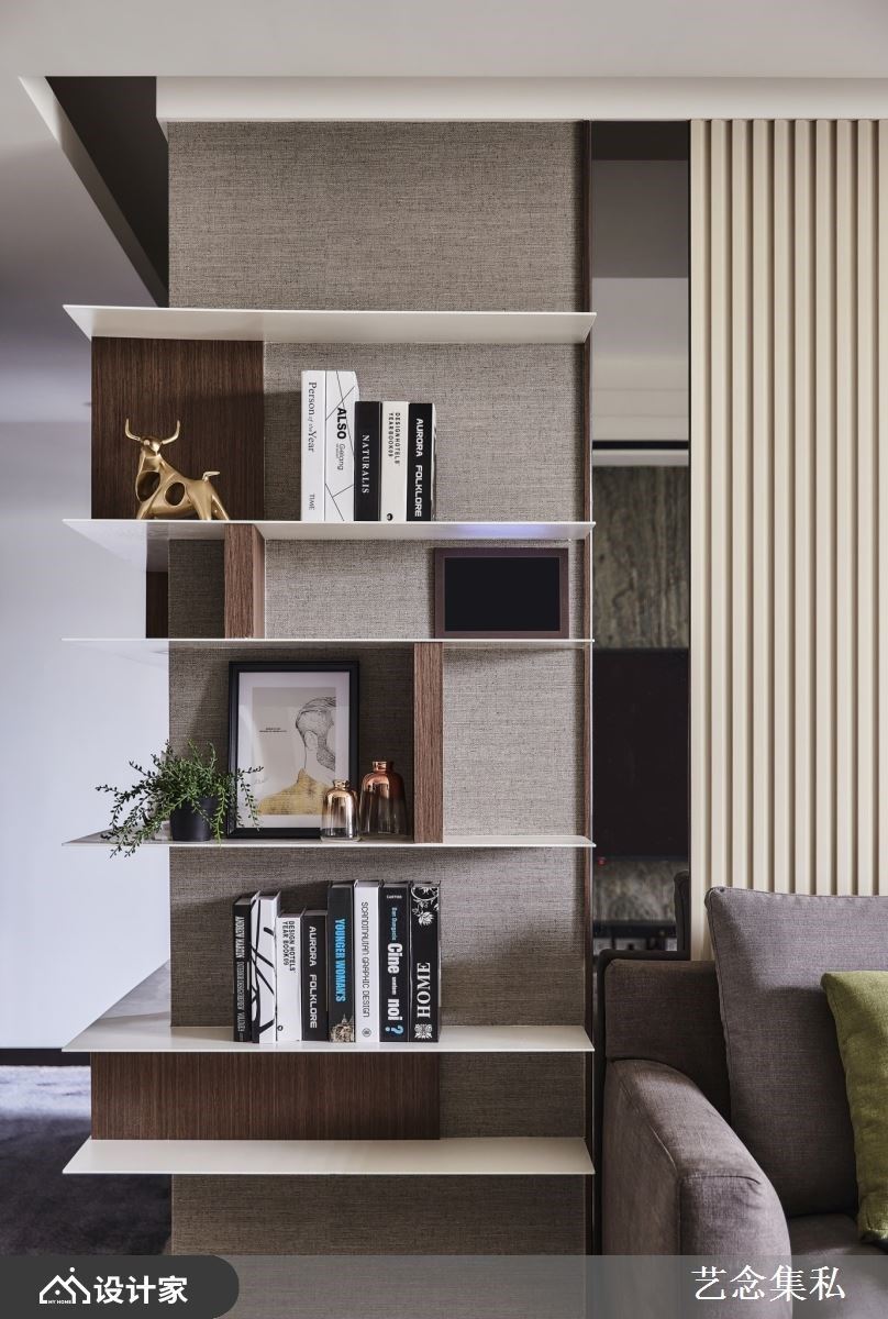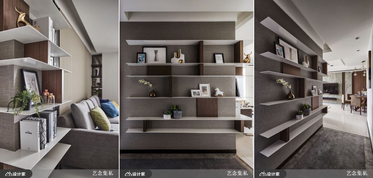 以美型包覆住宅内的收纳机能,电视墙外侧以铁艺和木皮打造开放式收纳柜,走道铁艺层板与木皮革板创造实用又美观的展示置物机能,并延伸至转角增添收纳的丰富度。居室内系统收纳为主体,利用斜角设计打造开放式收纳柜,活用畸零空间满足各类收纳需求。