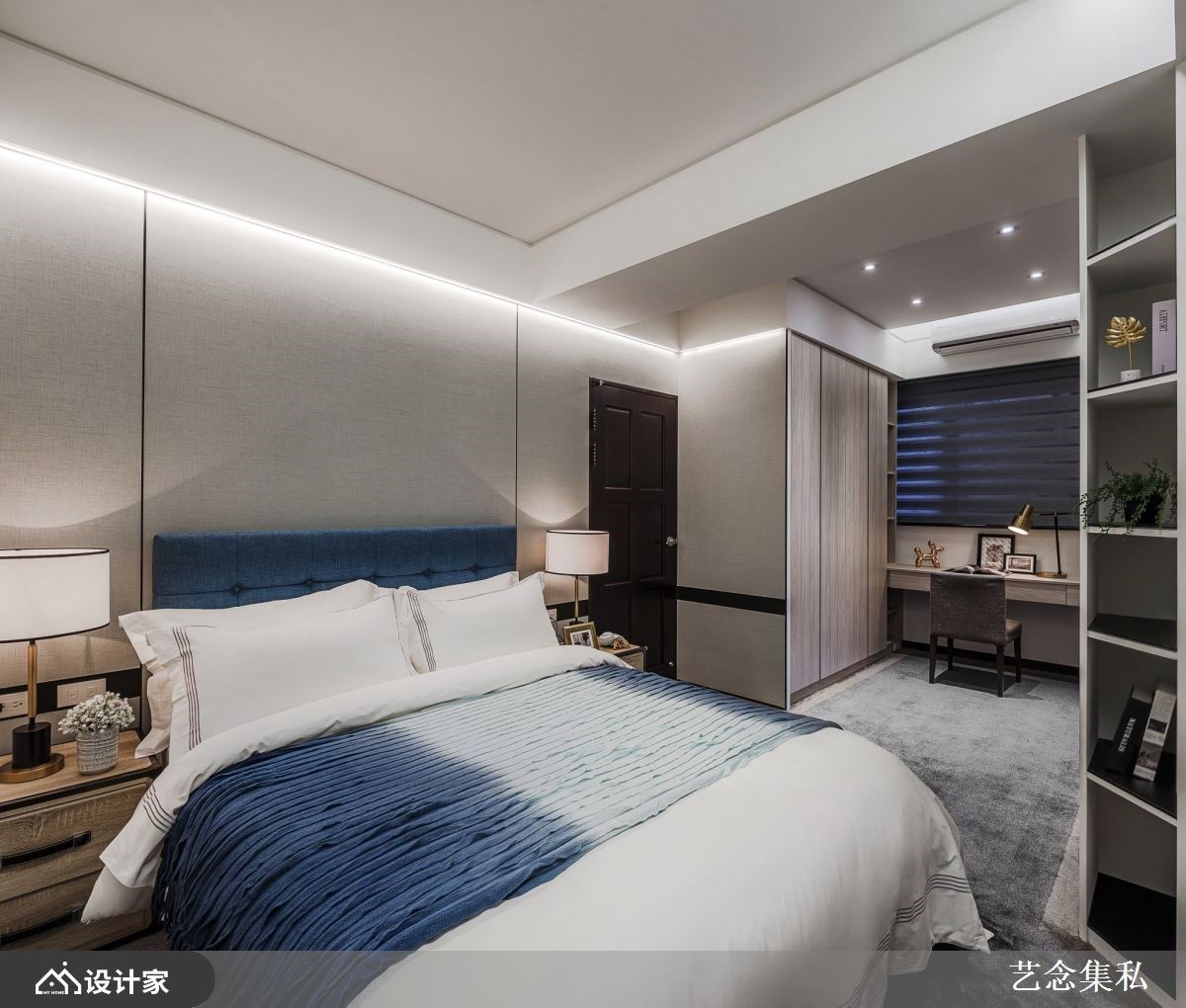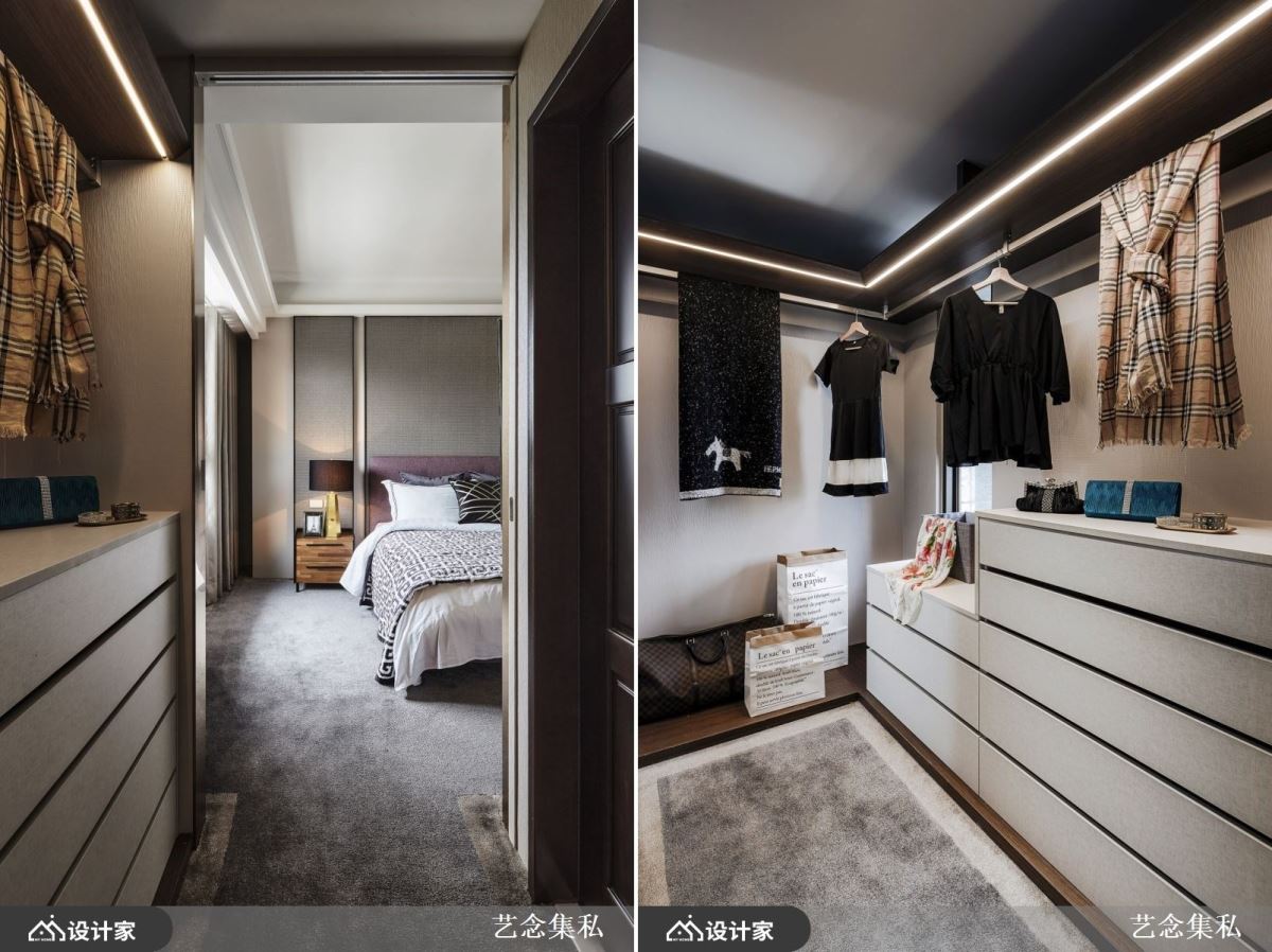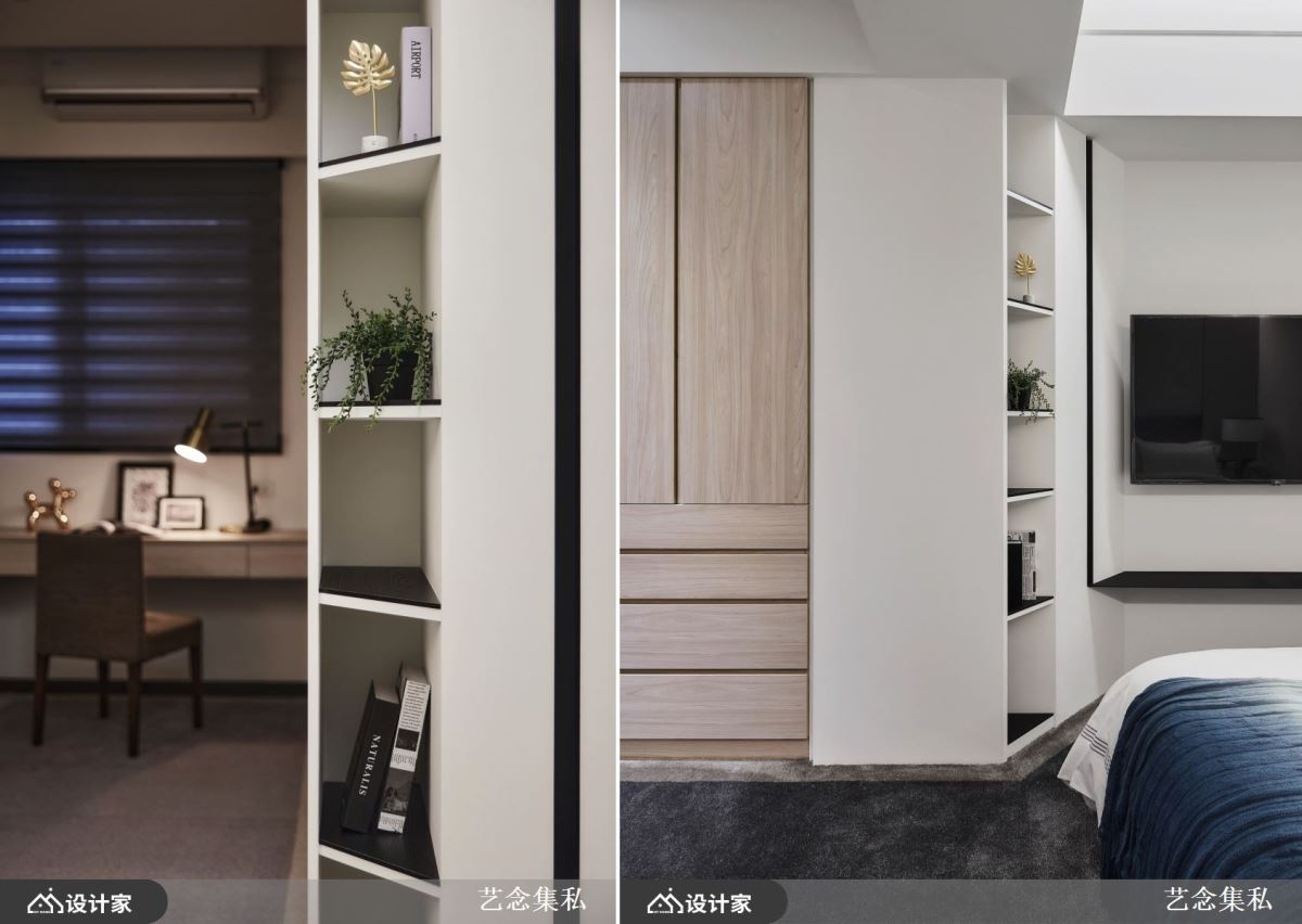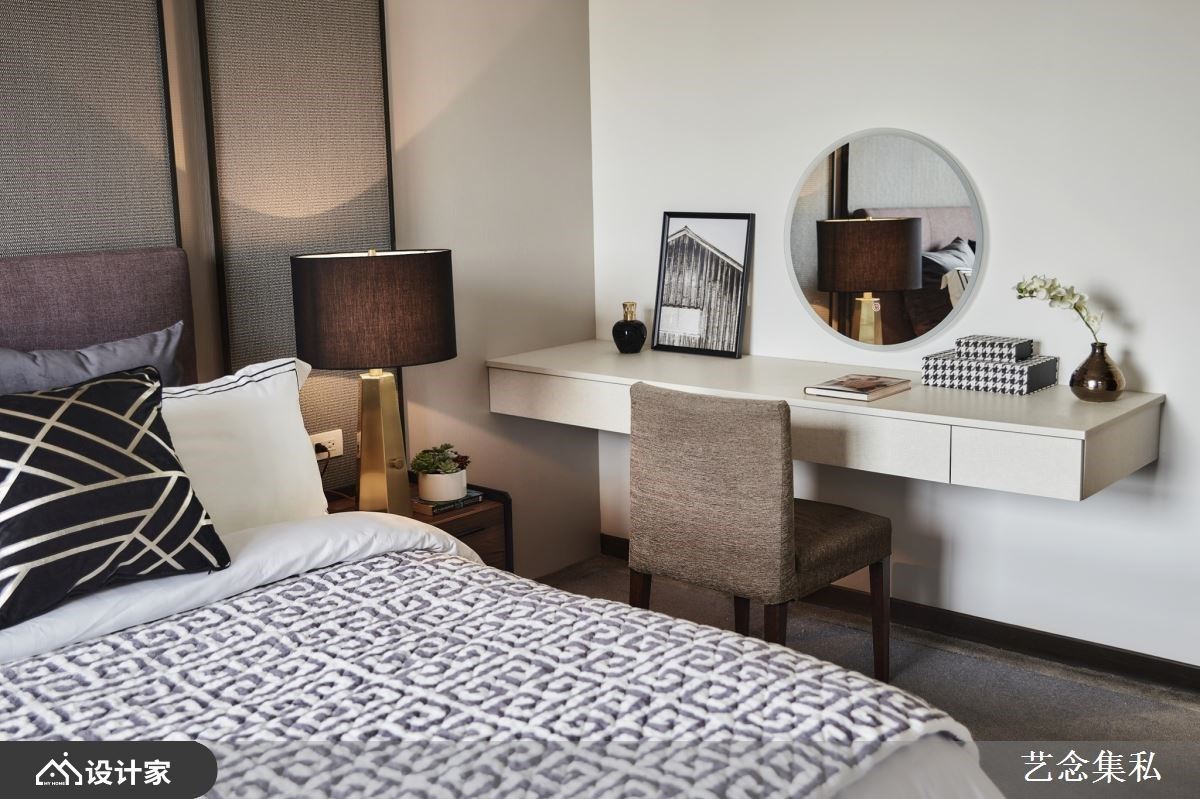宽敞的主卧空间内以绷布结合铁艺皂打造造型床头墙,创造柔软舒适的靠躺设计;利用床铺旁边的结构柱空间设计悬吊式化妆台,几何设计搭配贴墙圆镜展现俐落而优雅的形象。另外,主卧房在床尾还配置了独立更衣间,完美升级使用机能,营造高级精品套房的奢华感受。客房设计上活用墙面打造海量收纳,除了规划大座衣柜,还运用柜墙斜切角设计层板柜收纳,活化畸零空间的运用。