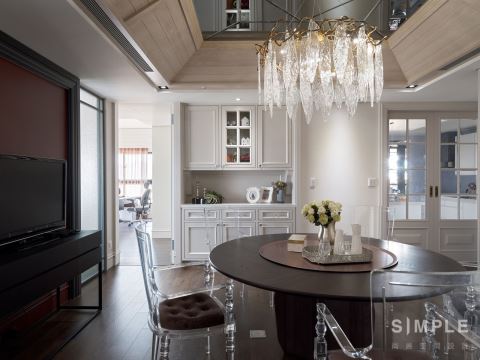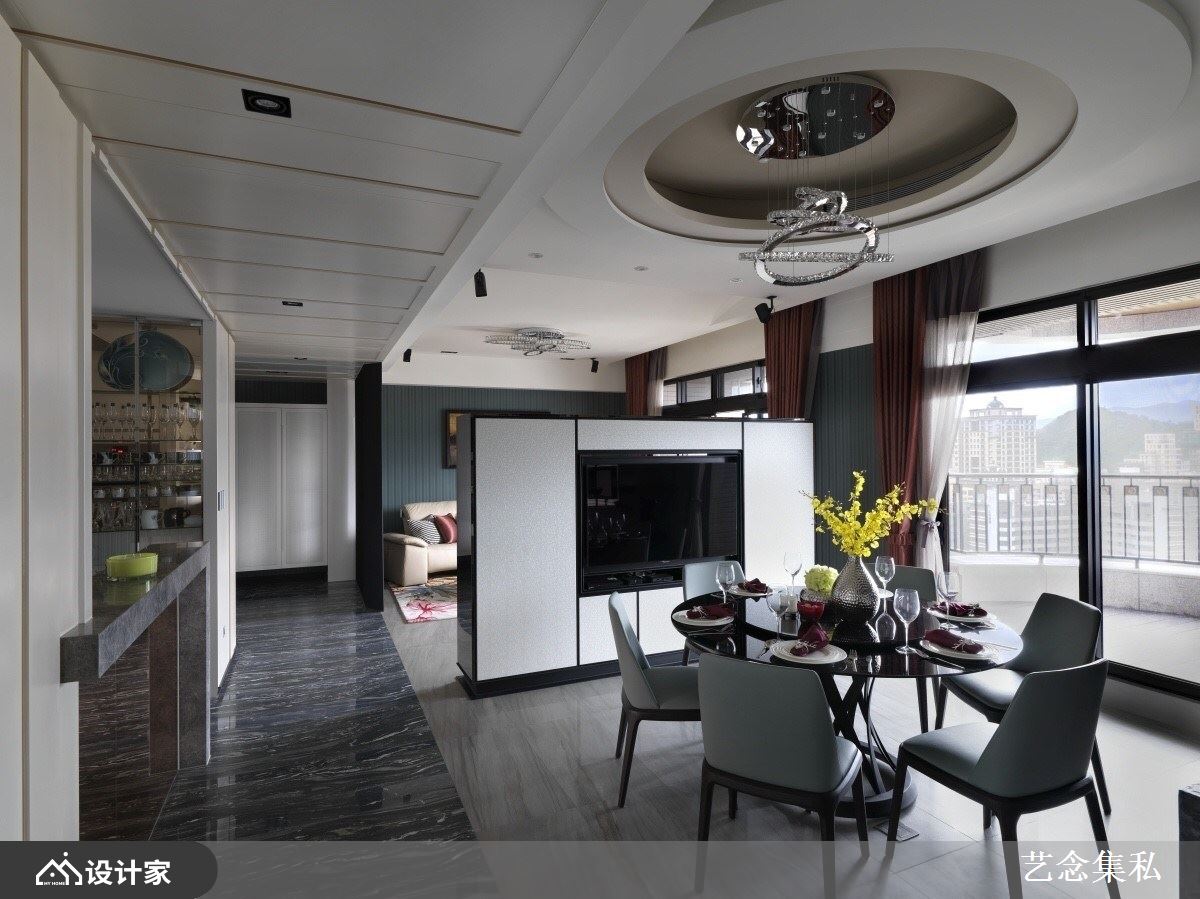 跳脱欧美设计常见的方桌思维,以圆形餐桌作为餐厅的核心,让家人能围绕着圆心面对彼此,用设计拉近人与人之间的距离。艺念集私空间设计张绍华与黄千祝总监能利用原型餐桌创造各种用餐氛围,将餐厅位置规划于电视半墙的后方,双面设计让餐厅也能有电视可以观看;也能规划于沙发后方,不同造型家具能创造不一样的氛围。圆桌的型态可以是正圆或椭圆,材质从大理石、玻璃到石材,搭配布置花艺、摆设餐巾餐盘;更能垂直延伸到天花板圆弧装饰设计,或垂钓的水晶吊灯,诠释别具仪式感的用餐空间。