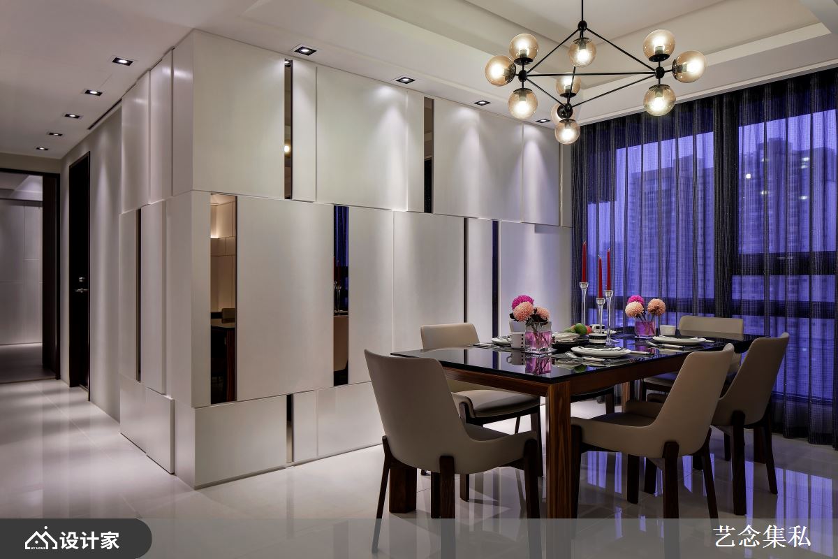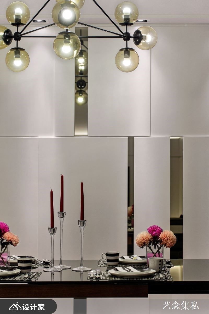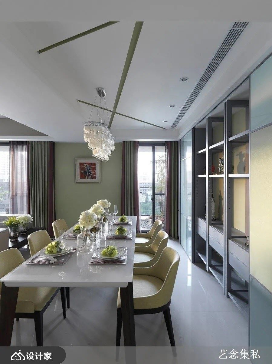 方形餐桌给人简约温馨的氛围,而延展的长型餐桌则让意象带回到欧洲宫廷飨宴的场景。艺念集私空间设计张绍华与黄千祝总监喜欢在空间中以长桌取代方桌,一来能透过餐桌比例调整空间感营造大器感受,另一方面长桌可以容纳更多的成员依同用餐,家庭成员较少也可以拥有更阔做的桌面使用。像是以清新的绿色为主调的住宅,在长桌配置上白色大理石桌配上浅绿色餐椅,皮革质感清新高雅,桌上的花饰也挑选同色系做呼应;而现代感比较强烈的住宅空间,则运用层次与镜面形塑现代感的背墙,搭配典雅的木质调餐桌与大力色皮革餐椅,灯饰配置也从水晶吊灯换成了铁件设计灯饰,演绎别致的用餐氛围。