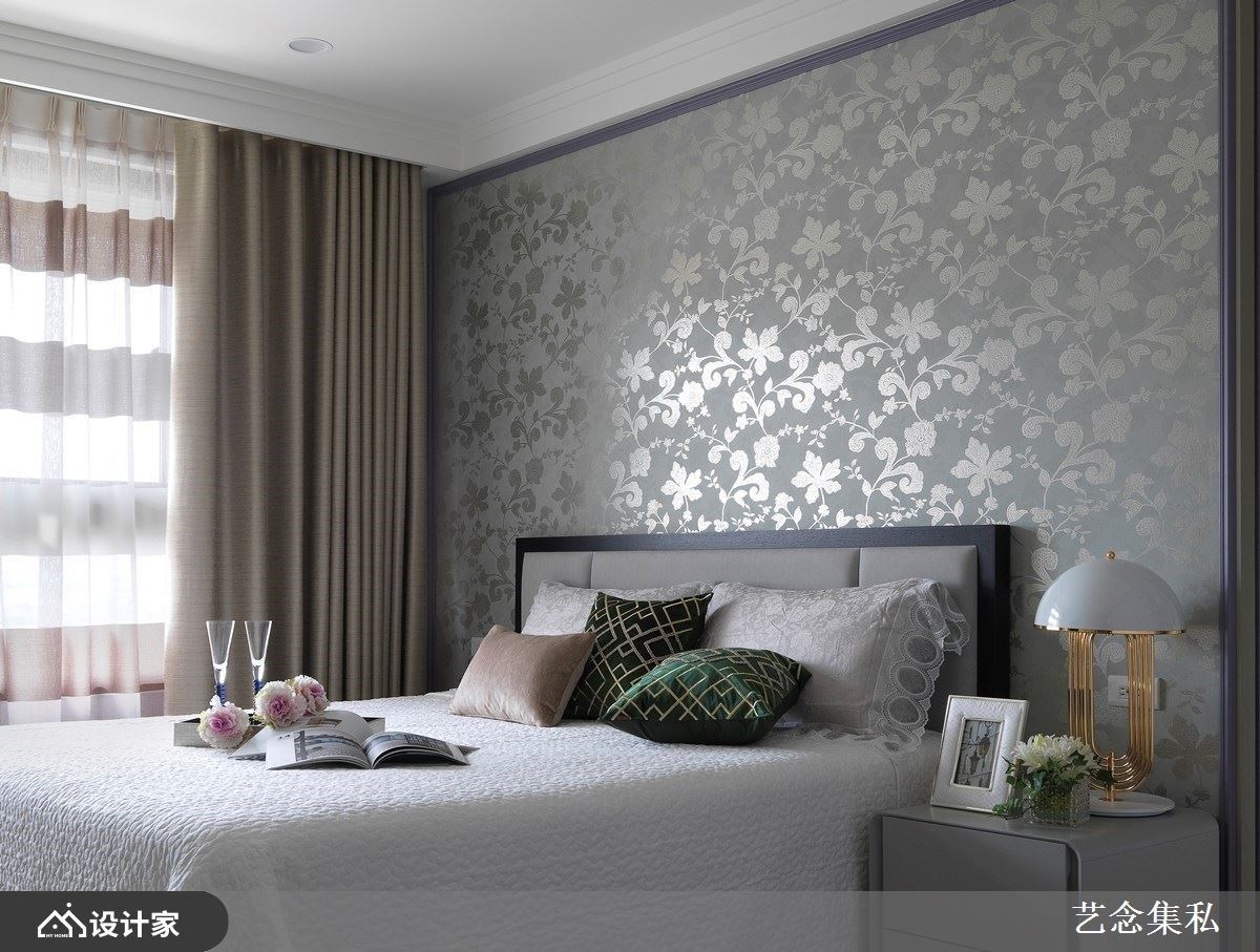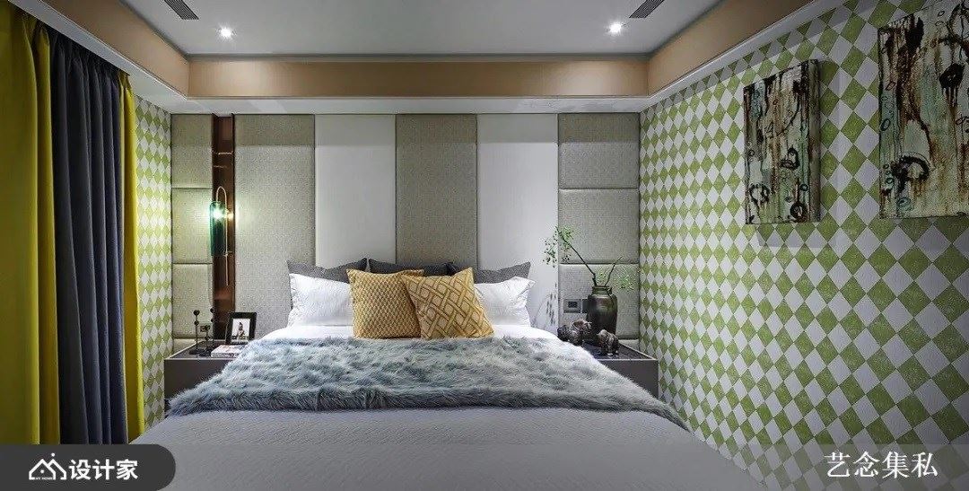 寝室风格与色彩喜好因人而异,但总有些元素是每个人看到都会产生放松的感受,好比自然界常见的树木山林与碧海天蓝。艺念集私空间设计张绍华与黄千祝总监汲取自然界最常见的色调,搭配几何造型将杂乱的构图化繁为简,像是运用草绿菱格纹墙纸搭配茶色绷布丰富立面表情;将饱和度调降的莫兰迪灰绿以更丰富的几何变化作为床头装饰;更能带入金属元素的饰板与典雅的雕花呈现优雅的寝居风格。透过将自然的色调与形体移植到寝居空间后能在适度呈现私领域的个性,同时保有睡眠时所需的自在氛围。